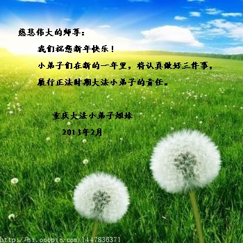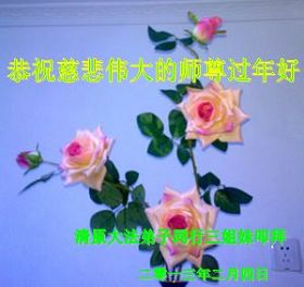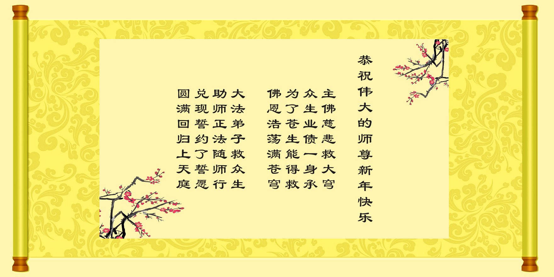 新春佳节,弟子想念师父,跪拜师父!我们知道师父的心愿是要把我们度成,要让更多的众生得救,师父的一切都是为了我们!为了众生!师父为我们弟子和众生承受的太多太多了。我们就只有修好自己,多救人,才能让师父高兴。新的春天开始了,我们一定要做好师父要我们做的一切,珍惜师父留给我们的每一天,整体配合好,让更多的人来看神韵,让更多的人明白真相得救!