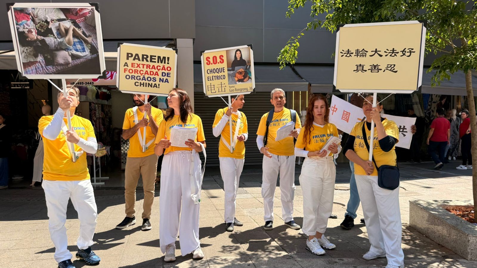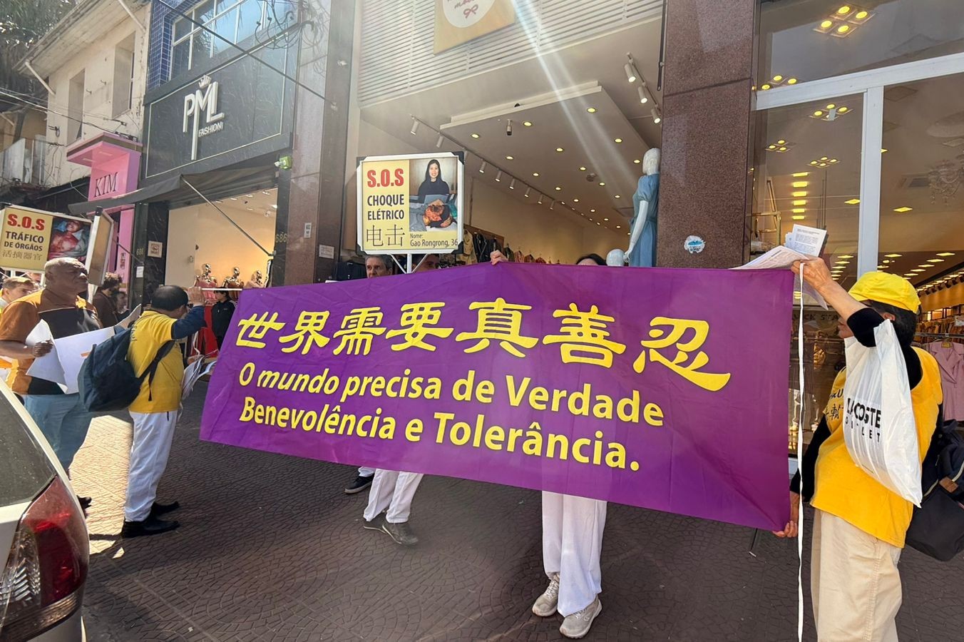 当天,法轮功学员拉着横幅或举着真相展板,放着《法轮大法好》的音乐,沿路游行和讲真相,发资料;同时还有真相广播汽车,也在整个区域缓缓行驶,播放着中文和葡文的真相广播,让民众听到和看到真相,了解法轮功是什么,以及中共对法轮功的打压和迫害。