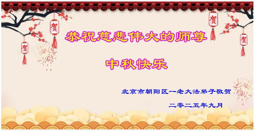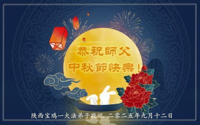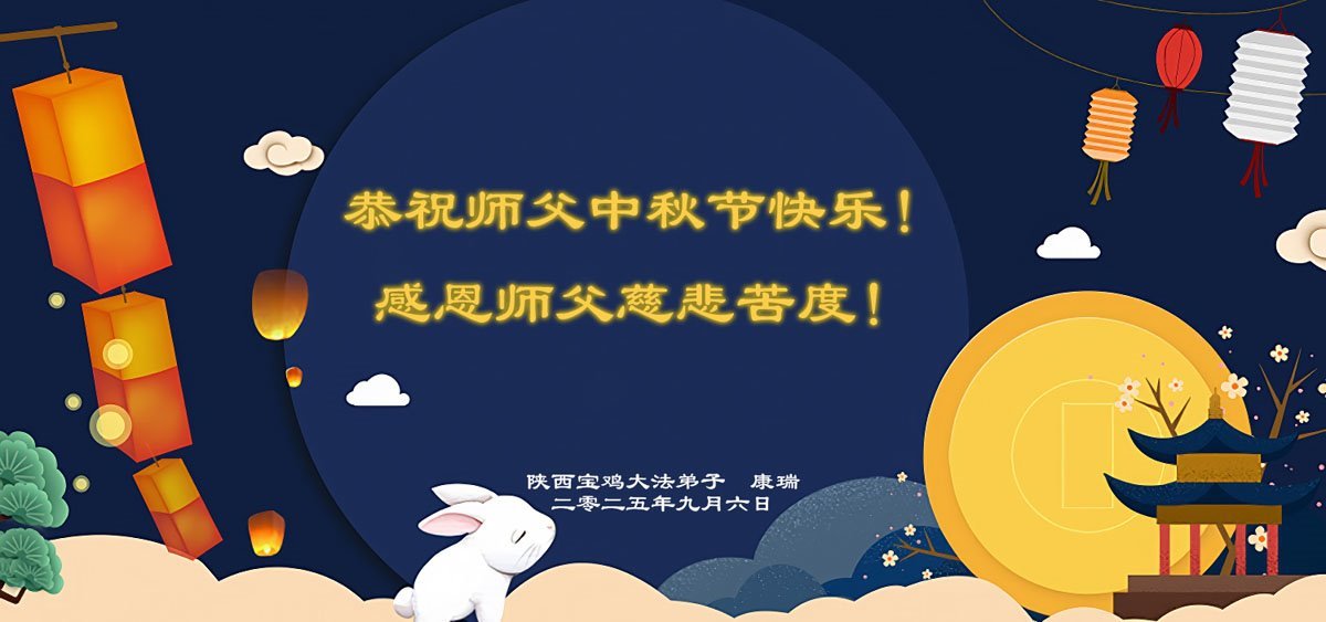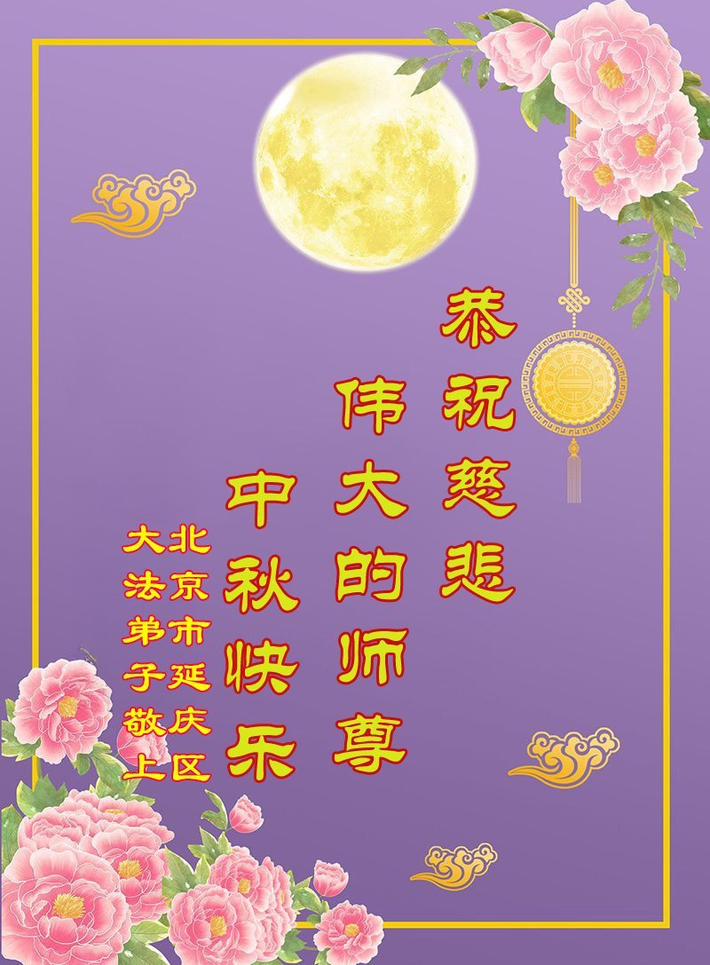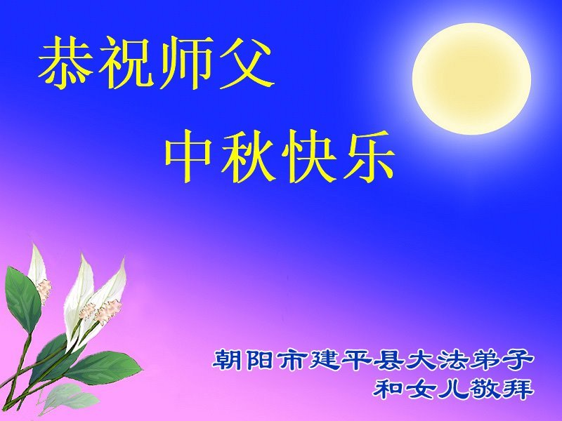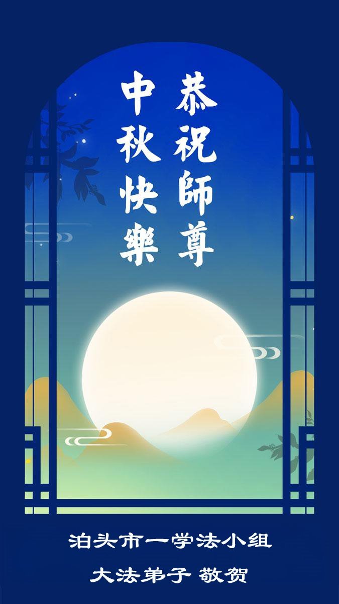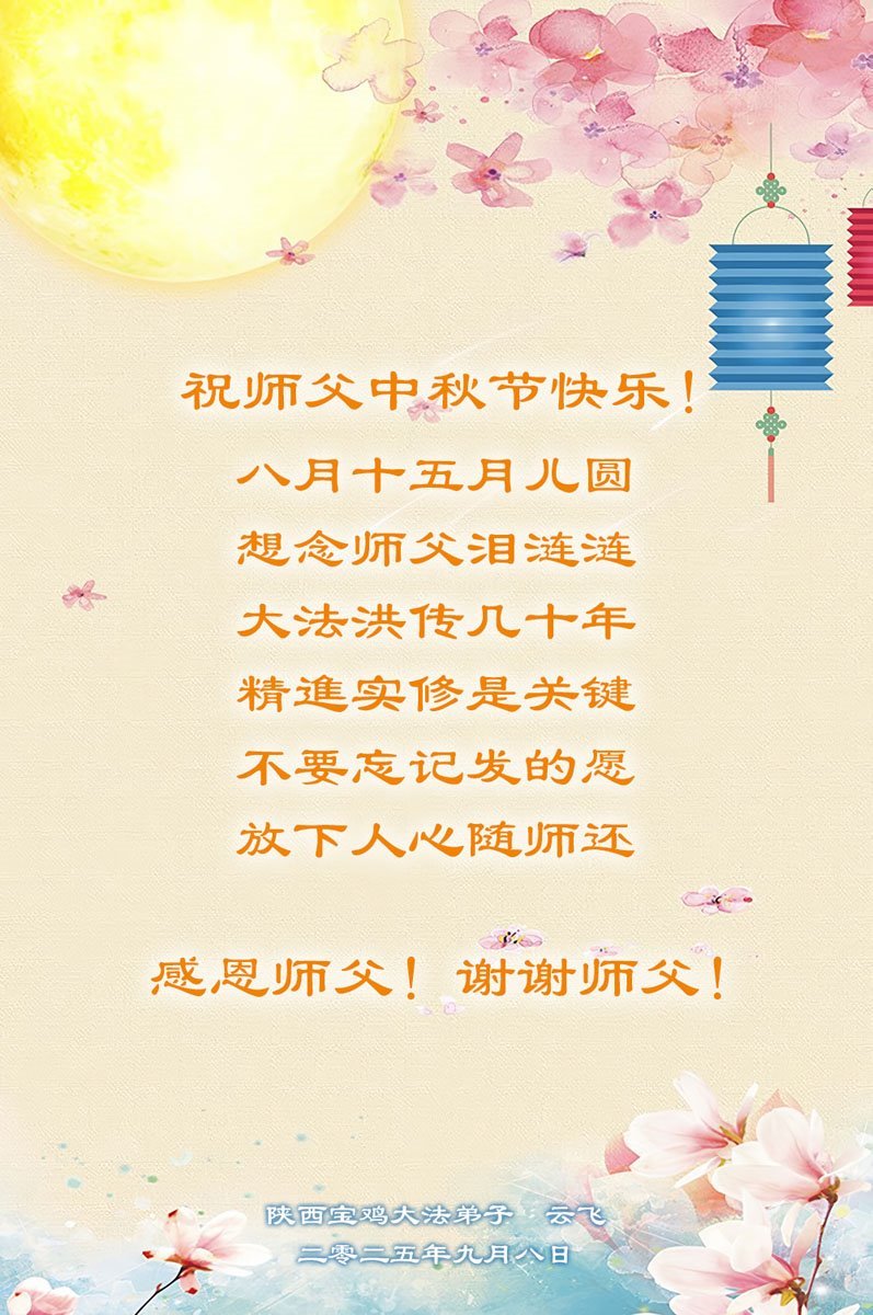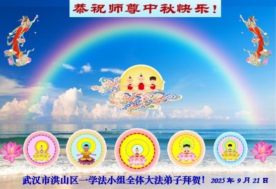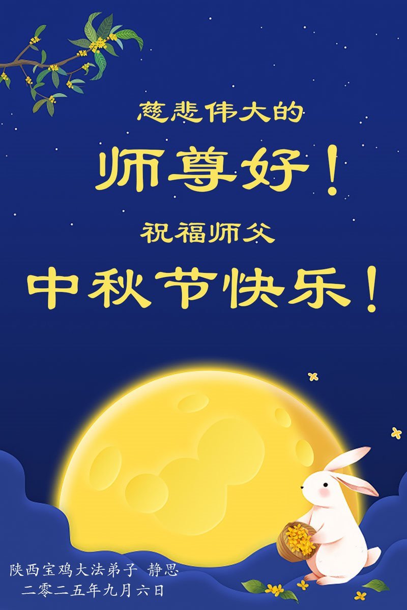 一年一度的中秋团圆佳节已来临,弟子在大洋彼岸向师尊问好。我们已经感觉到与师尊团聚的时间为期不远了。虽然盼望与师父早日团聚,但是大法弟子的使命是重要的。因此,在这最后的时刻,弟子一定抓紧时间做好三件事,完成自己的历史使命,圆满随师还。