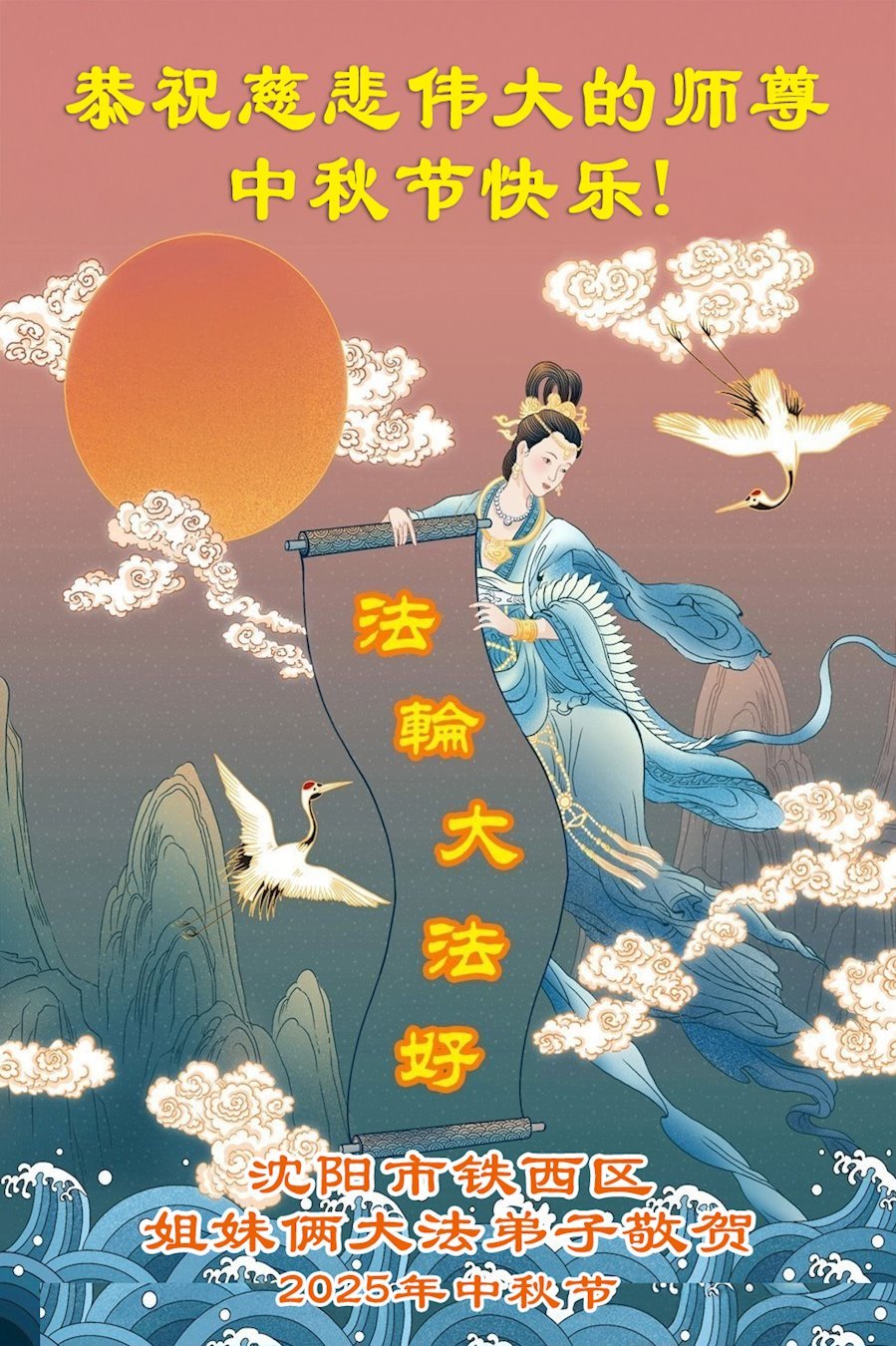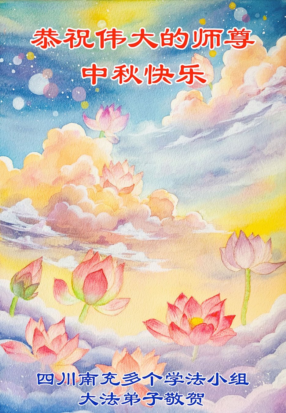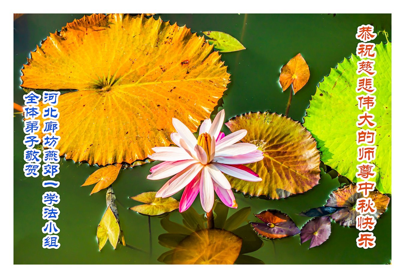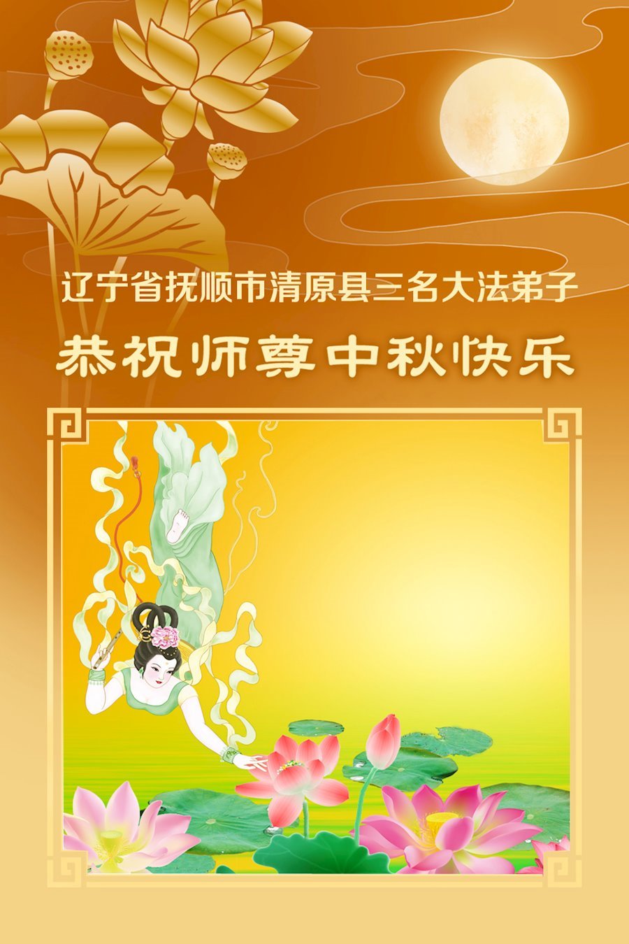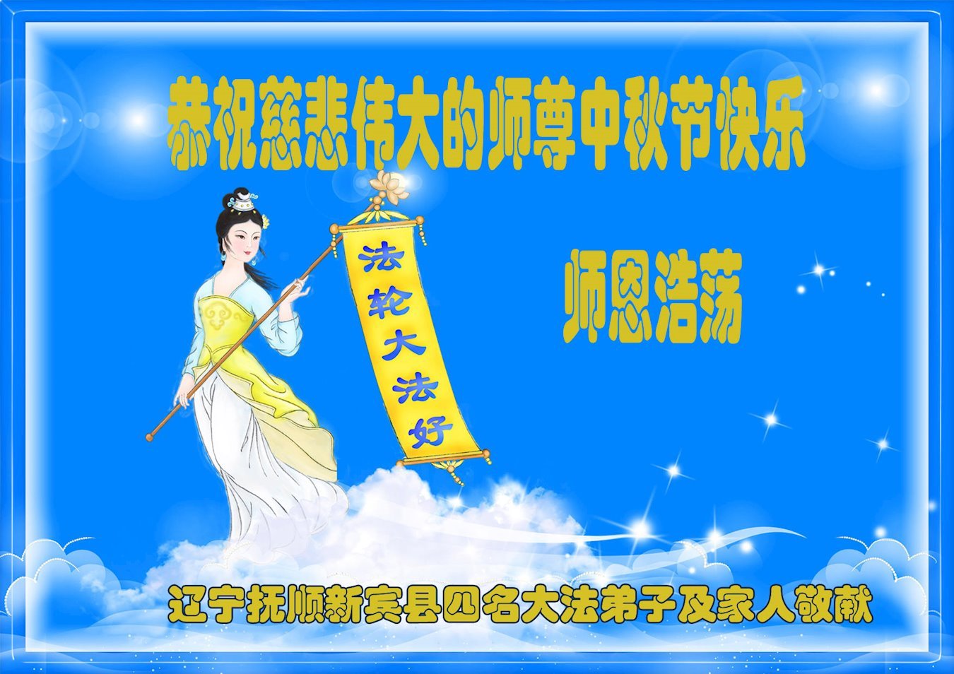 在这秋高气爽,明月高悬之时,我们大陆辽宁省辽阳市一学法小组怀着对师尊的感恩,怀着对正法必成的信念,怀着救度众生的史前大愿,决心一定不辱使命,放下人心,努力配合,助师正法,救度众生,在最后有限的正法时间里,做的更好,圆满随师还。