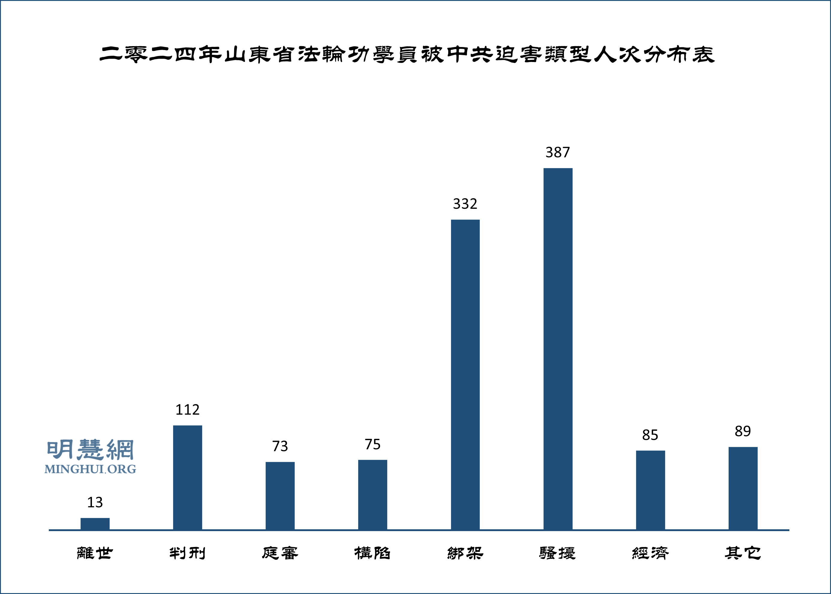 【明慧网二零二五年十月七日】(明慧网通讯员综合报道)据明慧网数据统计,二零二四年山东省法轮功学员被中共用各种手段迫害总计1166人次。其中含冤离世13人;被非法判刑迫害112人;被非法庭审73人次;被司法构陷75人次;被非法绑架332人次;被非法骚扰387人次;被经济迫害85人次,抢劫、勒索总资金超过1003420.52元;其它各种迫害89人次。