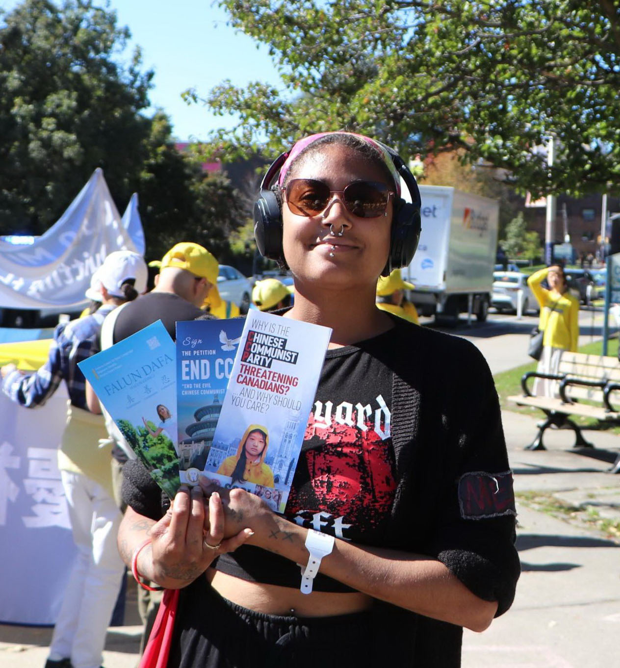 在游行队伍准备出发时,法蒂玛(Fatima)正好路过,在与学员的交流中她了解到了中共迫害法轮功学员的罪行。她表示自己完全反对中共活摘法轮功学员器官,以及跨国镇压海外法轮功学员。“加拿大是自由的国度,不可以发生威胁加拿大民众的事情。”她认为中共威胁神韵艺术团的演出,是因为演出中揭露了中共迫害法轮功学员的真相。她还表示自己要在请愿书上签字,呼吁加拿大政府制止中共的跨国镇压行径。