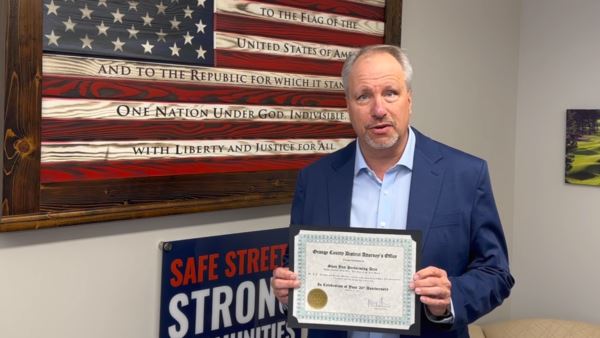 地区检察官大卫·胡弗勒在视频中说:“大家好,我是橙县地区检察官大卫·胡弗勒,在此向大家致上诚挚的新年祝福。今年是火马年,同时也是神韵艺术团成立二十周年。我衷心感谢神韵艺术团二十年来所取得的卓越成就,感谢你们在世界各地呈现的一场场精彩演出。