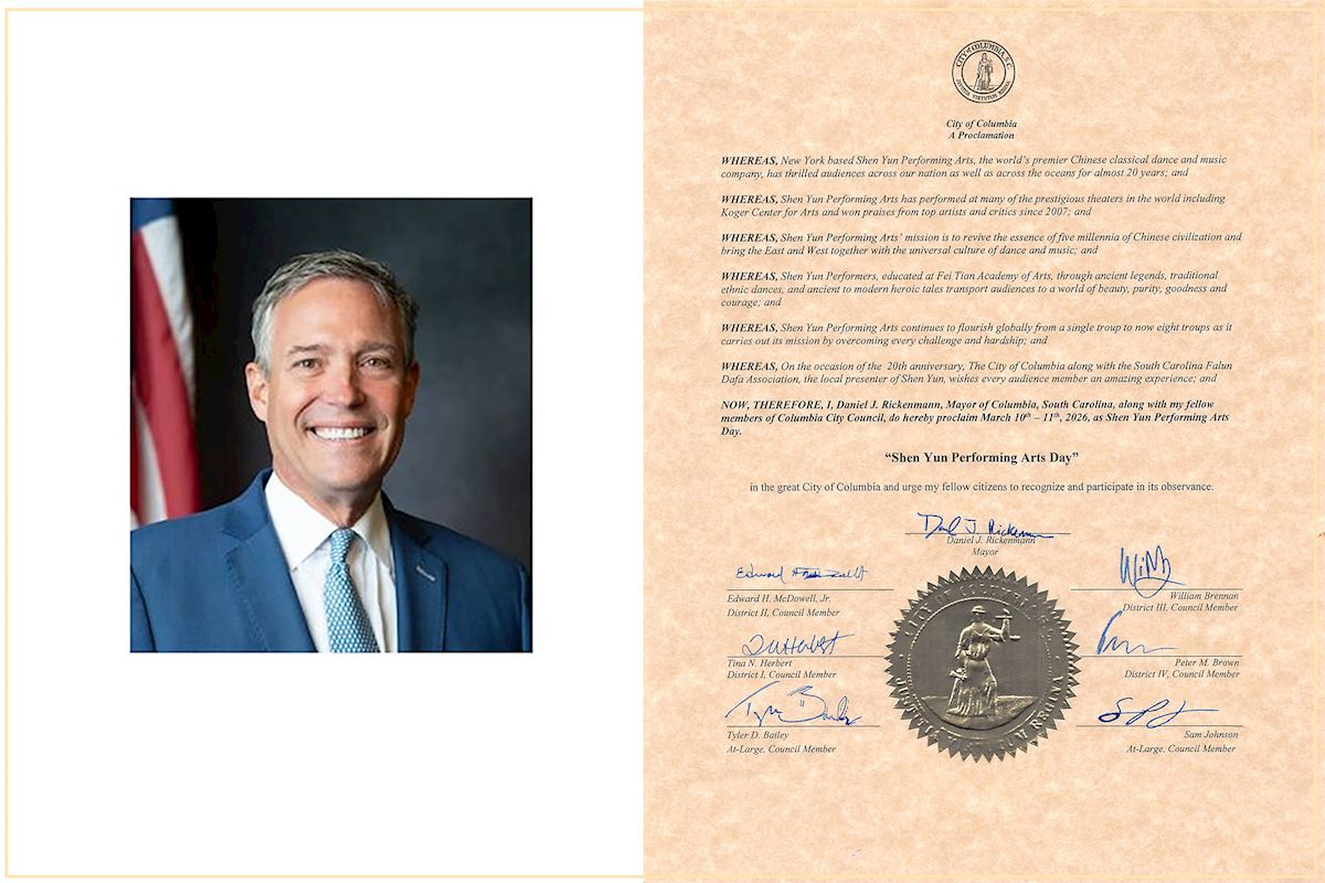 市长瑞肯曼在褒奖状中写道:“值此神韵演出二十周年之际,哥伦比亚市与神韵当地演出单位南卡罗来纳州法轮大法协会,祝福每位观众都能获得难忘的体验。因此,我,南卡罗来纳州哥伦比亚市长瑞肯曼与市议会的其他成员一起,特此宣布二零二六年三月十日至十一日为神韵艺术团日。”