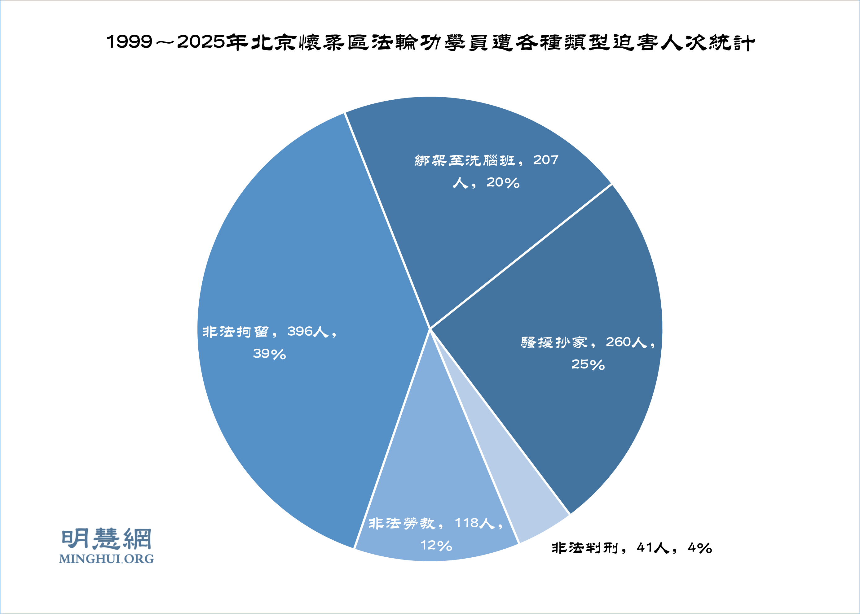 ![]() 图3:1999~2025年北京怀柔区法轮功学员遭各种类型迫害人次统计 |