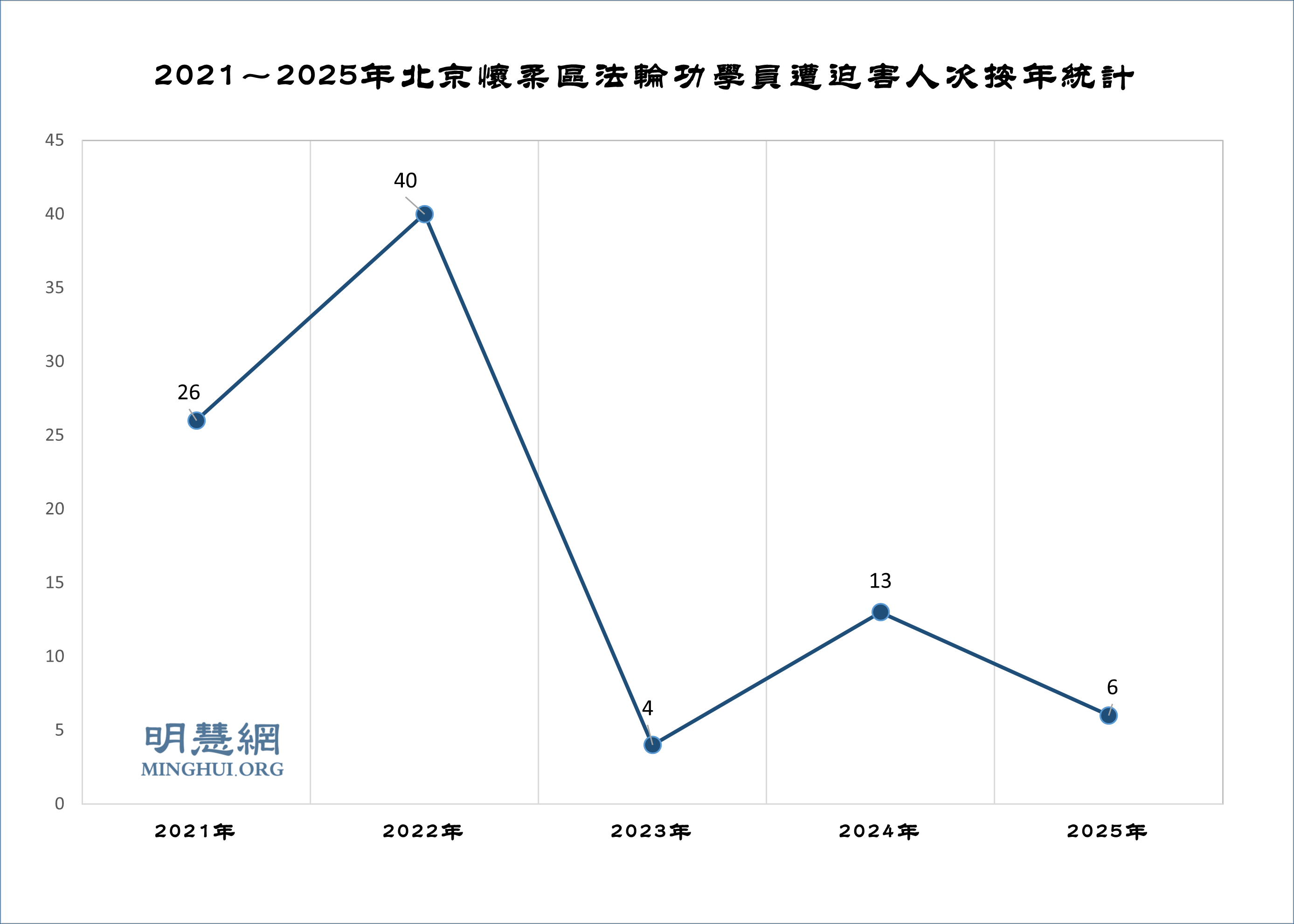 ![]() 图4:2021~2025年北京怀柔区法轮功学员遭迫害人次按年统计 |
