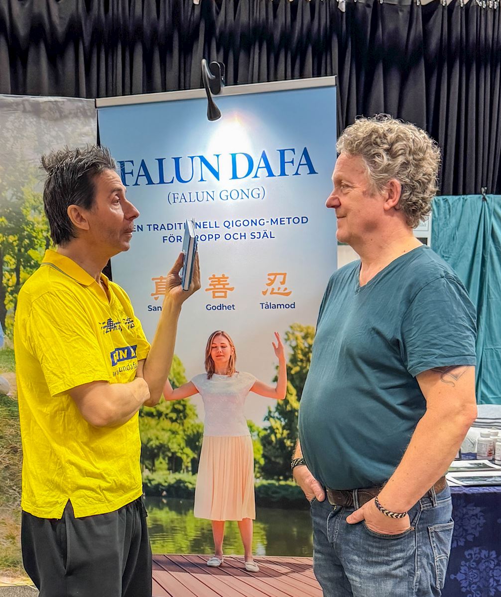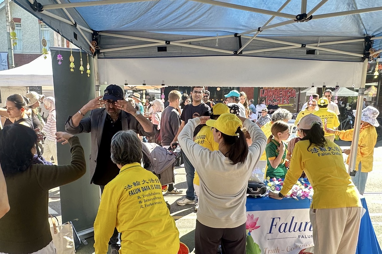 霍桑当地居民、律师尼克(Nick G)二十年前就听说法轮功,并通过阅读《大纪元时报》开始关注法轮功反迫害的讯息。当天,看到法轮功展位后,和学员进行了长时间交谈,并现场学炼功法。