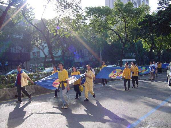 游行队伍从中正纪念堂出发,沿着信义路、新生南路绕到忠孝东路,沿途只听见马路上汽车喇叭和引擎声,在法轮功的队伍中只听见练功音乐,鲜少有人交谈。