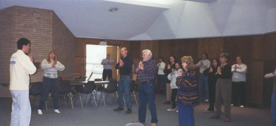 在专题报告的最后,有三个来自合恩罗厄地区的法轮功修炼者上台演示了主要的功法,报告人吴先生进行了解说。