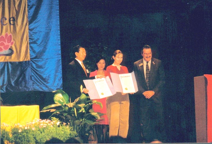 法轮功学员对于市政府的支持表示了感谢,并表示会尽力将真善忍带给所在城市的人民。詹姆斯.伯纳特先生颁发了两项褒奖--2001年12月29日至2002年1月4日为法轮大法周,及法会的两天2001年12月29日和30日为李洪志日。在褒奖状中詹姆斯.伯纳特先生特别赞扬了法轮功学员在反抗中国江泽民政府的邪恶镇压中所表现出的大善大忍。