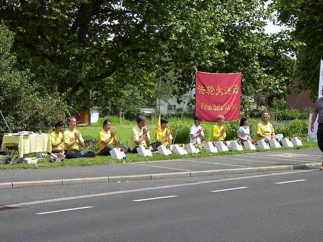 【明慧网2002年7月25日】七月十九日开始到二十一日德国大法弟子在Bonn-Bad Godesberg的中国领馆前进行了五十二小时的静坐。这天天气非常好,几乎没有一点风。我们每小时发一次正念,使已经十分衰弱的邪恶势力更加衰弱了。大量的横幅和展板将我们的信息清楚地传达给了所有开车经过这里的人和过路人:“江泽民集团停止对真、善、忍的迫害”、“法轮大法好”。