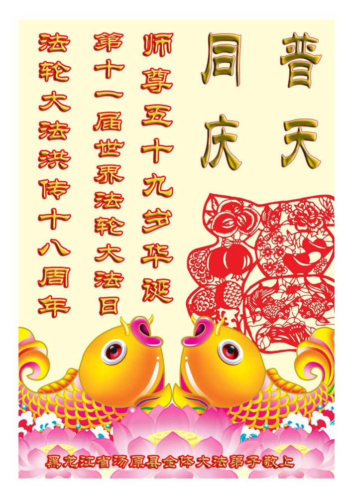 即将迎来师尊的五十九岁华诞和第十一届法轮大法日以及法轮大法洪传十八周年之际,秦皇岛市三区四县全体大法弟子衷心祝愿师尊生日快乐!同时更加精進修好自己,救度更多的众生,努力完成好自己的来世大愿。让师父少一些操劳,多一份安慰。