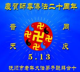 在这普天同庆法轮大法二十周年及世界法轮大法日的美好日子里,我们夫妻大法弟子一定要学好法,做好三件事,决不辜负师尊的慈悲苦度。