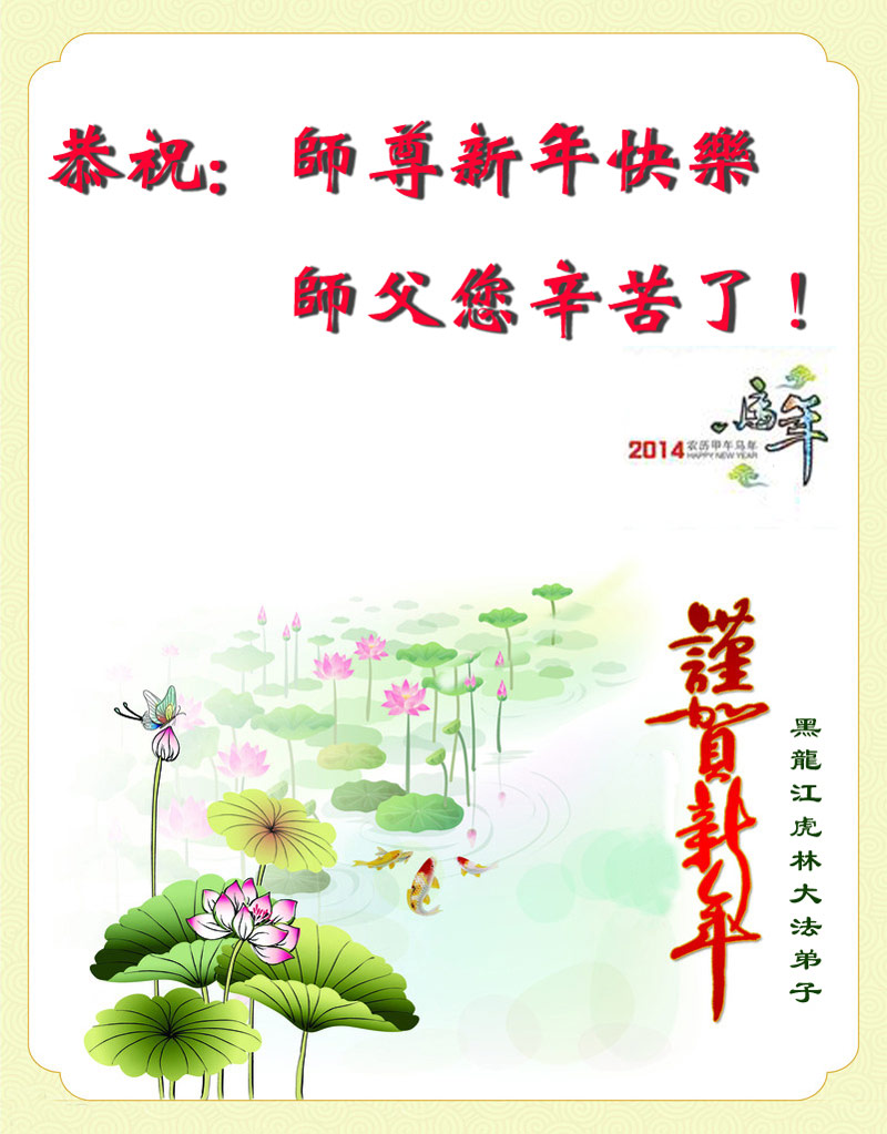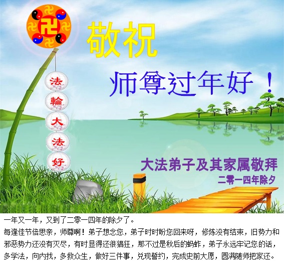【明慧网二零一四年二月四日】(明慧记者荷雨/肖妍综合报道)传统新年是华夏儿女阖家团聚、辞旧迎新,表达对天地的敬畏、感恩和诚敬的最隆重节日。如往年一样,在甲午新年来临之际,发自肺腑的感恩与问候如雪片般地汇向明慧网,不仅来自五洲四海、各行各业的法轮功学员向恩师拜年,越来越多明白真相、受到法轮大法福佑的各界民众也纷纷冲破中共的重重封锁,向法轮功创始人李洪志先生寄上诚挚的感恩和颂扬,期盼他早日重归故国,福泽神州。