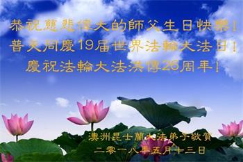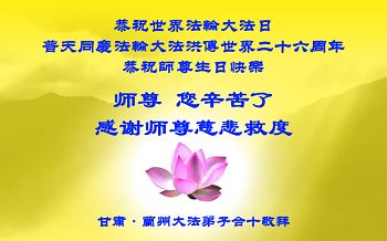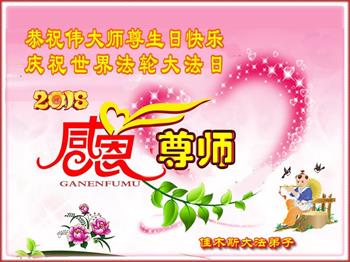 在这个特殊的日子里,天上人间,普天同庆,海外的法轮大法弟子给师父发来贺词,恭祝师父六十七岁华诞,恭贺师父传法二十六周年,同贺世界法轮大法日!