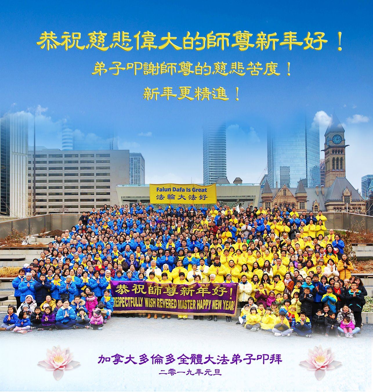二零一九年新年到来之际,明慧网收到了来自世界五十余国持之以恒传播真相的大法弟子们,给师父发来的新年贺信,恭祝师父新年快乐!世界各地法轮功学员表示要以更纯净的心态修炼、证实法,支持和帮助中国大陆同修反迫害。并表示在新的一年中继续添正念,多救人。逆流而上,勇猛精進。