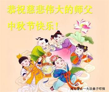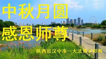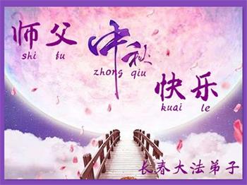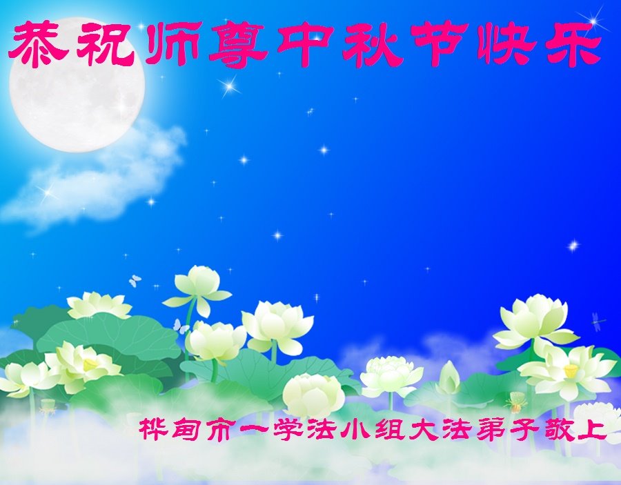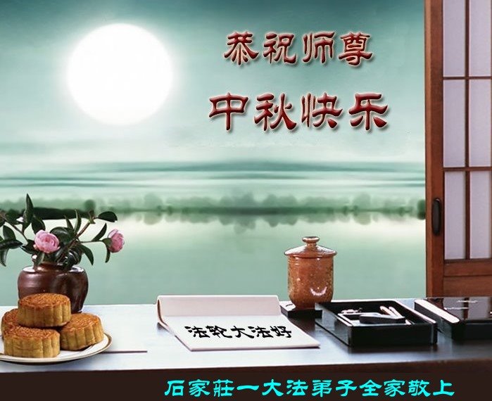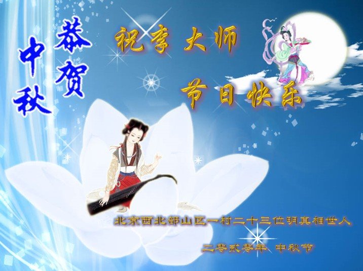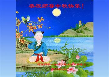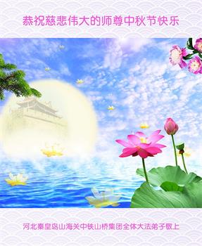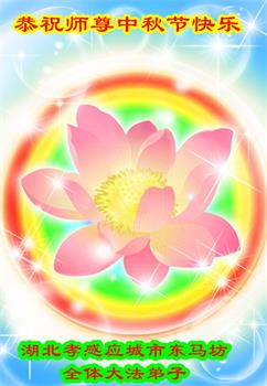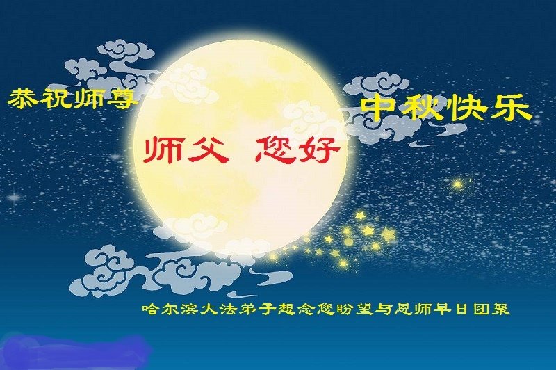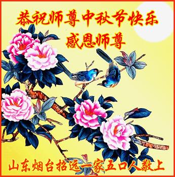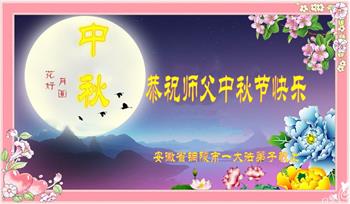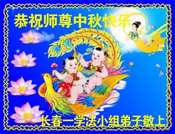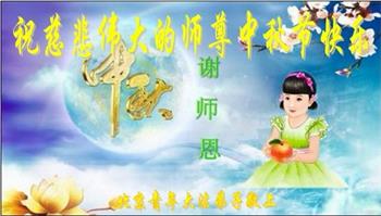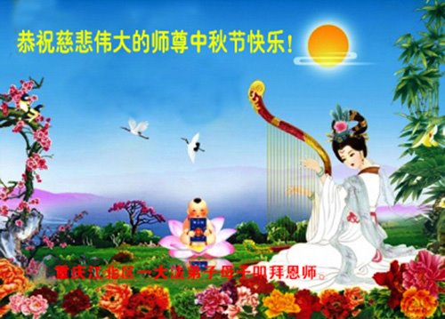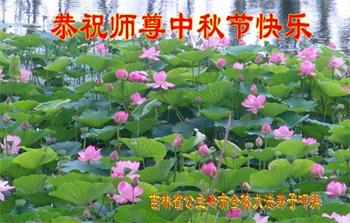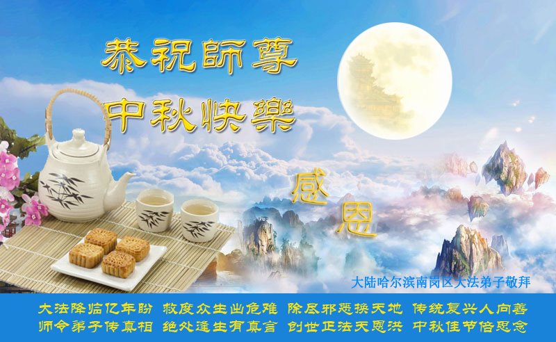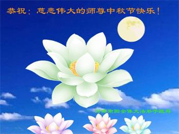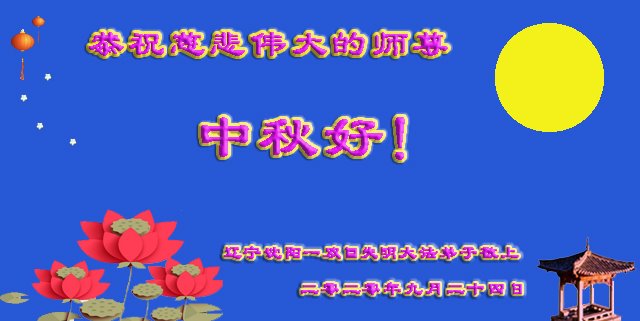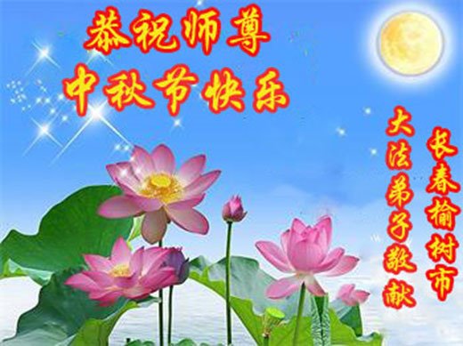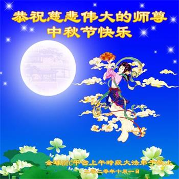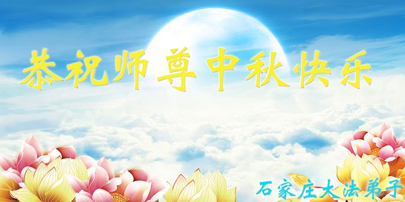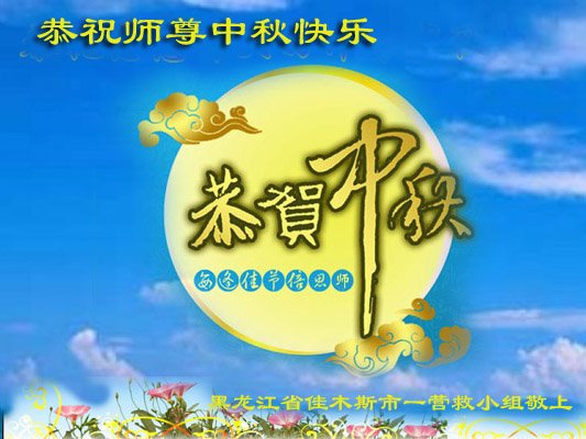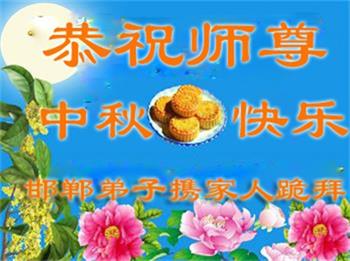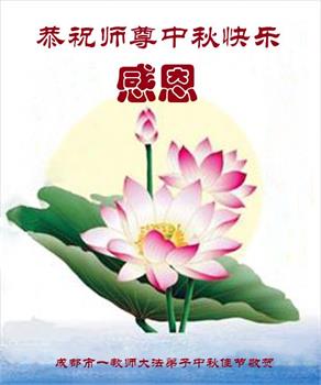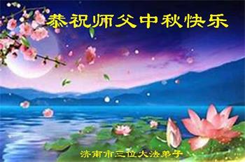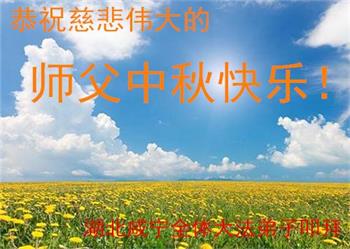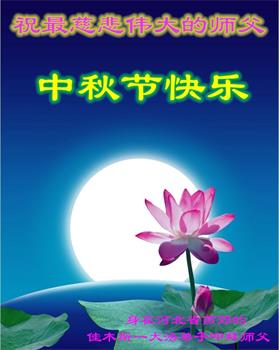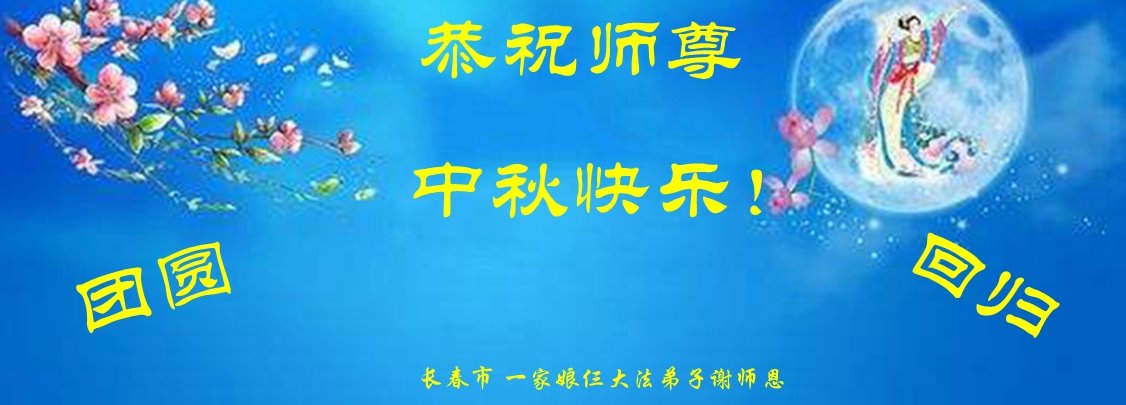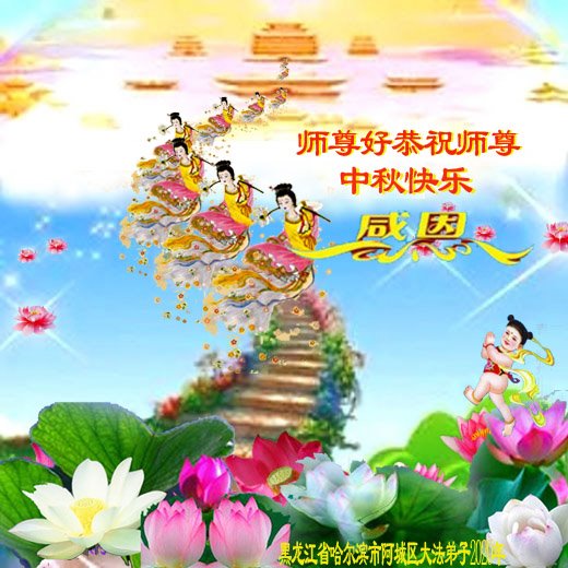 慈悲伟大的师尊您好!中秋节快乐!中铁第十一工程局的全体大法弟子远在中国大陆在中秋节前夕,弟子们向您献上无限的敬仰和感激之心!弟子们修炼二十多年了,我们一定继续坚持实修,抓紧这最后的、可贵的、亘古难遇的宇宙更新的大好时机,一如既往的、精進的做好师尊要求的“三件事”,净心多学法、净心多发正念,去掉弟子们各自的各种执着心,从而慈悲的讲清真相,多多的救下世上还存有善念的世人。