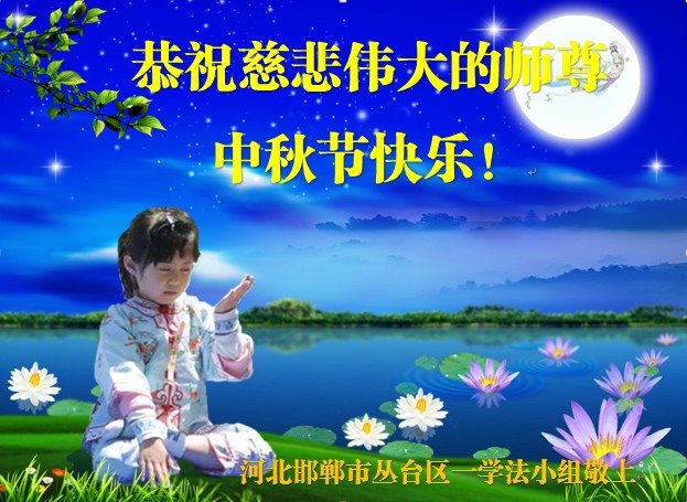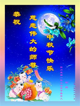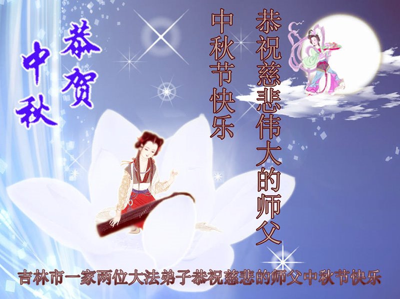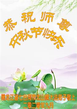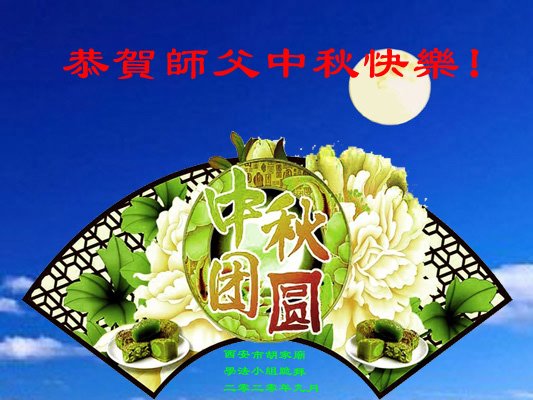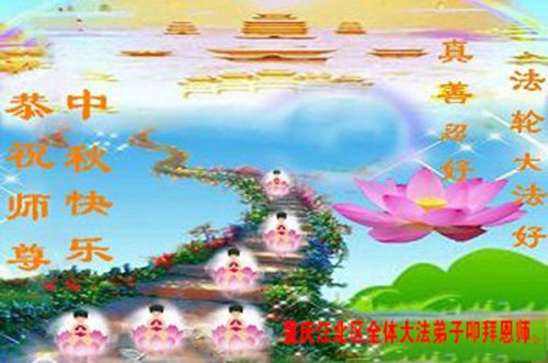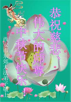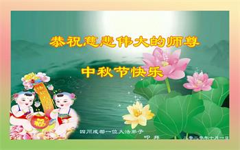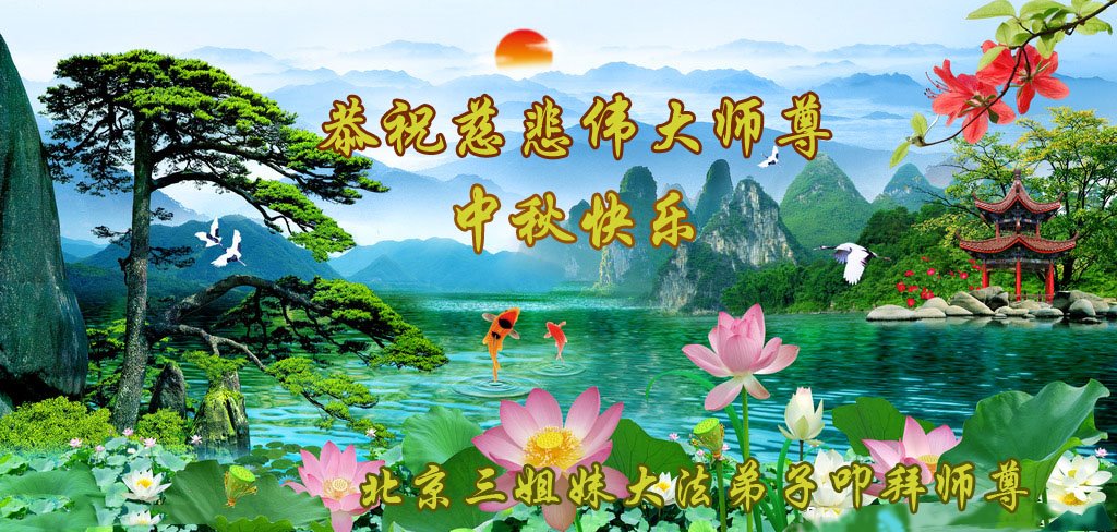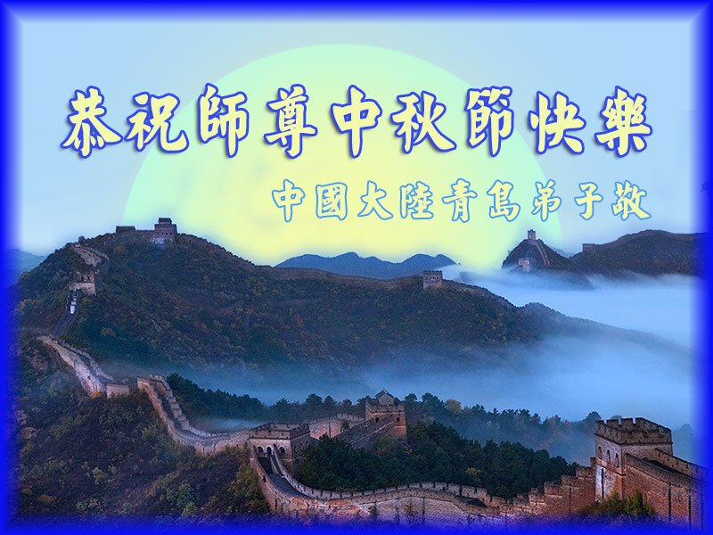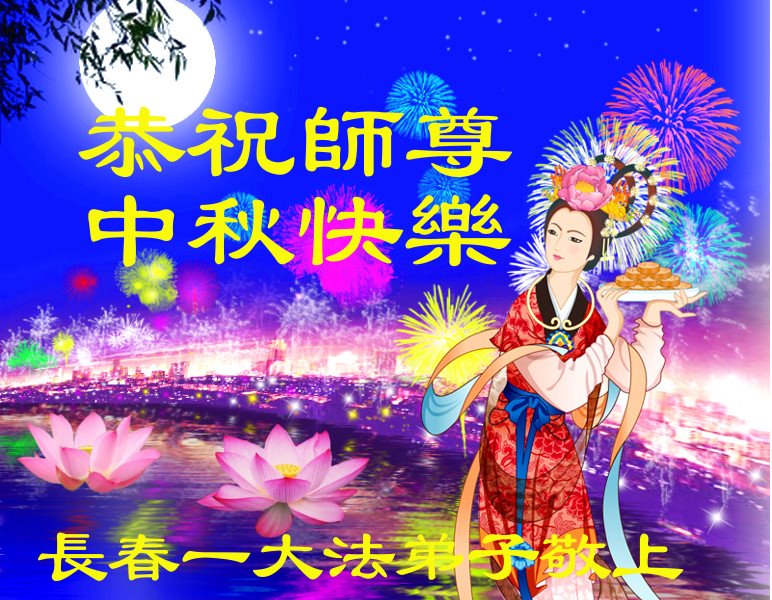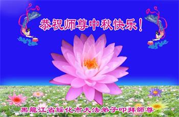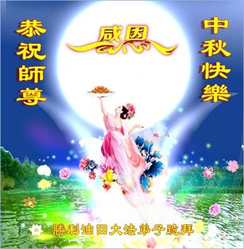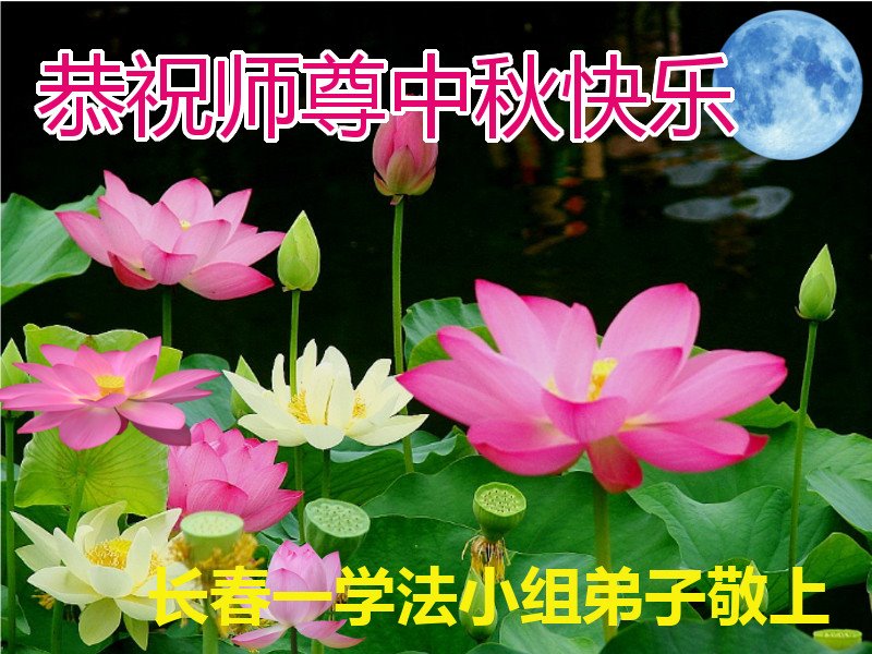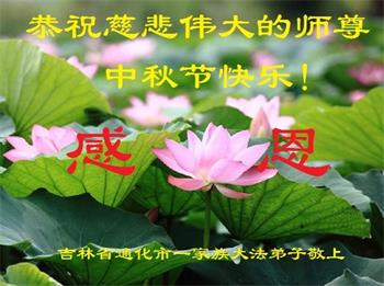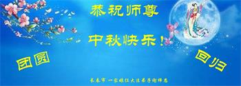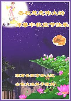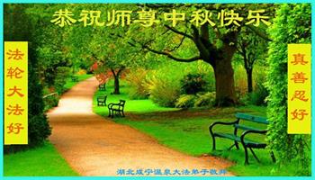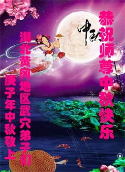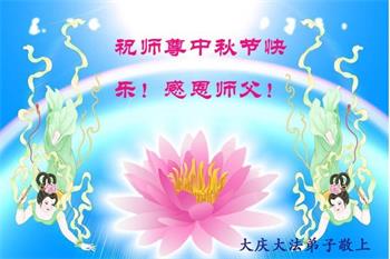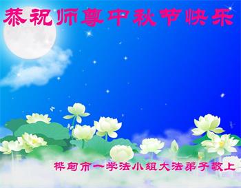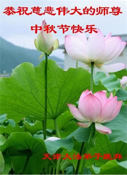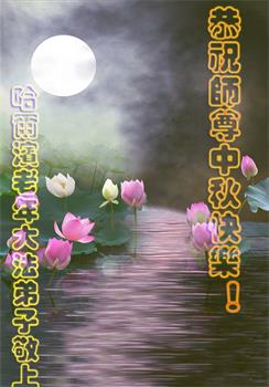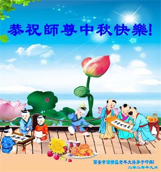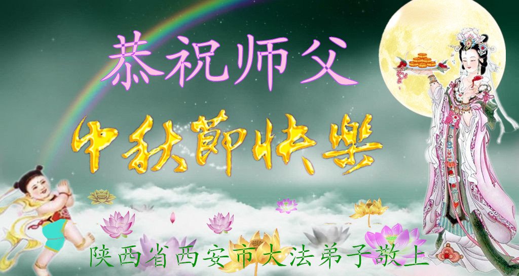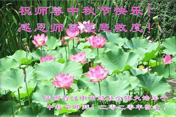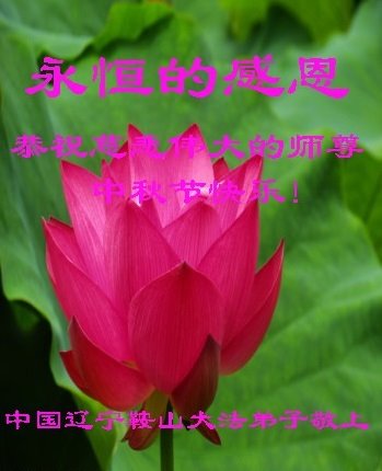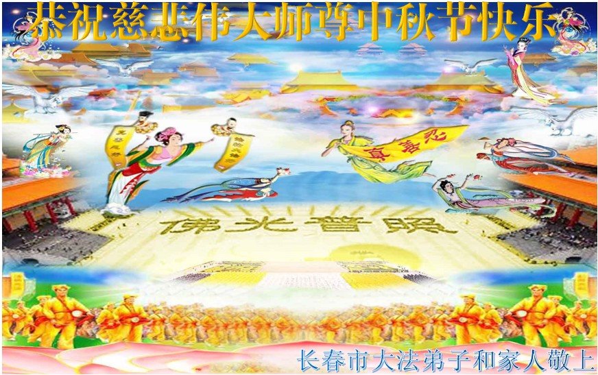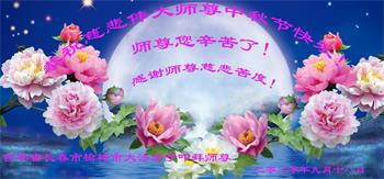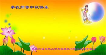 慈悲伟大的师尊您好!中秋节快乐!中铁第十一工程局的全体大法弟子远在中国大陆在中秋节前夕,弟子们向您献上无限的敬仰和感激之心!弟子们修炼二十多年了,我们一定继续坚持实修,抓紧这最后的、可贵的、亘古难遇的宇宙更新的大好时机,一如既往的、精進的做好师尊要求的“三件事”,净心多学法、净心多发正念,去掉弟子们各自的各种执着心,从而慈悲的讲清真相,多多的救下世上还存有善念的世人。