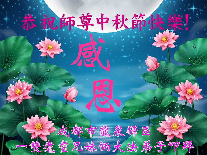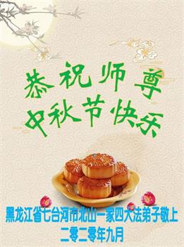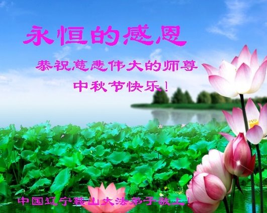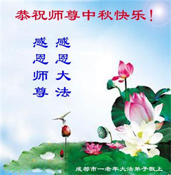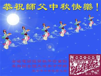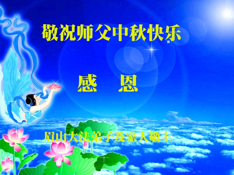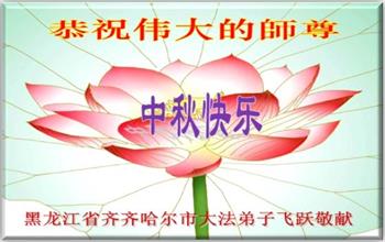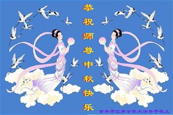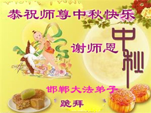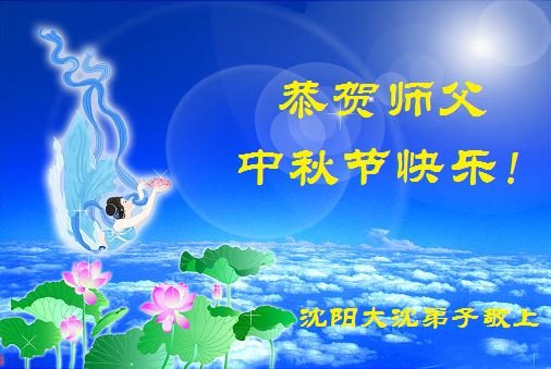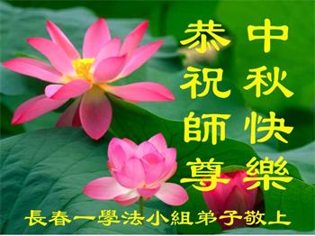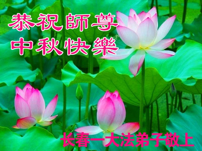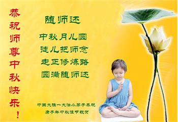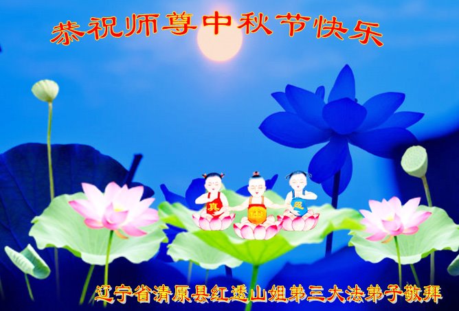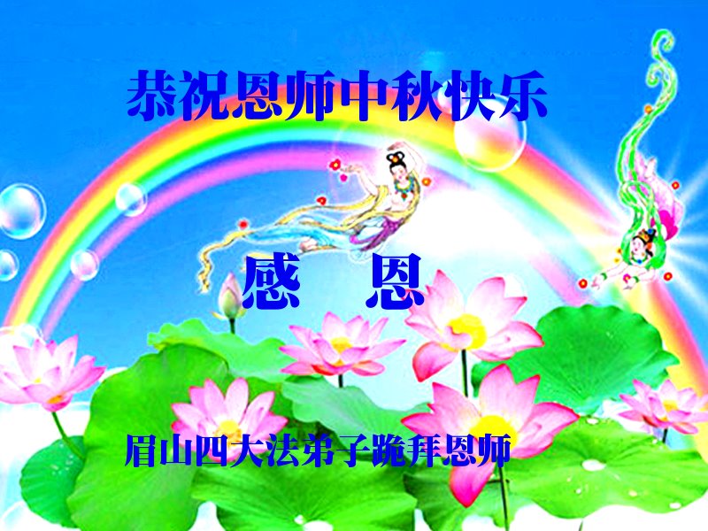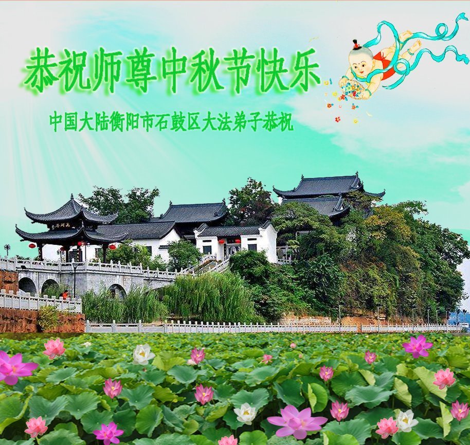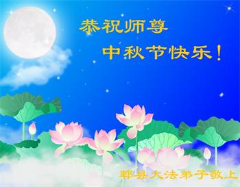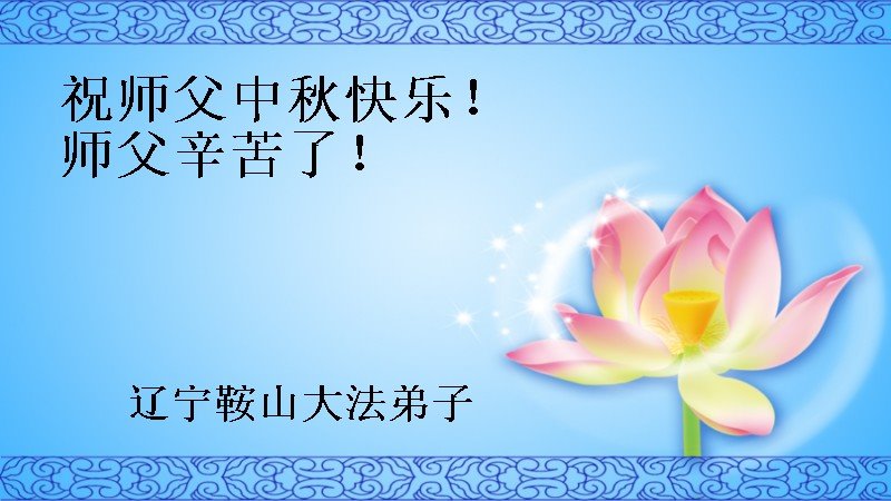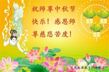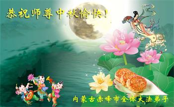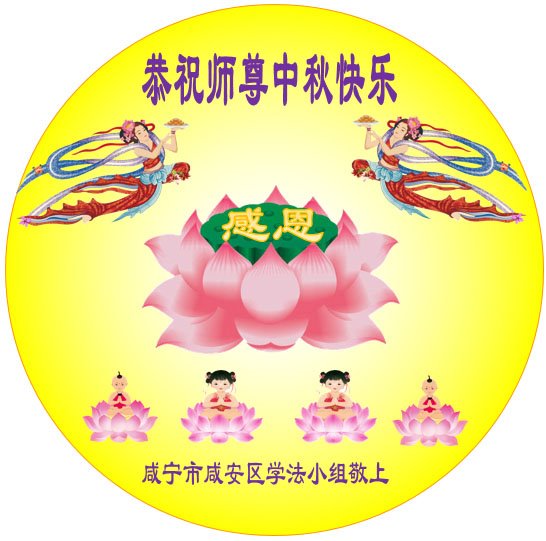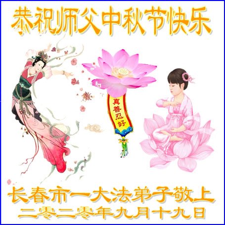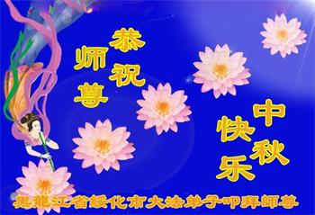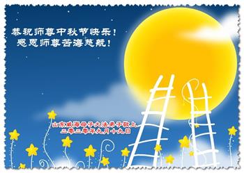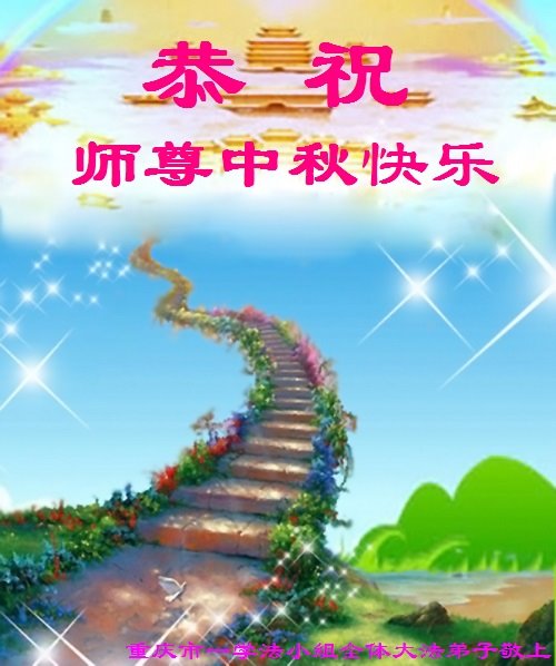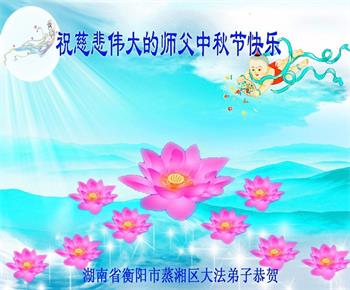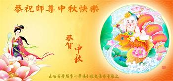 慈悲伟大的师尊您好!中秋节快乐!中铁第十一工程局的全体大法弟子远在中国大陆在中秋节前夕,弟子们向您献上无限的敬仰和感激之心!弟子们修炼二十多年了,我们一定继续坚持实修,抓紧这最后的、可贵的、亘古难遇的宇宙更新的大好时机,一如既往的、精進的做好师尊要求的“三件事”,净心多学法、净心多发正念,去掉弟子们各自的各种执着心,从而慈悲的讲清真相,多多的救下世上还存有善念的世人。