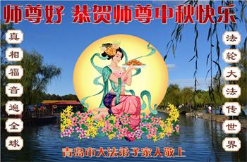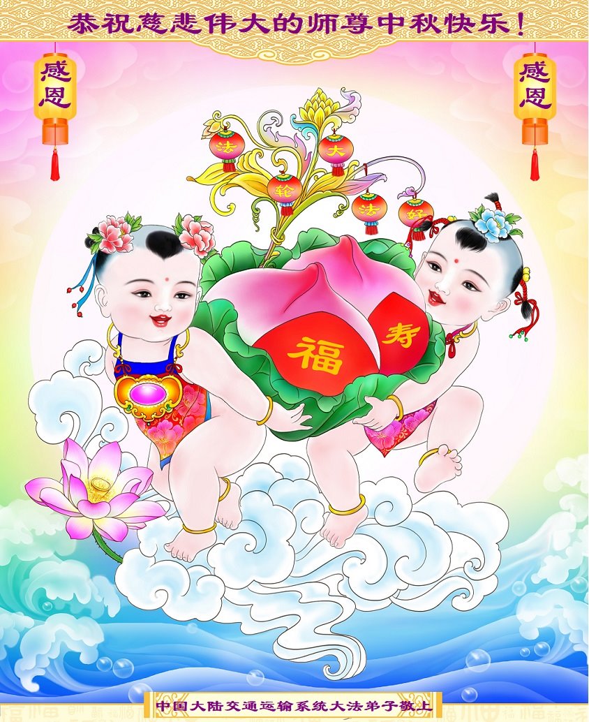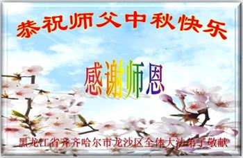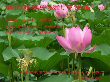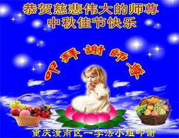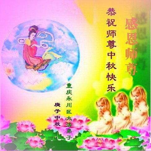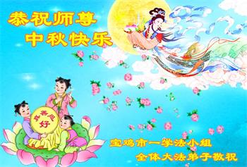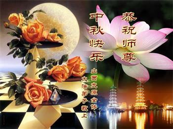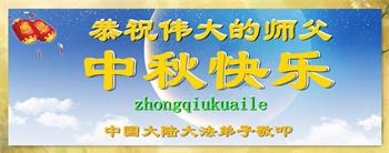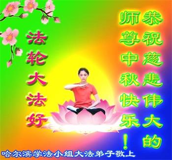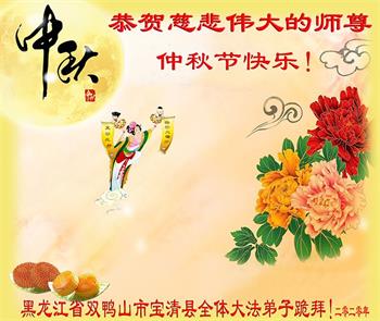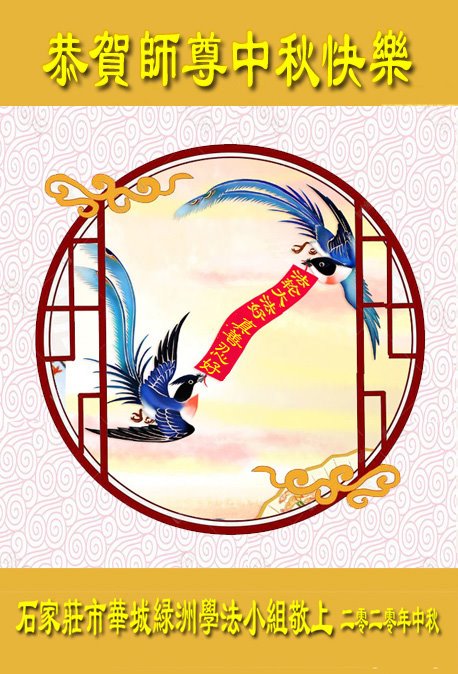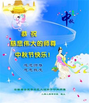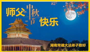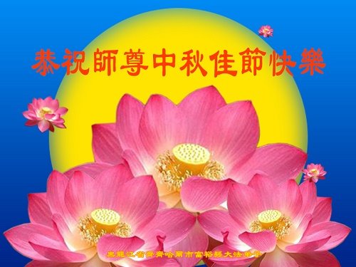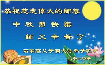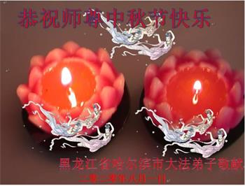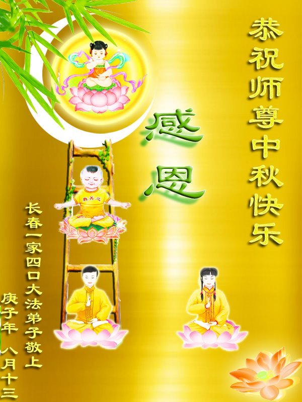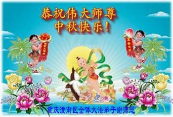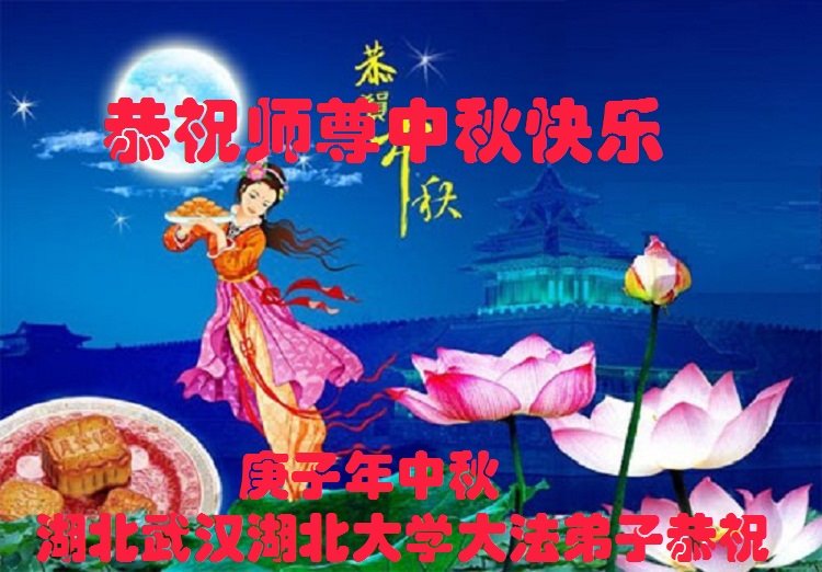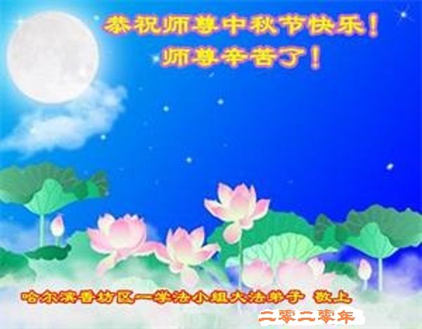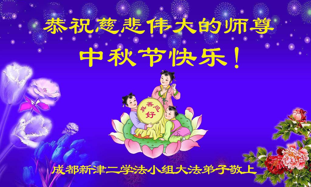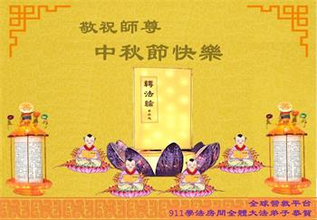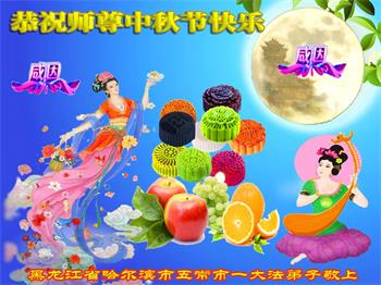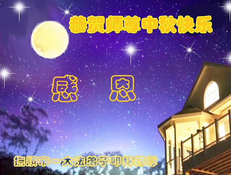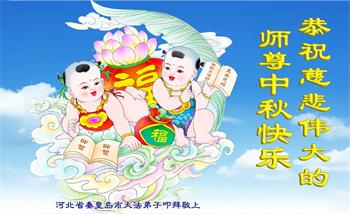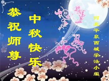 慈悲伟大的师尊您好!中秋节快乐!中铁第十一工程局的全体大法弟子远在中国大陆在中秋节前夕,弟子们向您献上无限的敬仰和感激之心!弟子们修炼二十多年了,我们一定继续坚持实修,抓紧这最后的、可贵的、亘古难遇的宇宙更新的大好时机,一如既往的、精進的做好师尊要求的“三件事”,净心多学法、净心多发正念,去掉弟子们各自的各种执着心,从而慈悲的讲清真相,多多的救下世上还存有善念的世人。