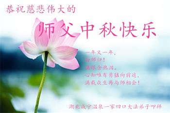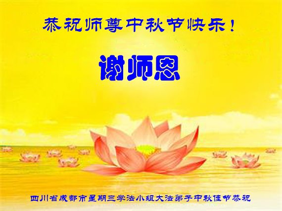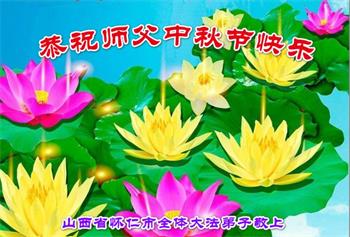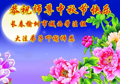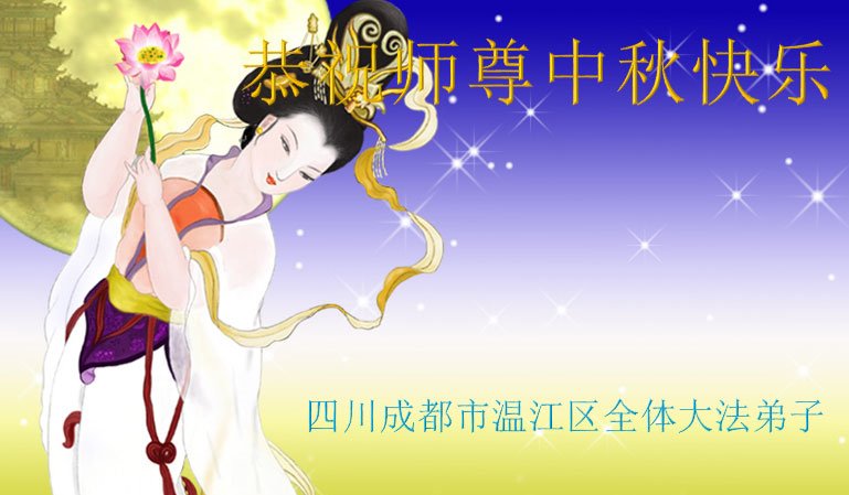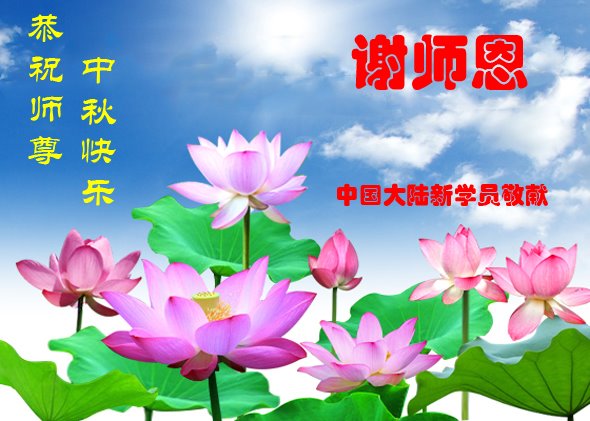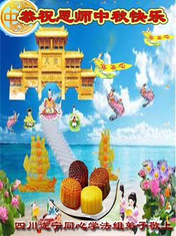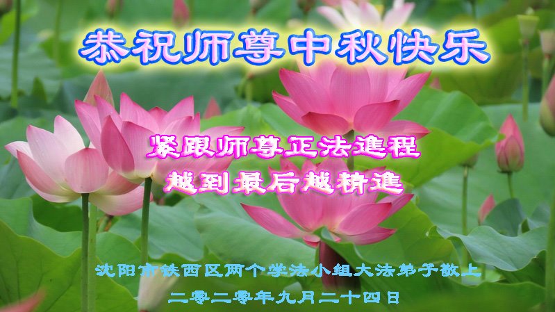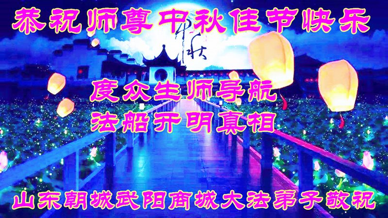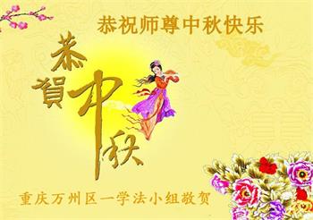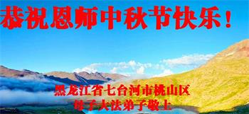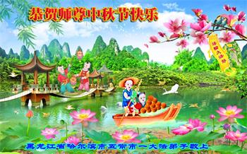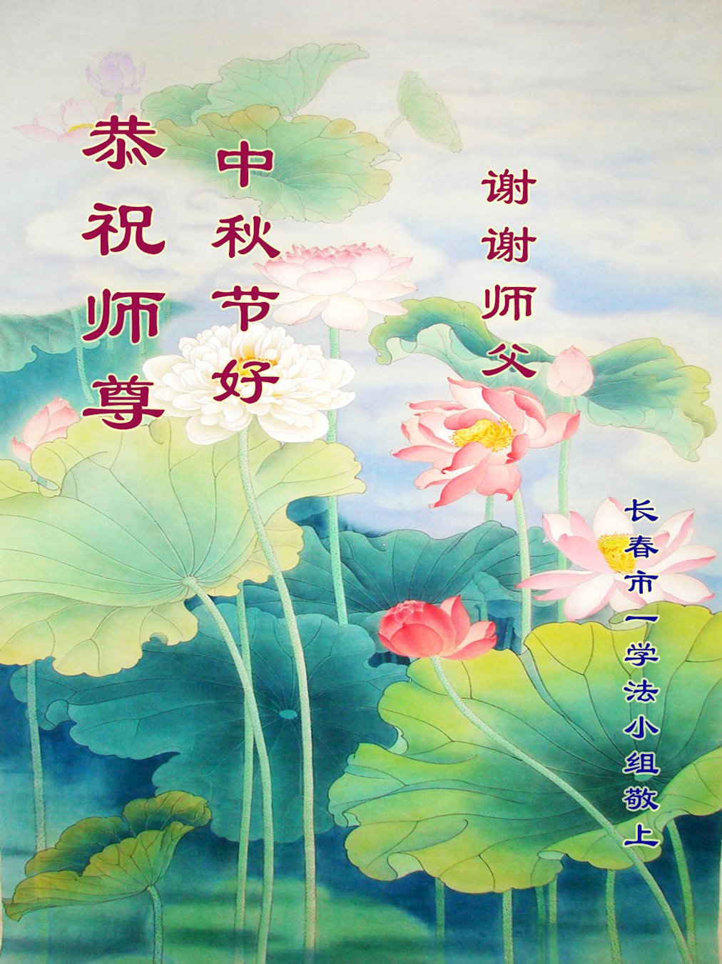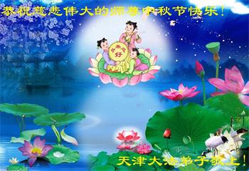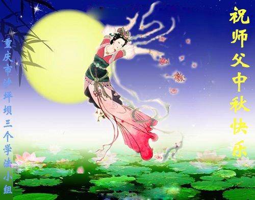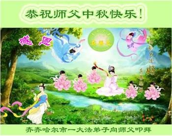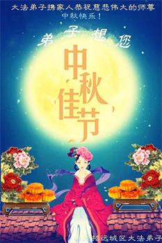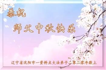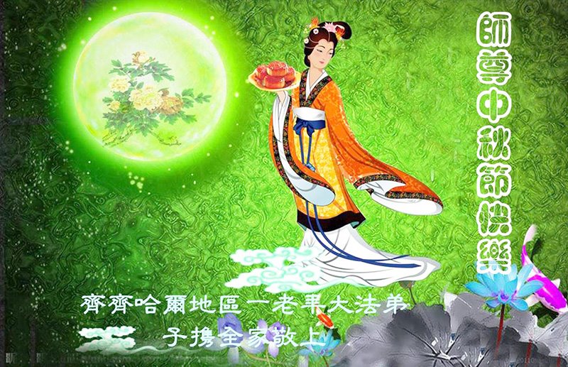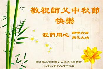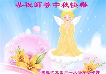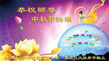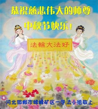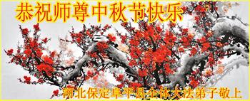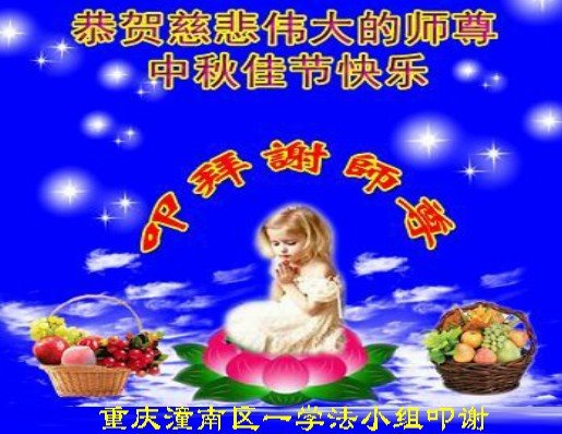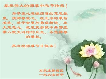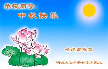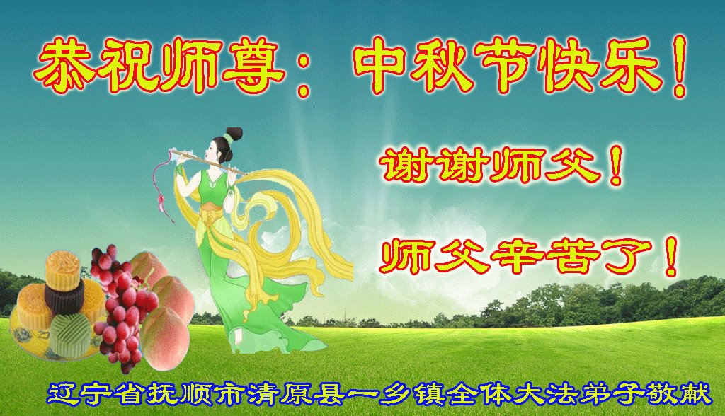 慈悲伟大的师尊您好!中秋节快乐!中铁第十一工程局的全体大法弟子远在中国大陆在中秋节前夕,弟子们向您献上无限的敬仰和感激之心!弟子们修炼二十多年了,我们一定继续坚持实修,抓紧这最后的、可贵的、亘古难遇的宇宙更新的大好时机,一如既往的、精進的做好师尊要求的“三件事”,净心多学法、净心多发正念,去掉弟子们各自的各种执着心,从而慈悲的讲清真相,多多的救下世上还存有善念的世人。