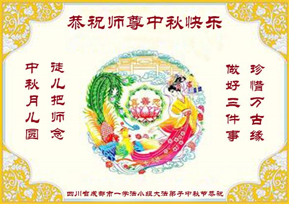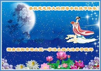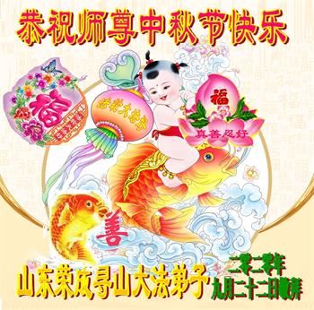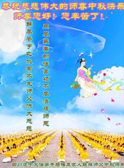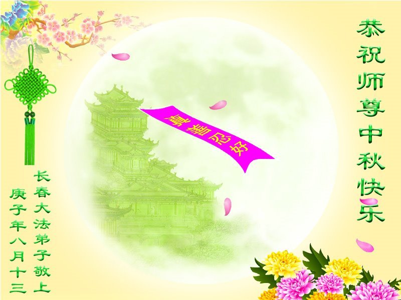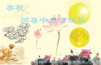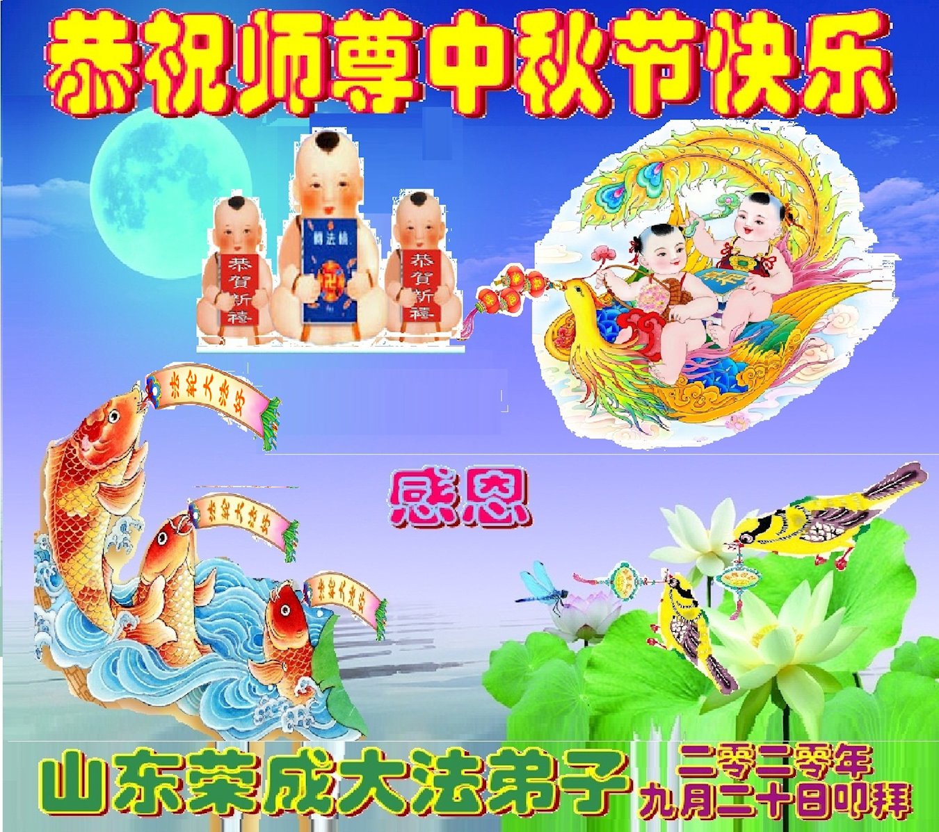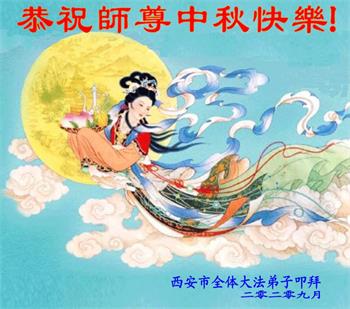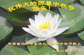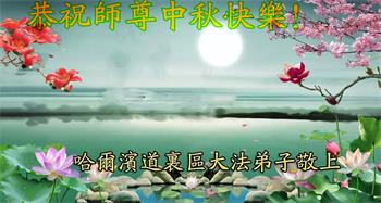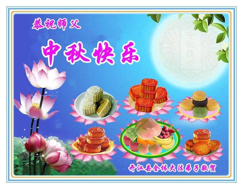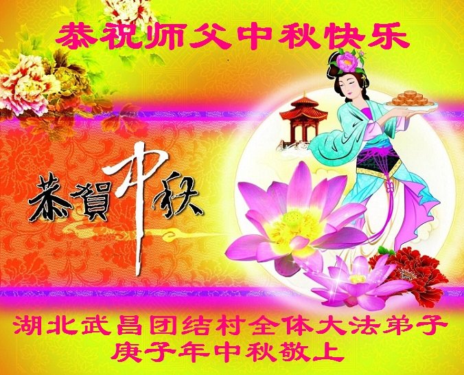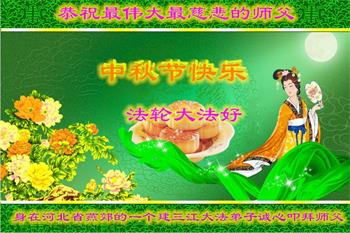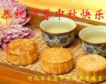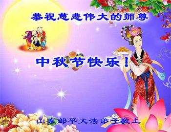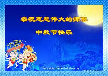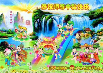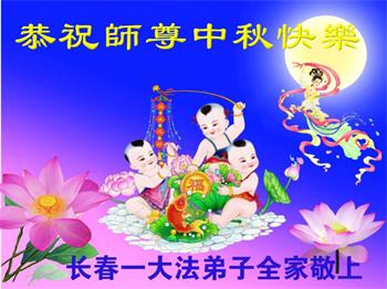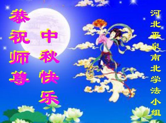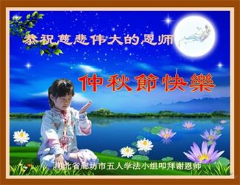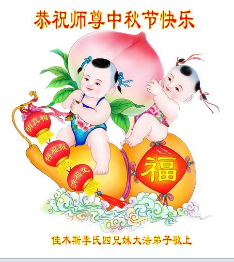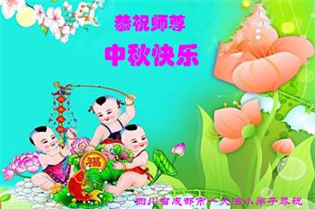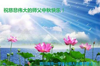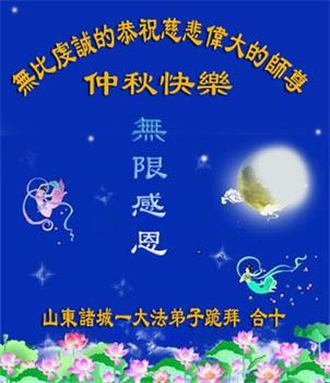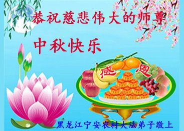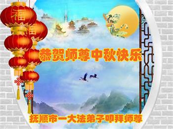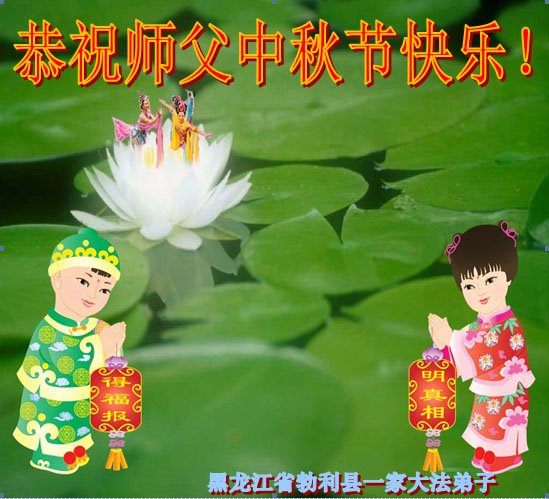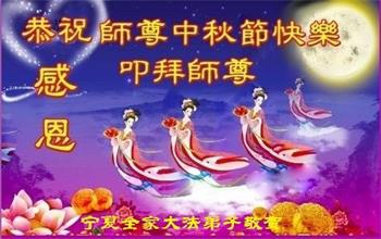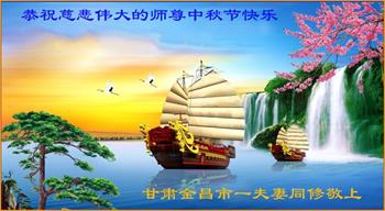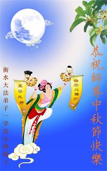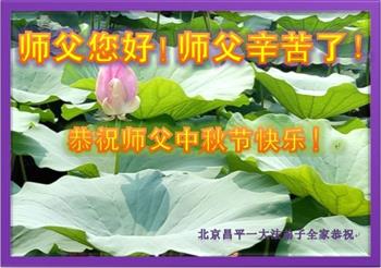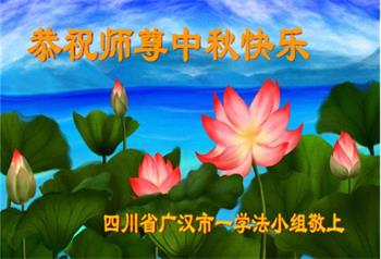 慈悲伟大的师尊您好!中秋节快乐!中铁第十一工程局的全体大法弟子远在中国大陆在中秋节前夕,弟子们向您献上无限的敬仰和感激之心!弟子们修炼二十多年了,我们一定继续坚持实修,抓紧这最后的、可贵的、亘古难遇的宇宙更新的大好时机,一如既往的、精進的做好师尊要求的“三件事”,净心多学法、净心多发正念,去掉弟子们各自的各种执着心,从而慈悲的讲清真相,多多的救下世上还存有善念的世人。