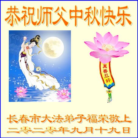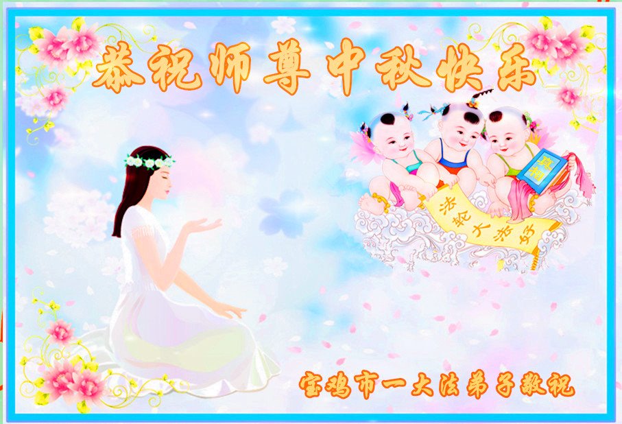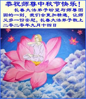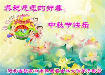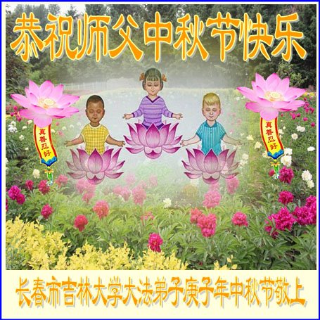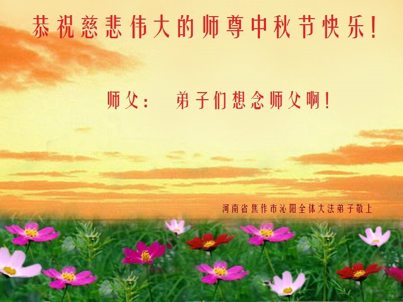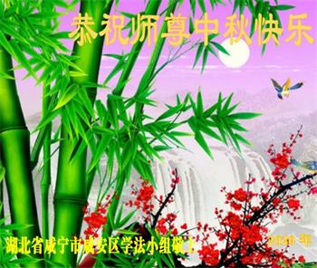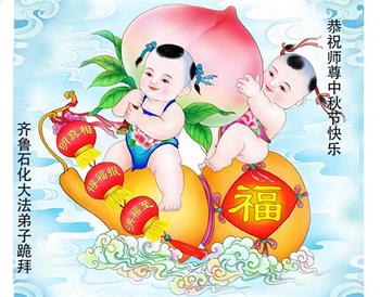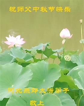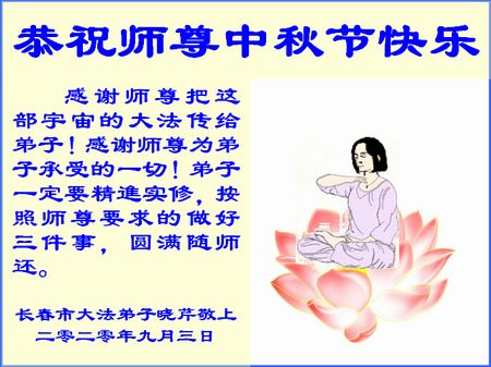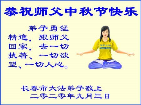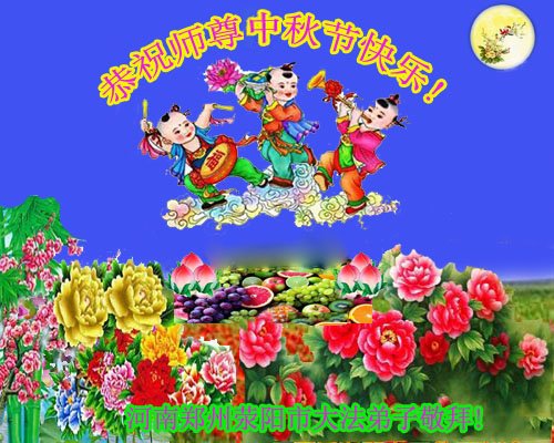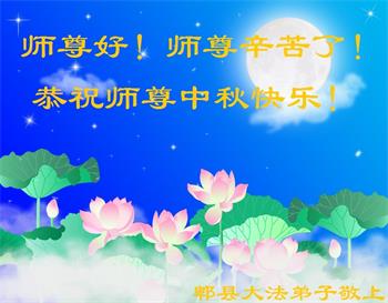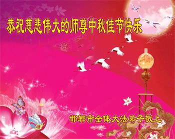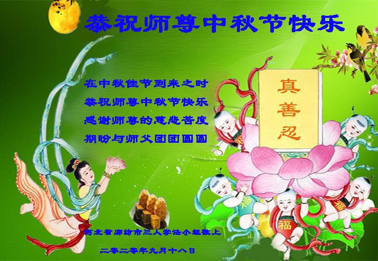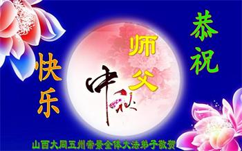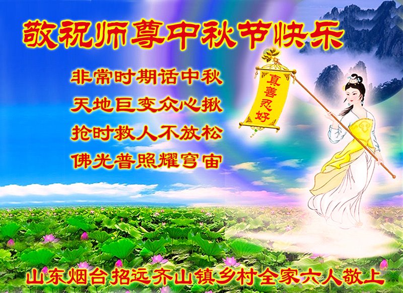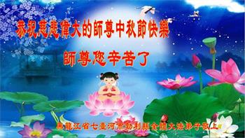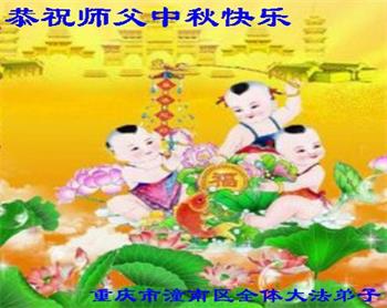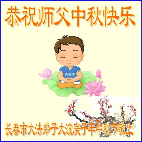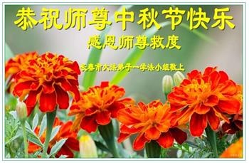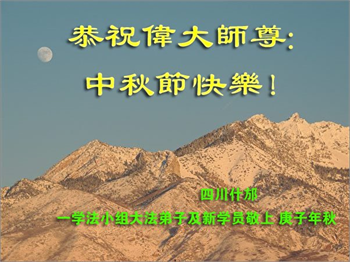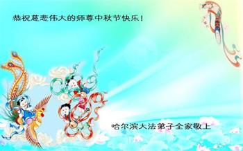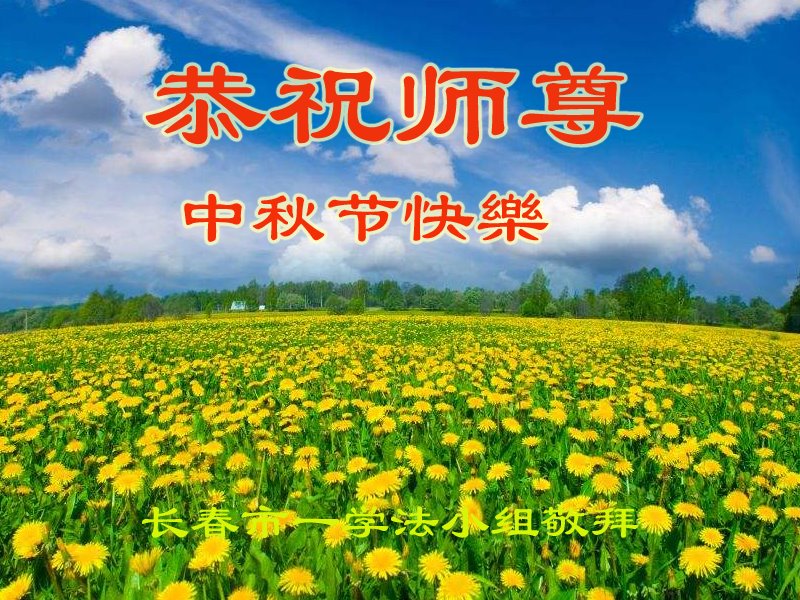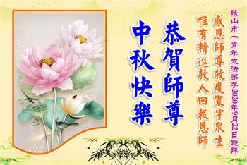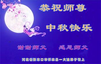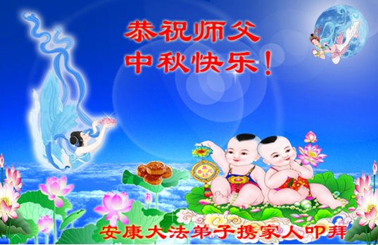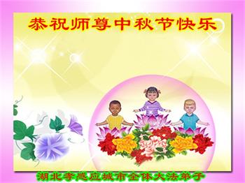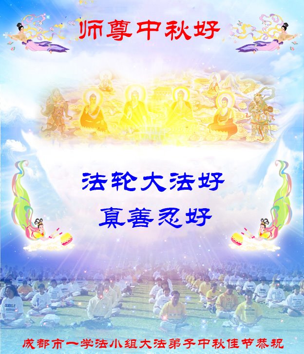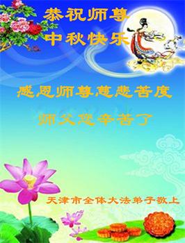 慈悲伟大的师尊您好!中秋节快乐!中铁第十一工程局的全体大法弟子远在中国大陆在中秋节前夕,弟子们向您献上无限的敬仰和感激之心!弟子们修炼二十多年了,我们一定继续坚持实修,抓紧这最后的、可贵的、亘古难遇的宇宙更新的大好时机,一如既往的、精進的做好师尊要求的“三件事”,净心多学法、净心多发正念,去掉弟子们各自的各种执着心,从而慈悲的讲清真相,多多的救下世上还存有善念的世人。