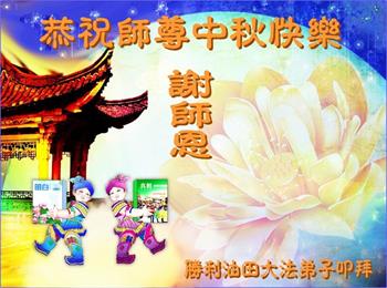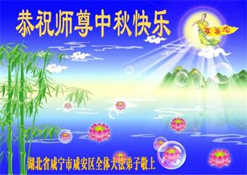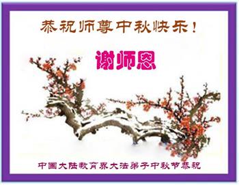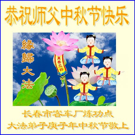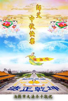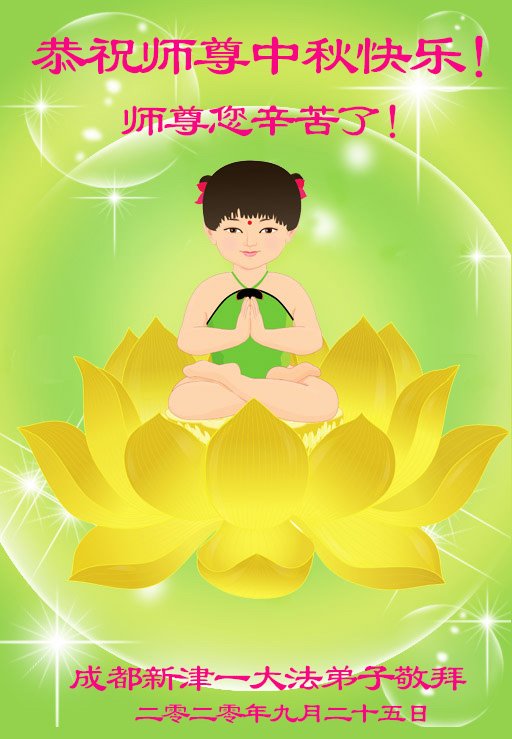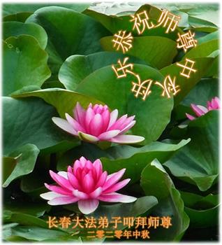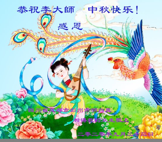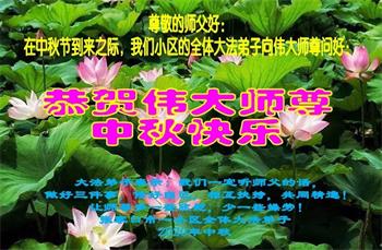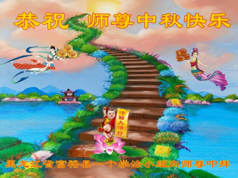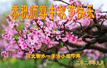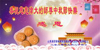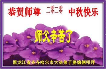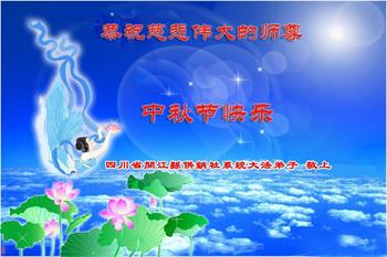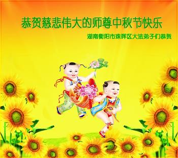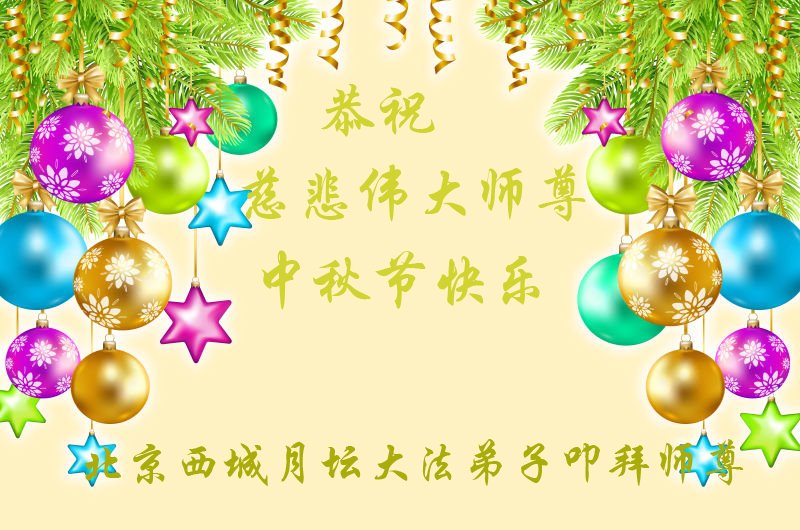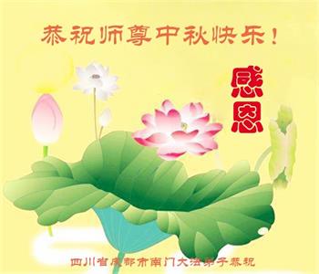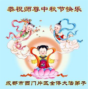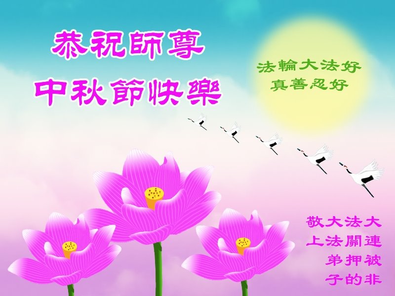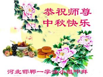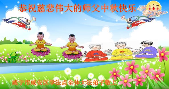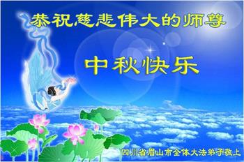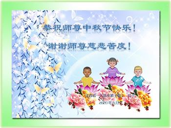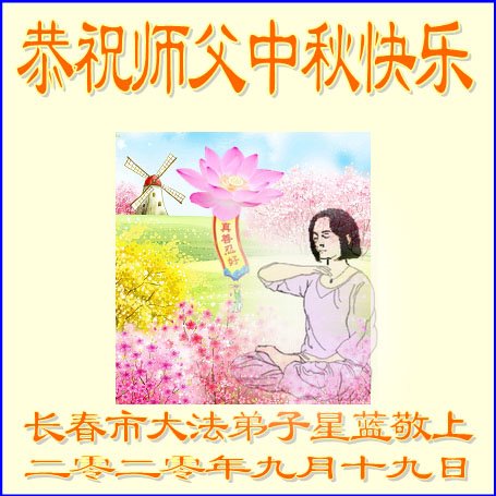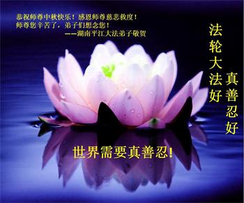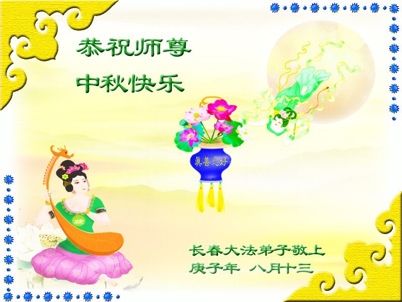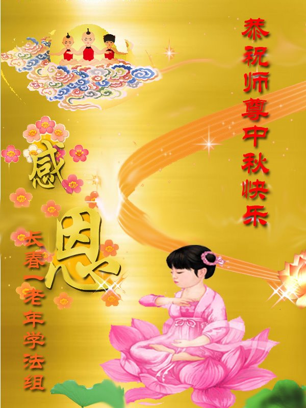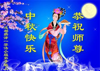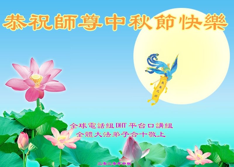 慈悲伟大的师尊您好!中秋节快乐!中铁第十一工程局的全体大法弟子远在中国大陆在中秋节前夕,弟子们向您献上无限的敬仰和感激之心!弟子们修炼二十多年了,我们一定继续坚持实修,抓紧这最后的、可贵的、亘古难遇的宇宙更新的大好时机,一如既往的、精進的做好师尊要求的“三件事”,净心多学法、净心多发正念,去掉弟子们各自的各种执着心,从而慈悲的讲清真相,多多的救下世上还存有善念的世人。