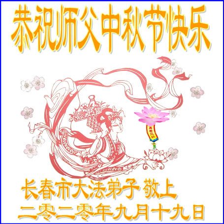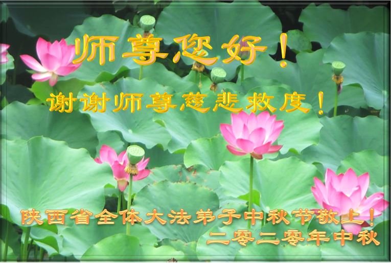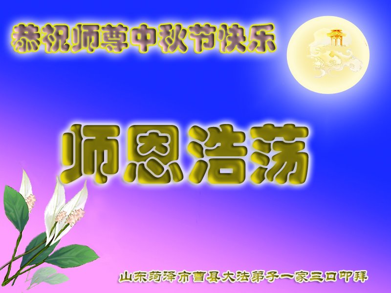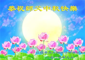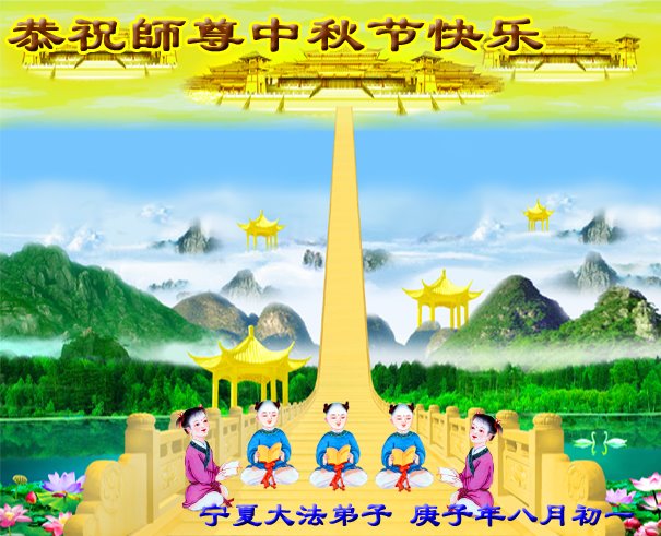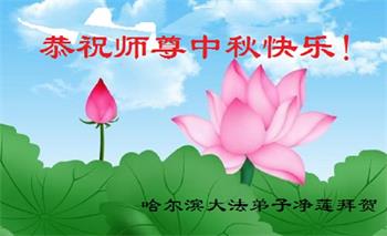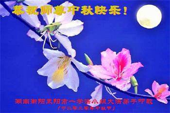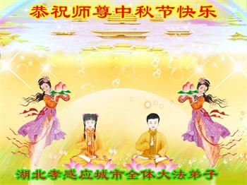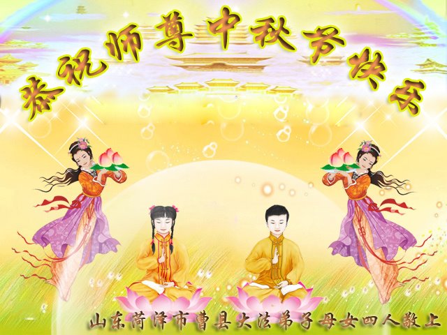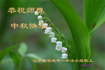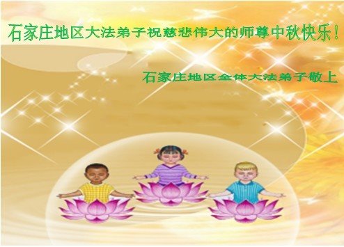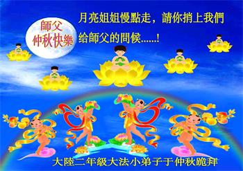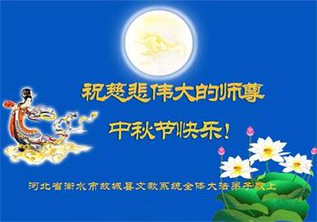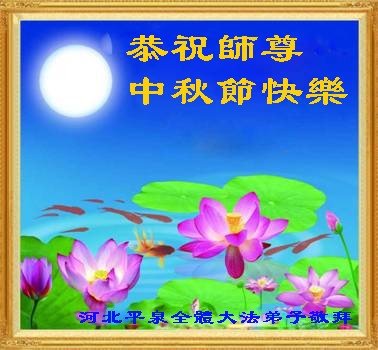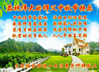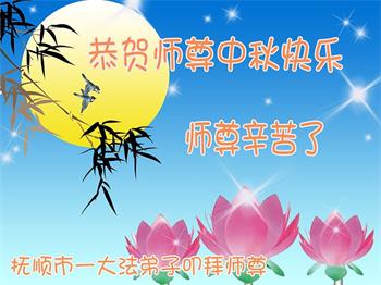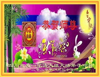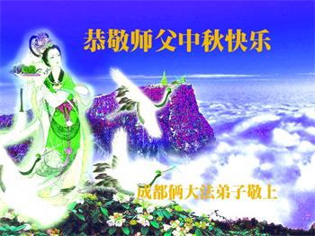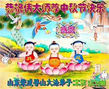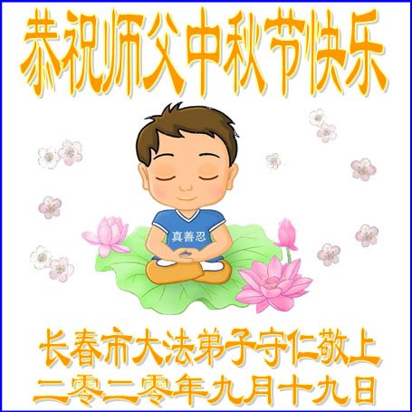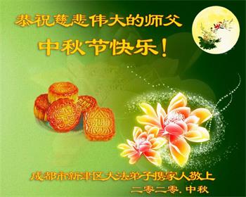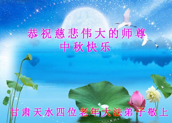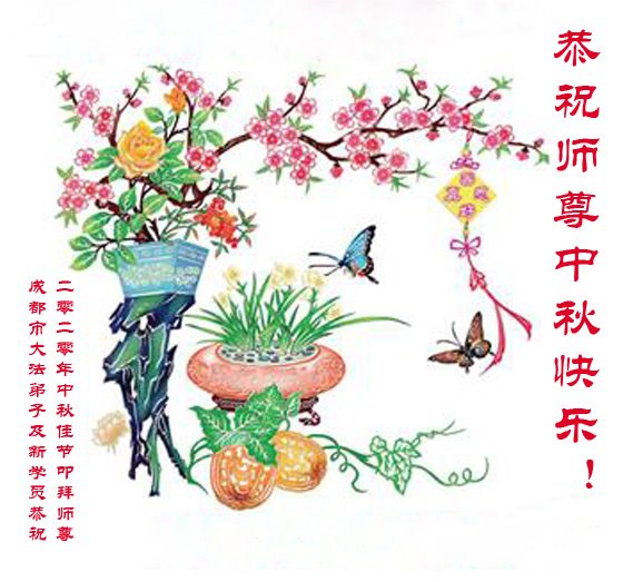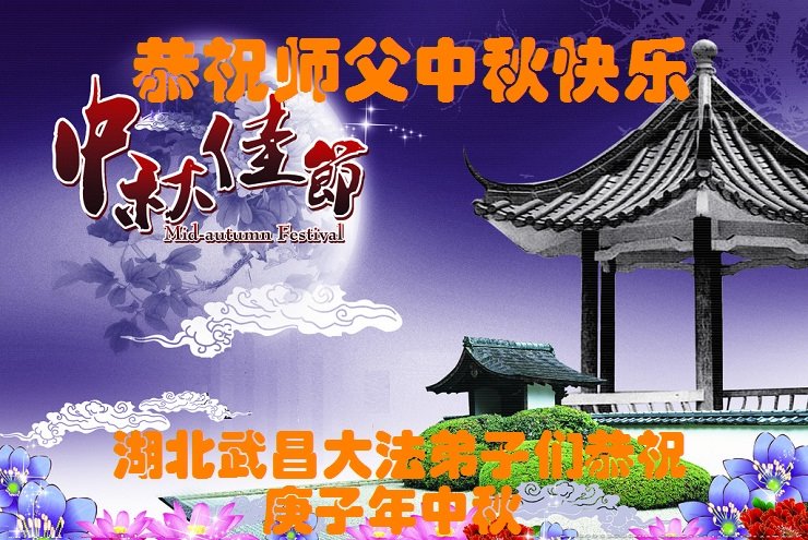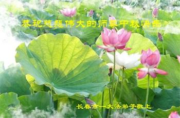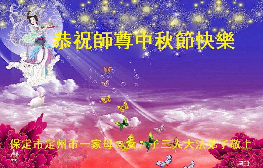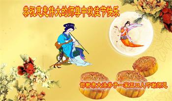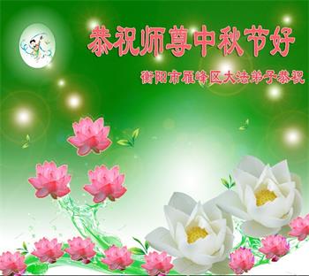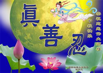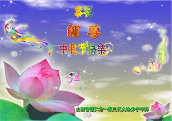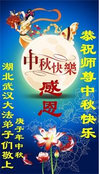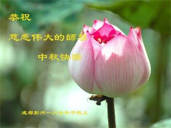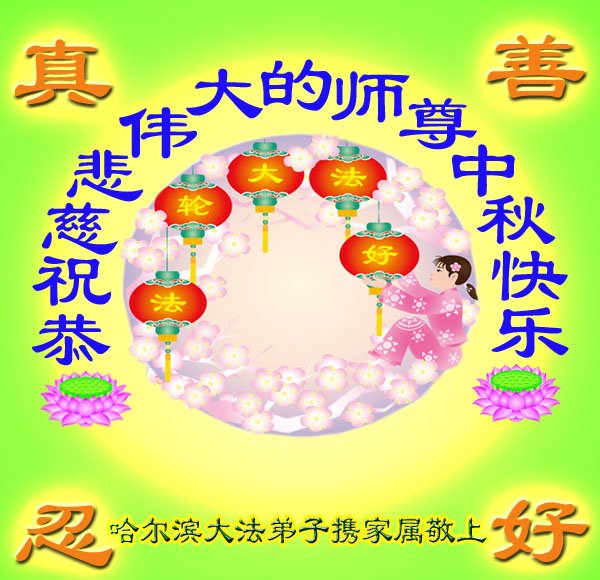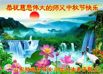 慈悲伟大的师尊您好!中秋节快乐!中铁第十一工程局的全体大法弟子远在中国大陆在中秋节前夕,弟子们向您献上无限的敬仰和感激之心!弟子们修炼二十多年了,我们一定继续坚持实修,抓紧这最后的、可贵的、亘古难遇的宇宙更新的大好时机,一如既往的、精進的做好师尊要求的“三件事”,净心多学法、净心多发正念,去掉弟子们各自的各种执着心,从而慈悲的讲清真相,多多的救下世上还存有善念的世人。
