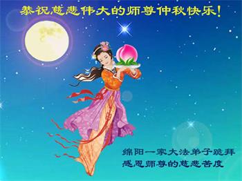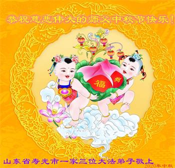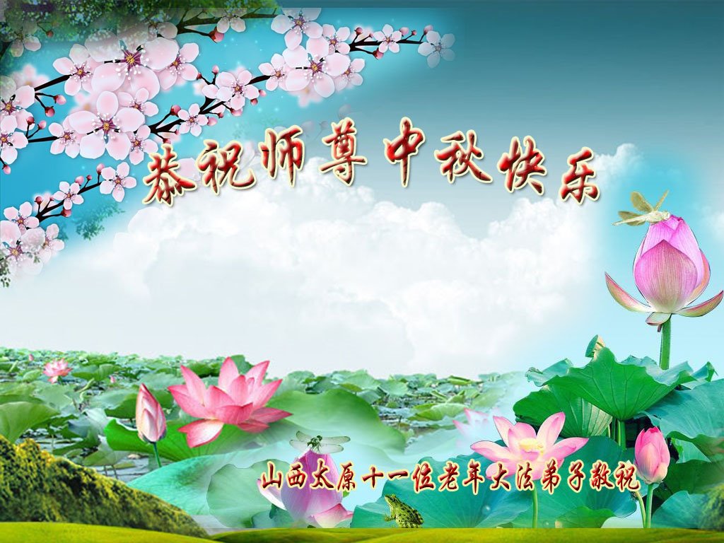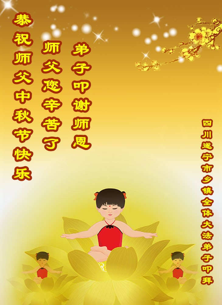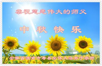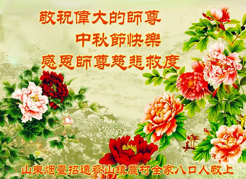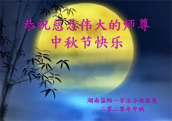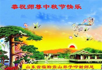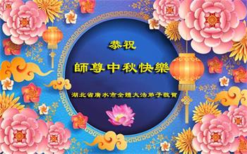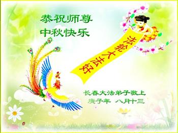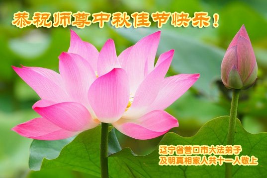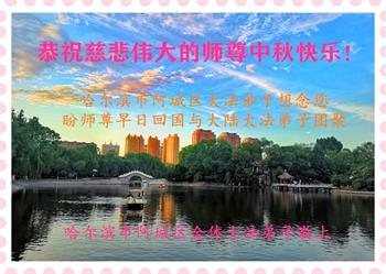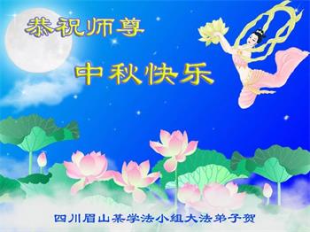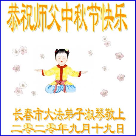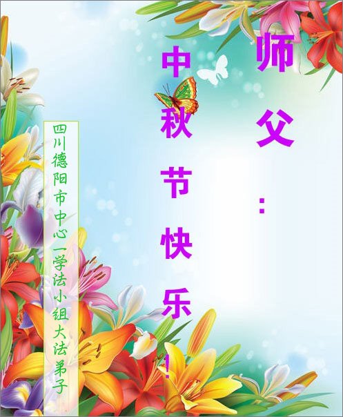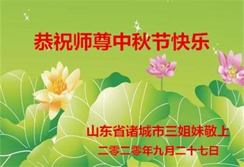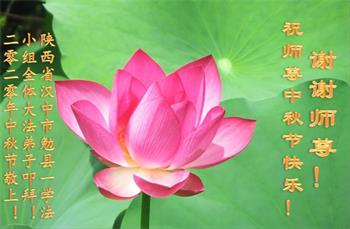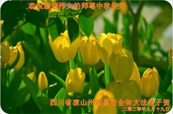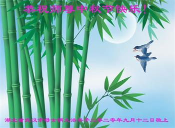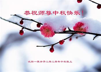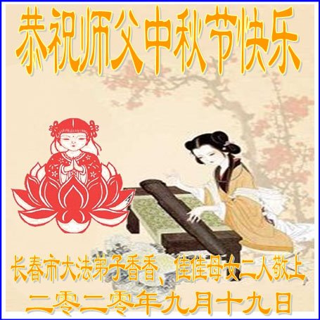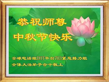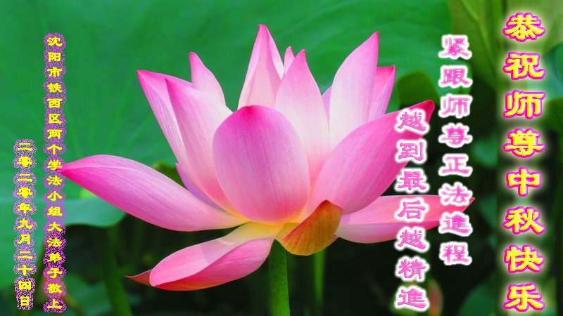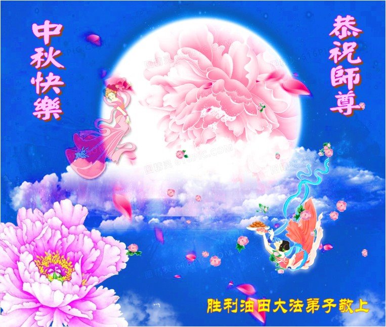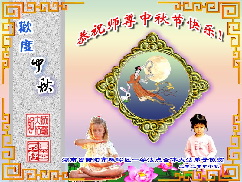 慈悲伟大的师尊您好!中秋节快乐!中铁第十一工程局的全体大法弟子远在中国大陆在中秋节前夕,弟子们向您献上无限的敬仰和感激之心!弟子们修炼二十多年了,我们一定继续坚持实修,抓紧这最后的、可贵的、亘古难遇的宇宙更新的大好时机,一如既往的、精進的做好师尊要求的“三件事”,净心多学法、净心多发正念,去掉弟子们各自的各种执着心,从而慈悲的讲清真相,多多的救下世上还存有善念的世人。