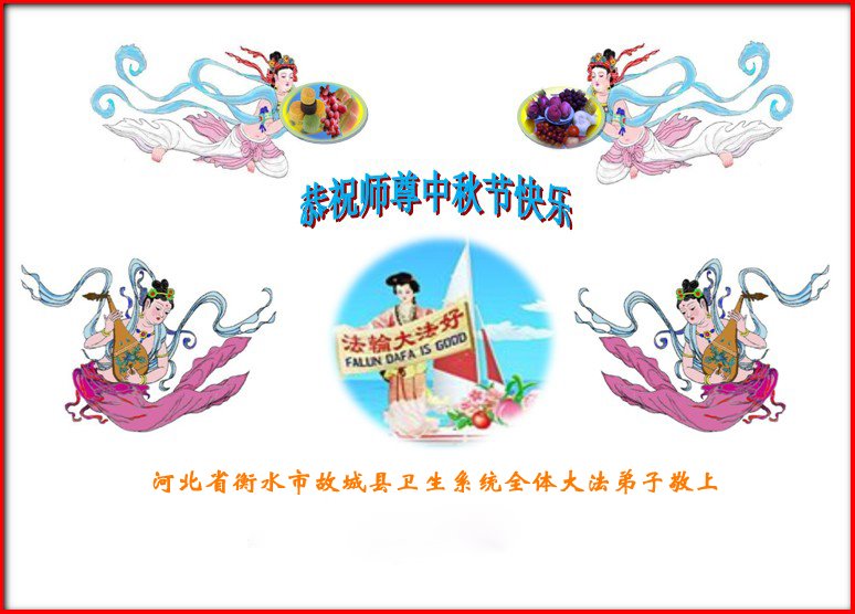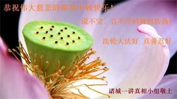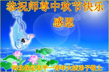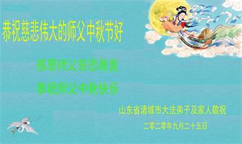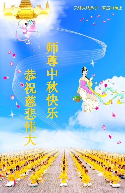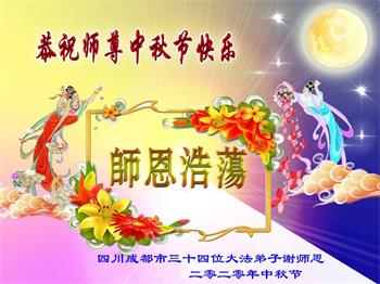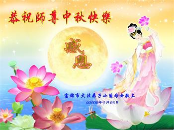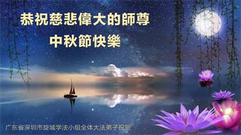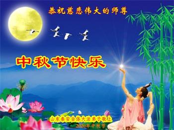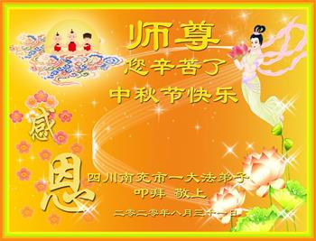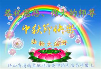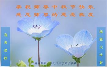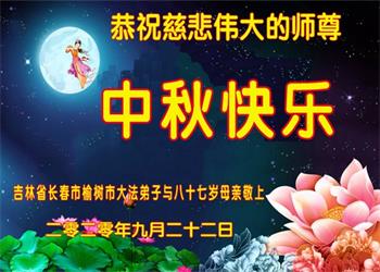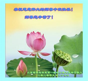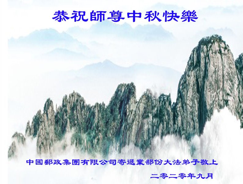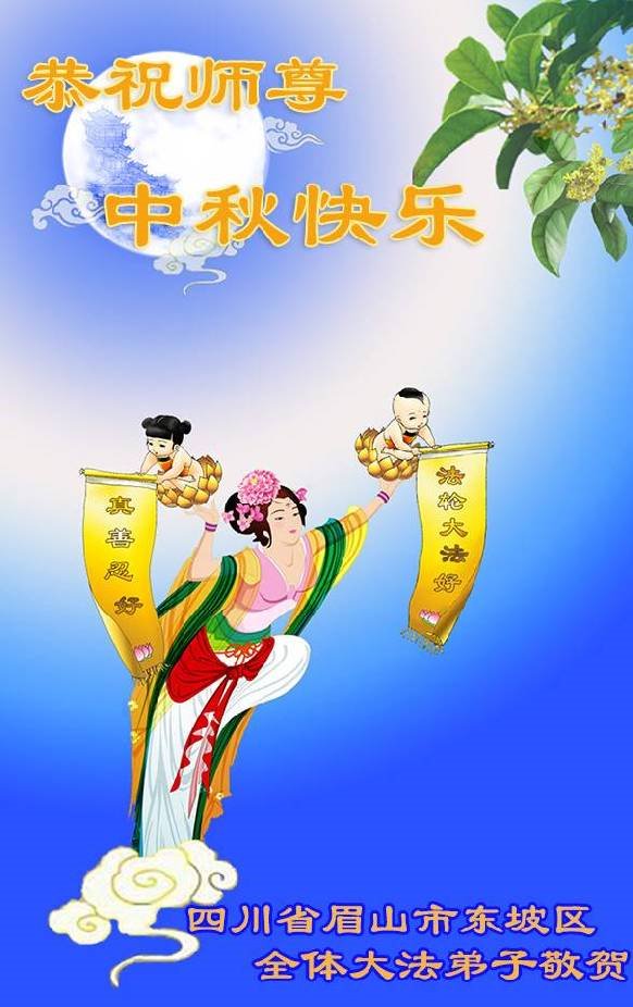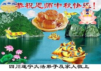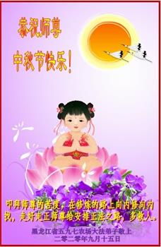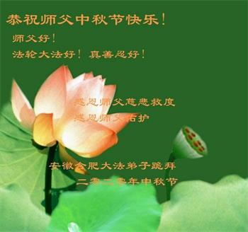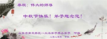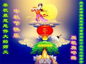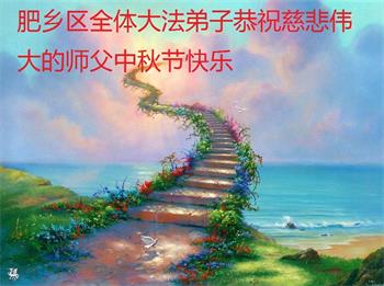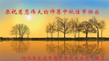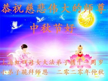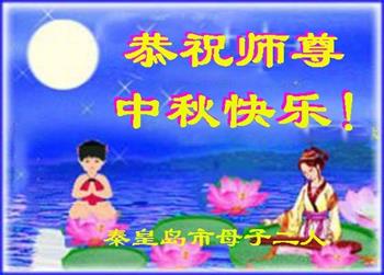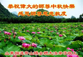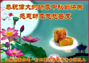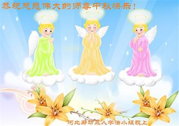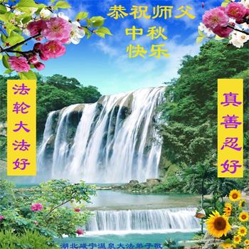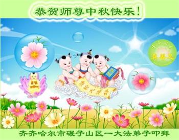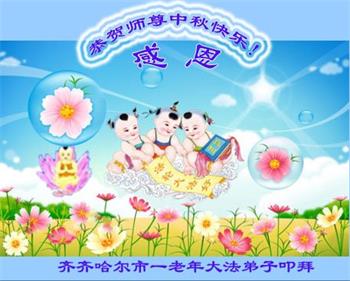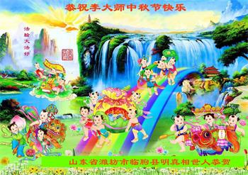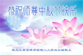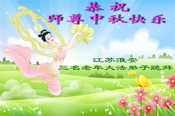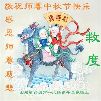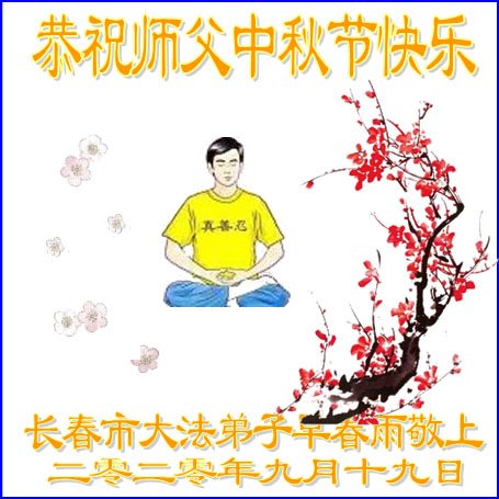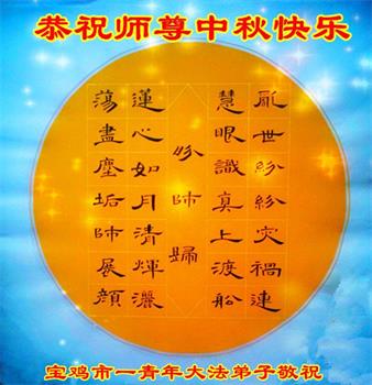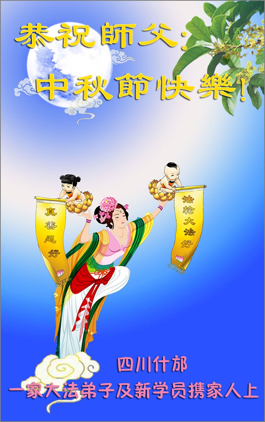 慈悲伟大的师尊您好!中秋节快乐!中铁第十一工程局的全体大法弟子远在中国大陆在中秋节前夕,弟子们向您献上无限的敬仰和感激之心!弟子们修炼二十多年了,我们一定继续坚持实修,抓紧这最后的、可贵的、亘古难遇的宇宙更新的大好时机,一如既往的、精進的做好师尊要求的“三件事”,净心多学法、净心多发正念,去掉弟子们各自的各种执着心,从而慈悲的讲清真相,多多的救下世上还存有善念的世人。