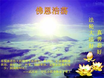 在师尊无量慈悲的感召下,弟子谨记师尊的谆谆教诲,修好自己,放下自我,全力的救度众生。愿所有的世人都能明白真相,远离罪恶,远离灾难,选择美好未来!愿法轮大法的佛光普照华夏大地!愿师尊早日回到大陆!相信这一天不会太远!