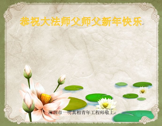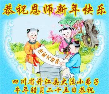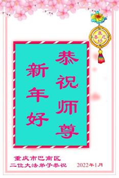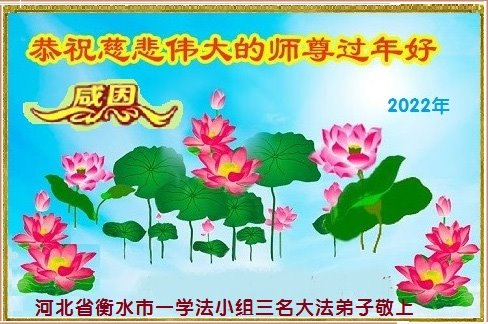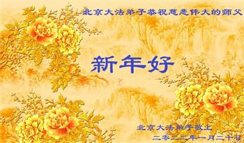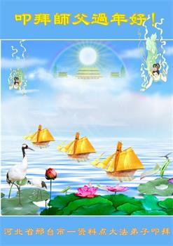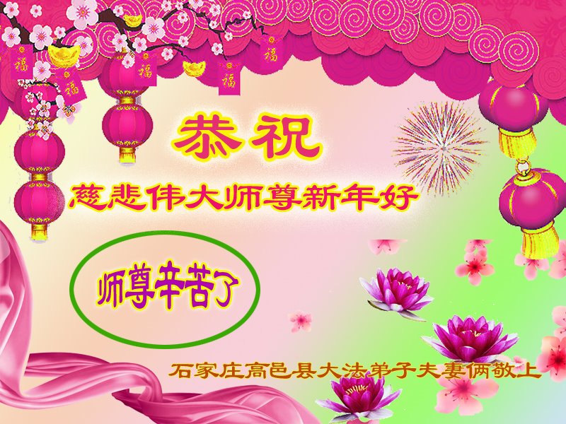 师父好!我们老俩口都是九十多岁的人了,通过看法轮大法资料,我们明白法轮功受的冤屈,也知道了大法的美好。平日里我们诚心诵念“法轮大法好,真善忍好”,我们亲身感受到了,体验到了,大法师父的佑护。我们衷心感谢师父,感谢大法,新年来了,我们衷心恭祝师父节日快乐!