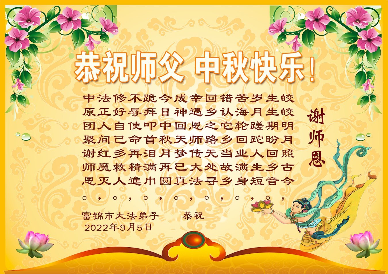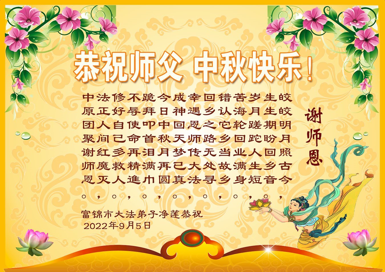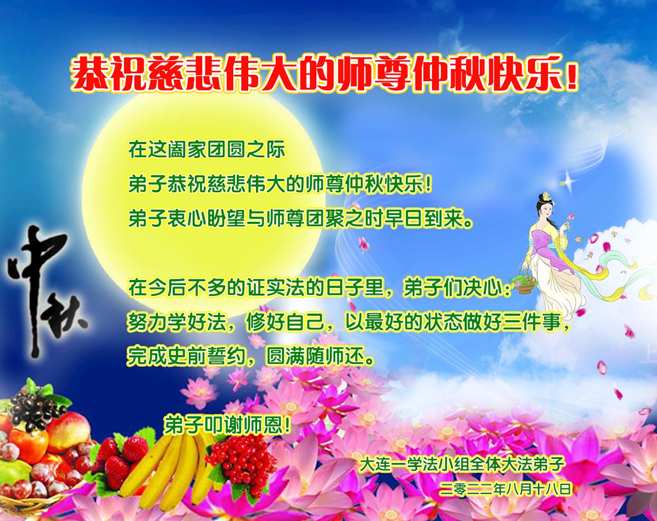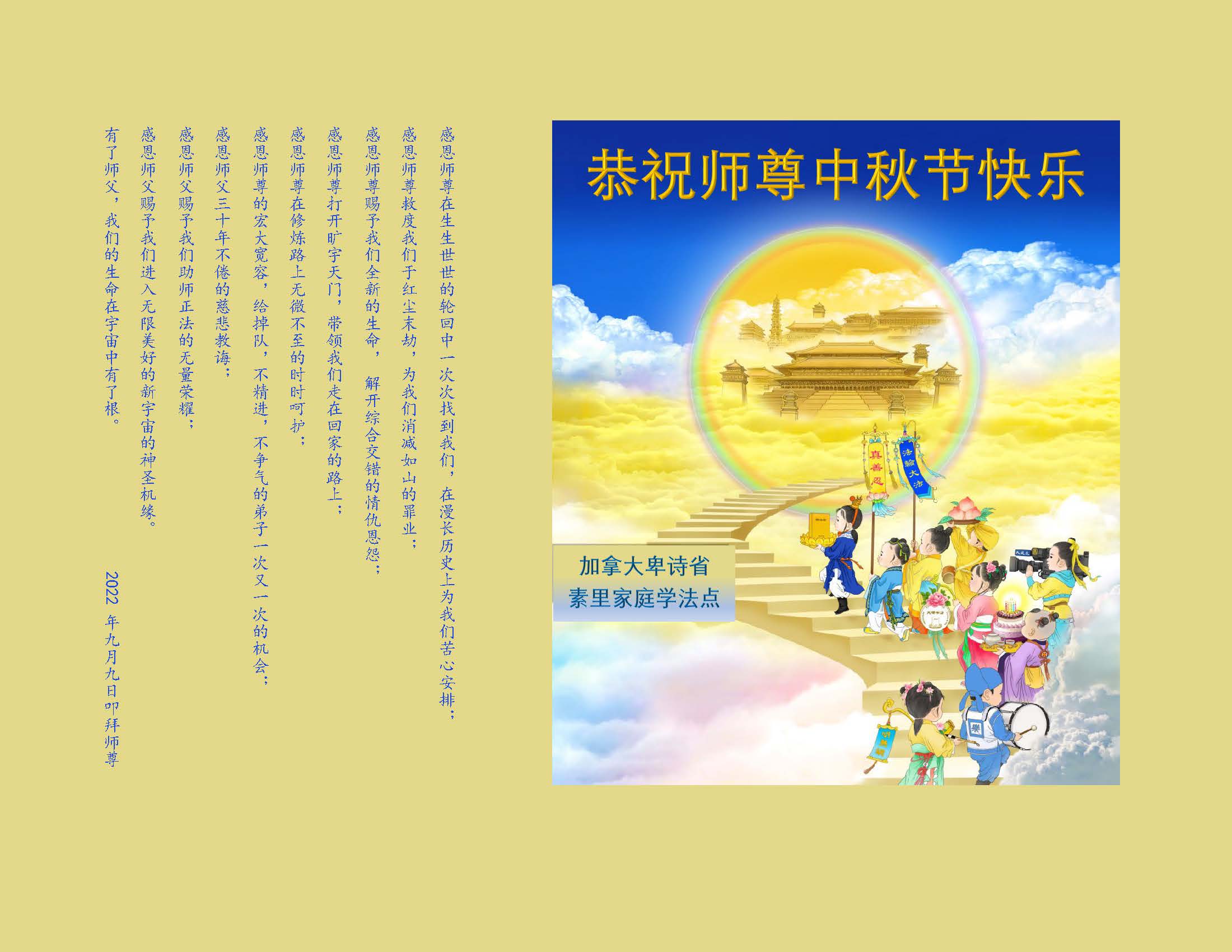 <英文版: http://en.minghui.org/html/articles/2022/9/11/203622.html>大陆11省、直辖市大法弟子恭祝师尊中秋好(31条)