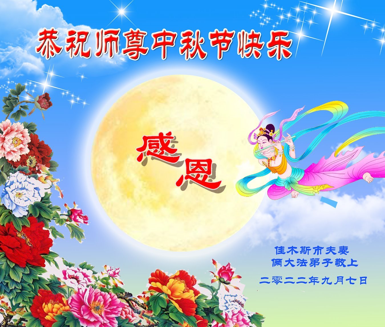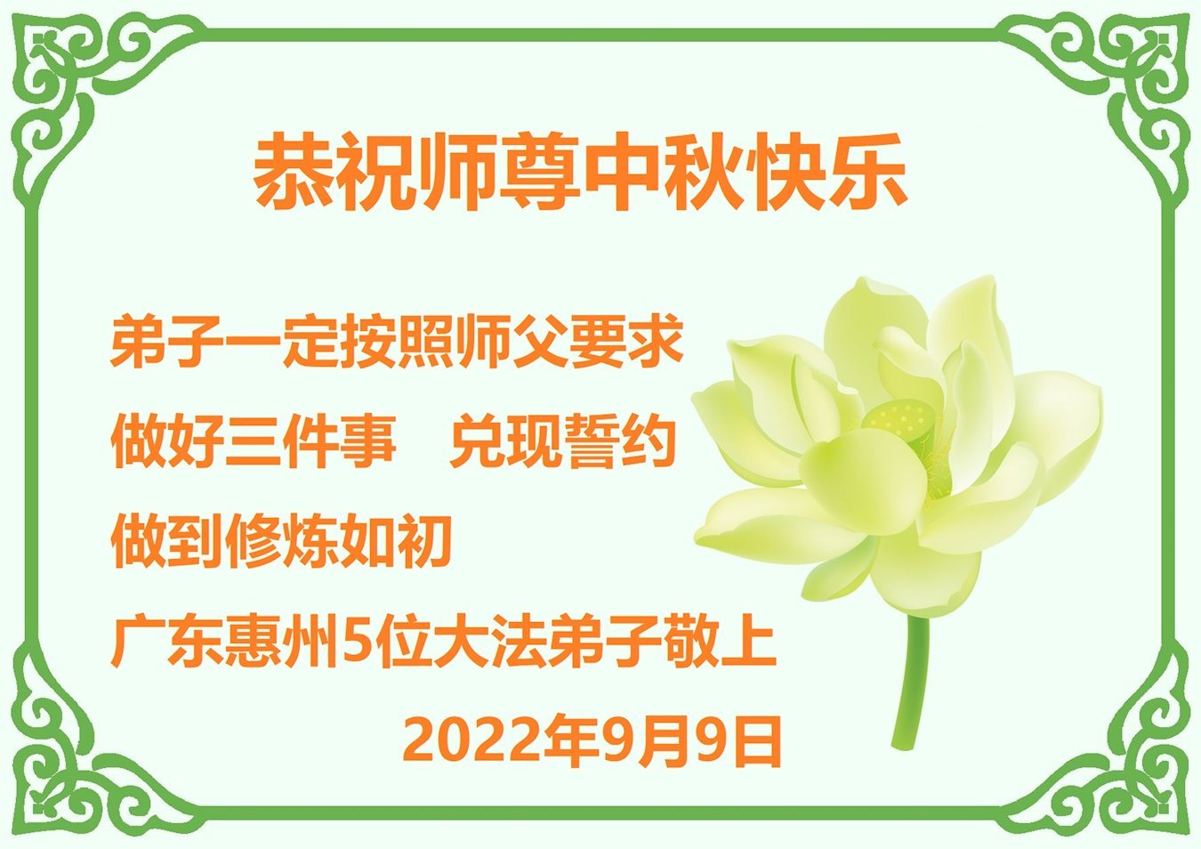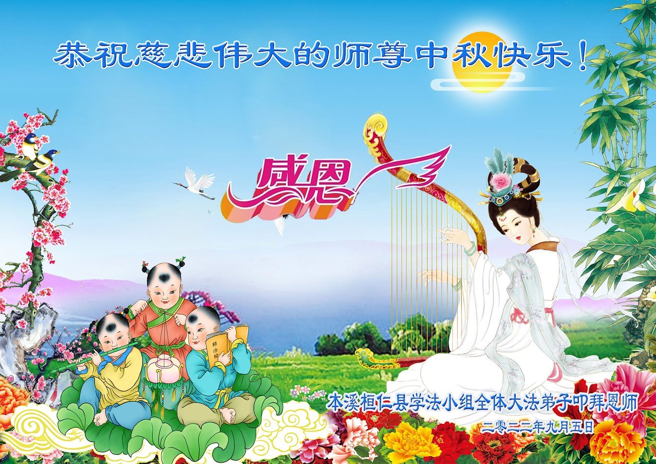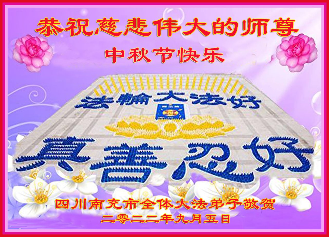 【明慧网二零二二年九月十日】(明慧网记者综合报道)壬寅年中秋佳节到了,中国各地公、检、法、司、军队机构的大法弟子的一张张美丽的贺卡飞向海外明慧网,恭祝师父佳节快乐!感恩师父的慈悲救度,并向师父表达弟子们坚修大法直至圆满的信心。