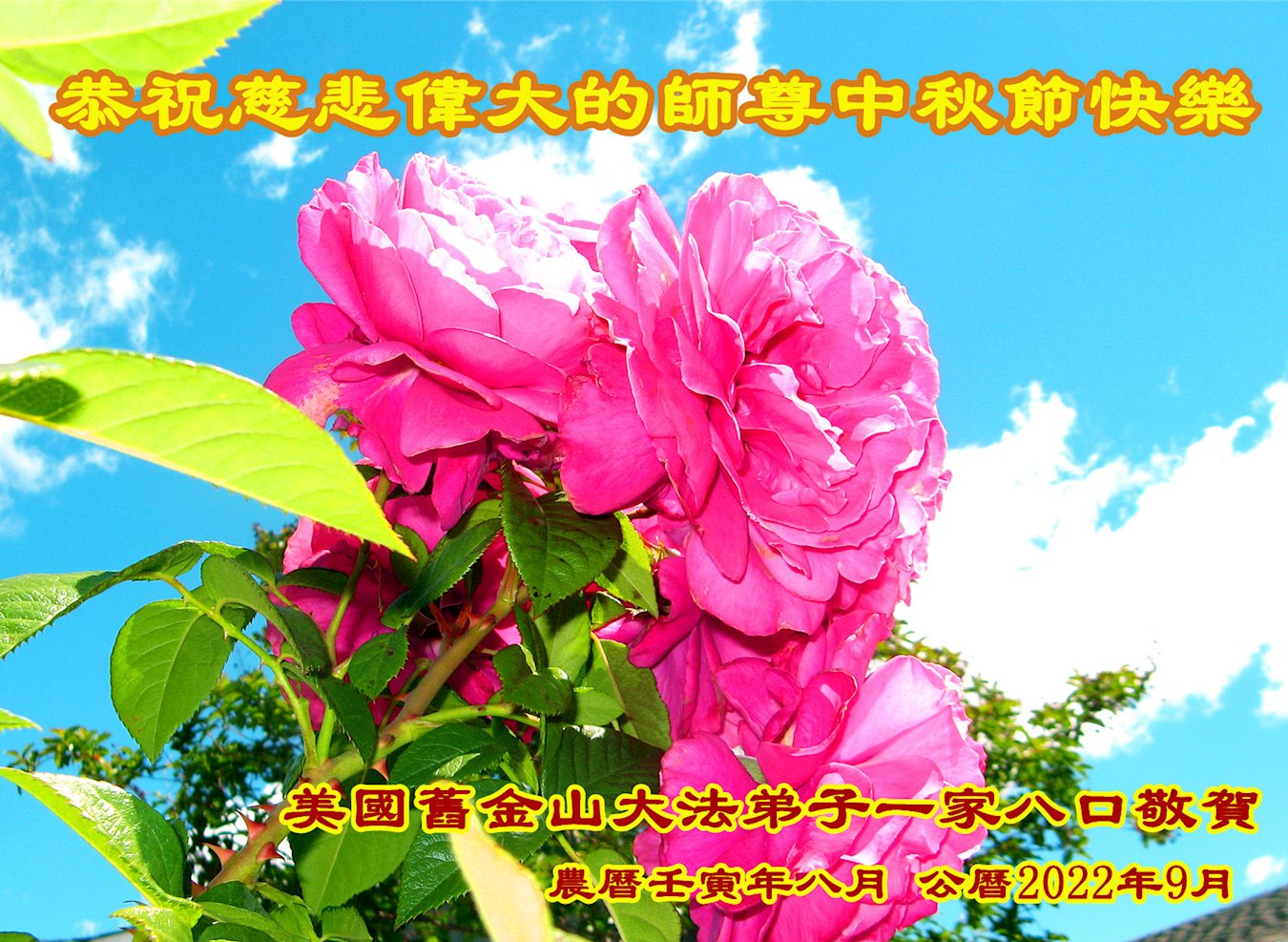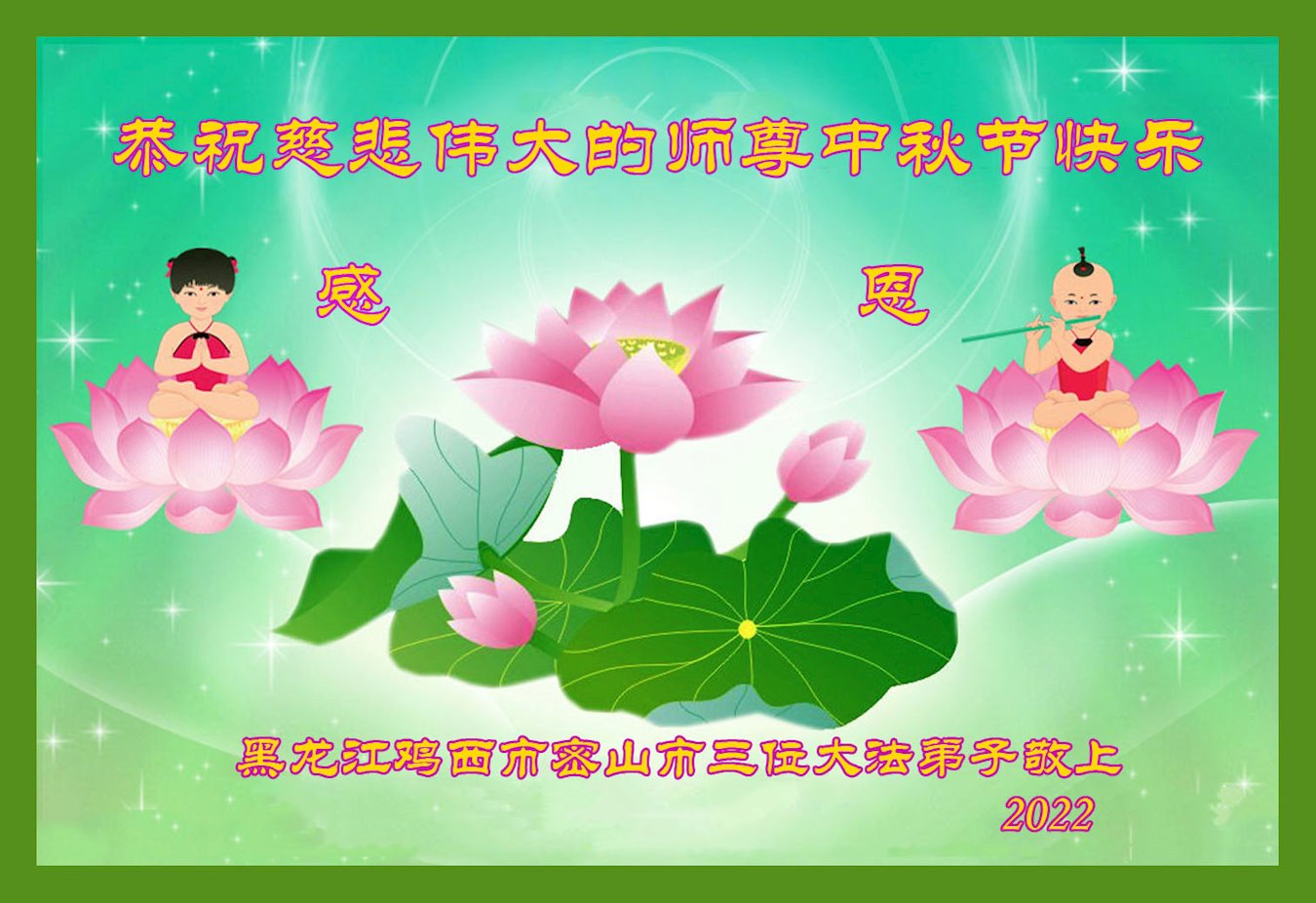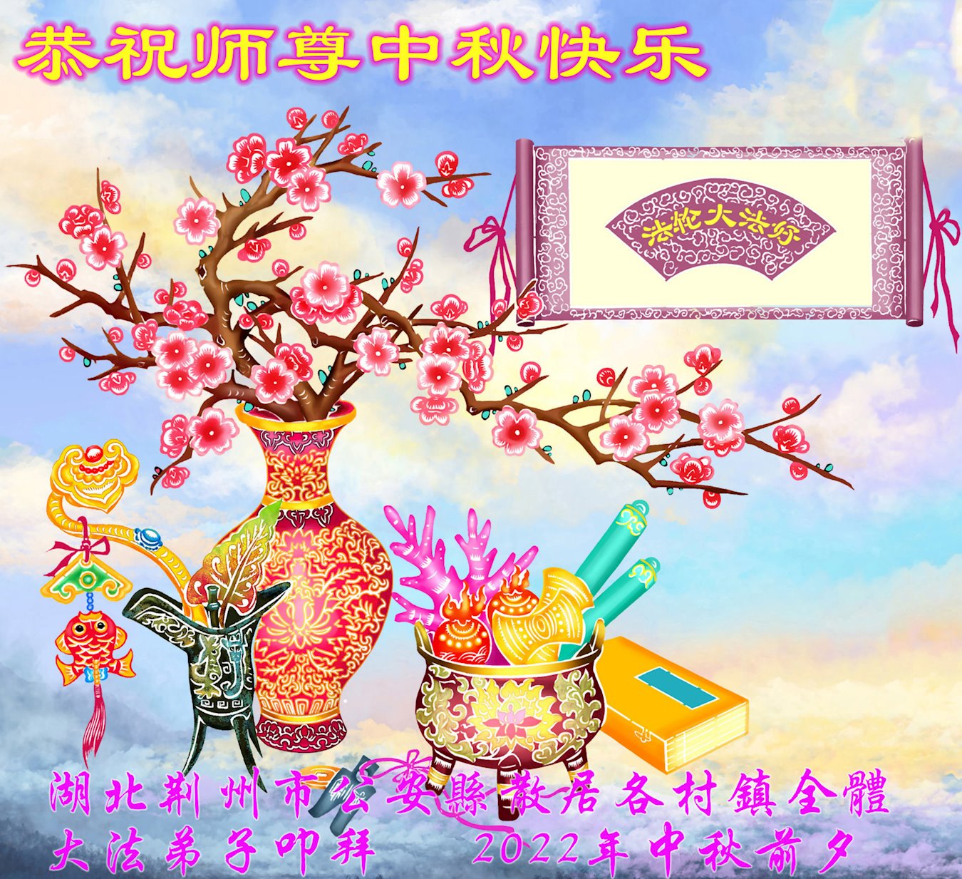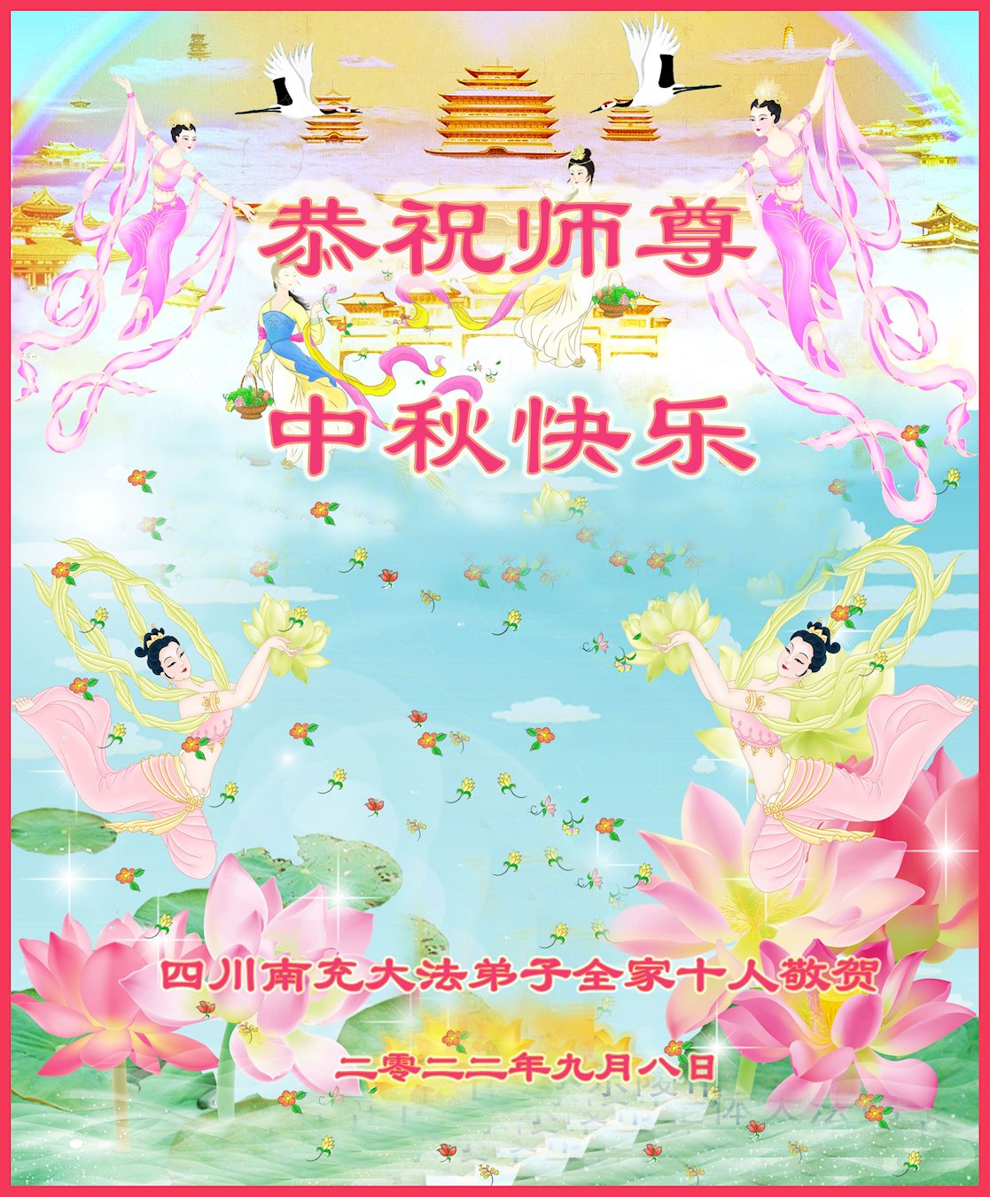 【明慧网二零二二年九月十日】(明慧网记者综合报道)壬寅年中秋佳节到了,中国各地公、检、法、司、军队机构的大法弟子的一张张美丽的贺卡飞向海外明慧网,恭祝师父佳节快乐!感恩师父的慈悲救度,并向师父表达弟子们坚修大法直至圆满的信心。