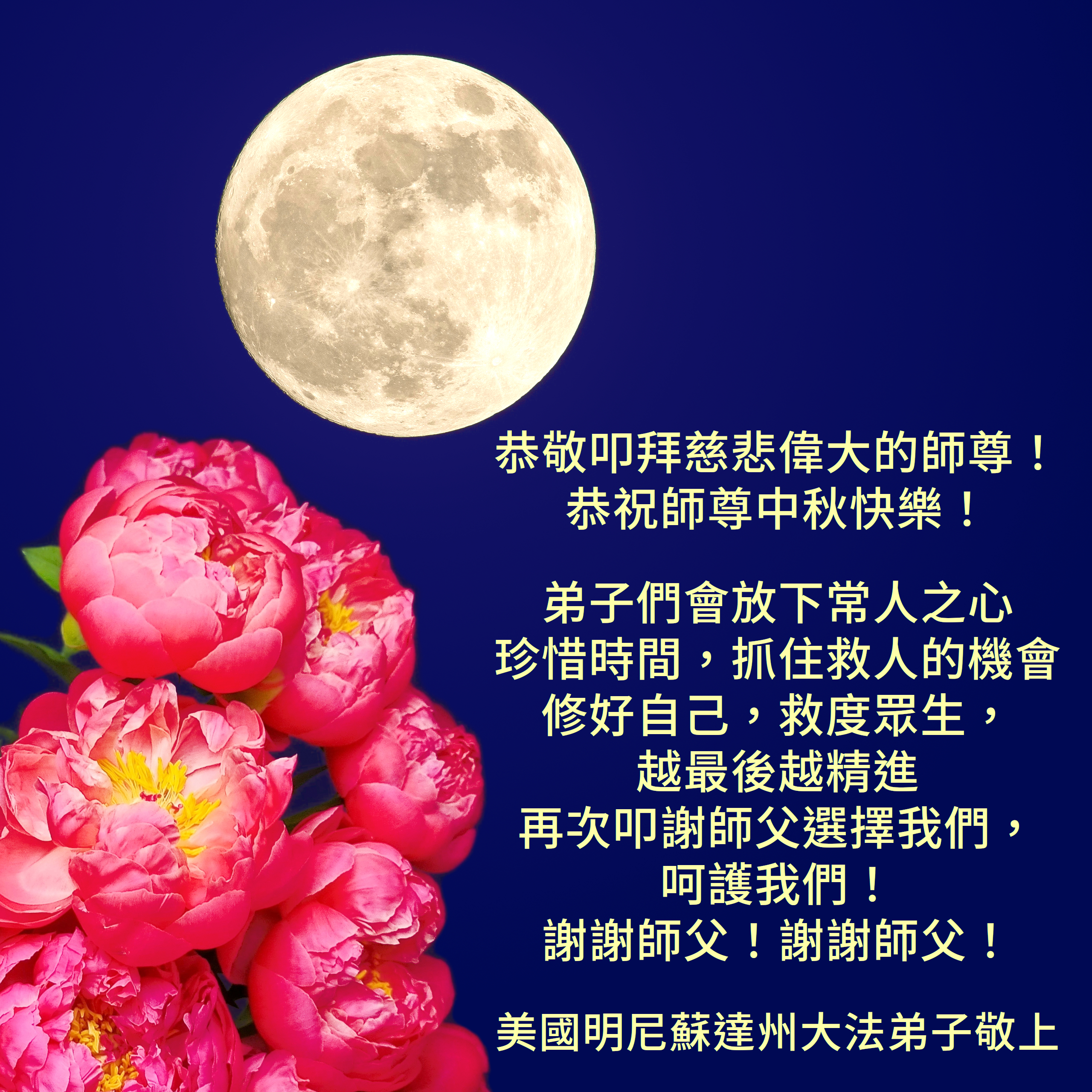 海上升明月,天涯共此时!值此中秋佳节,莫斯科大法弟子分外想念慈悲伟大的师尊,我们会努力精進再精進,助师正法多救人,惟愿师尊笑!