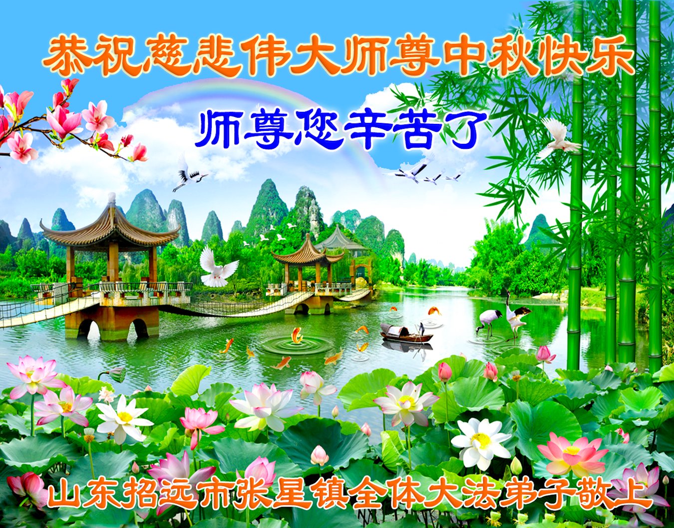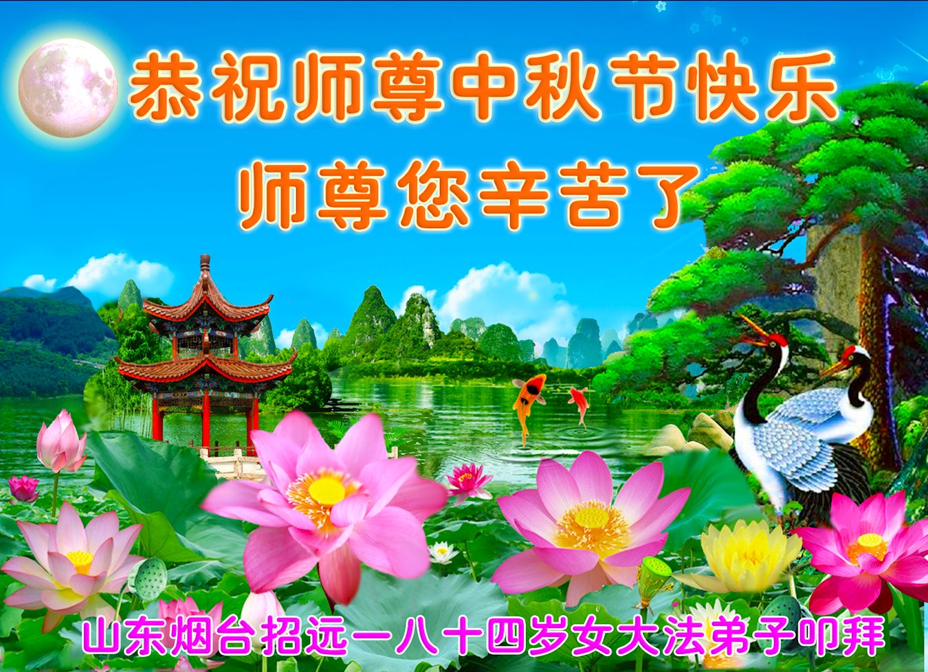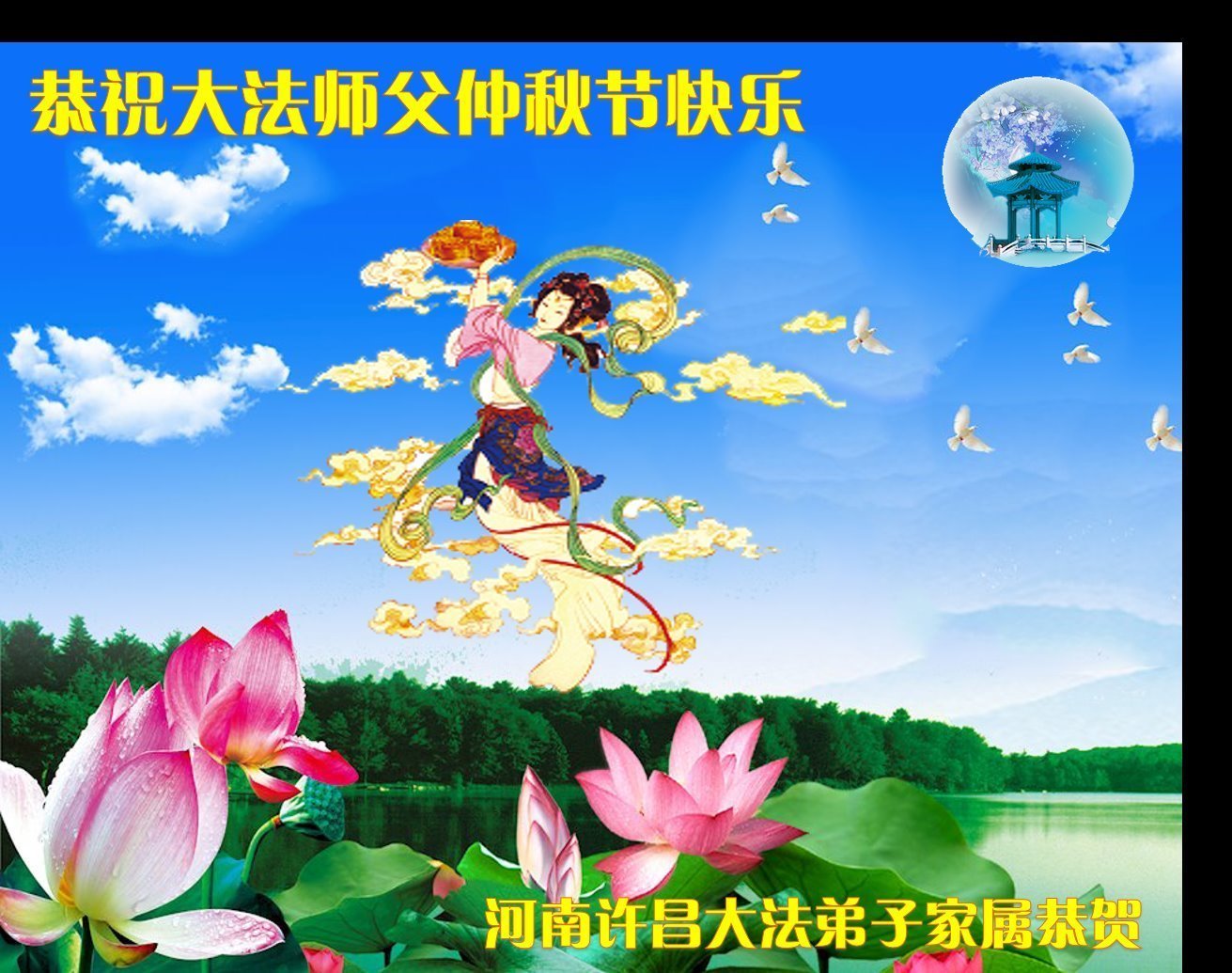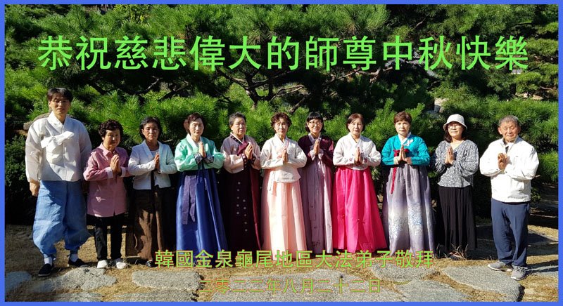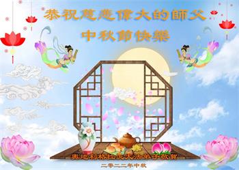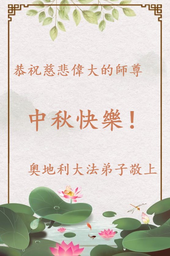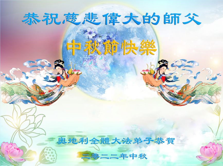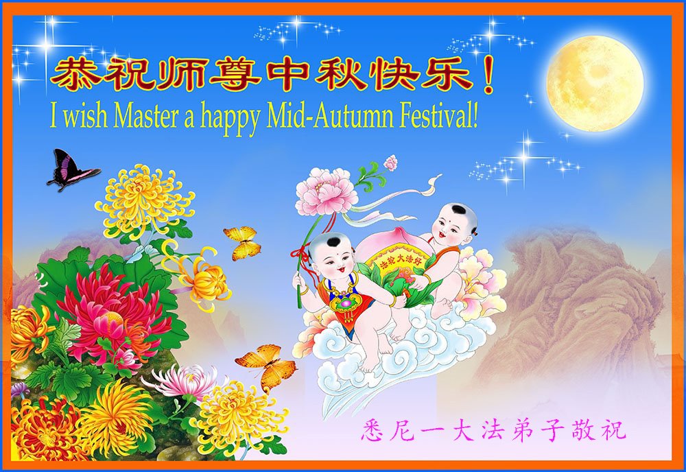世界各国大法弟子们恭祝慈悲伟大的师尊中秋好!下面是部份来自新西兰、德国、柬埔寨、澳大利亚、越南、中国、台湾、香港、日本、马来西亚、韩国、泰国、英国、芬兰、荷兰、奥地利、爱尔兰、加拿大、厄瓜多尔、法国、丹麦、瑞典、俄罗斯、美国、加蓬、印尼、罗马尼亚、瑞士、斯洛伐克、阿联酋、沙特阿拉伯、巴西、菲律宾、新加坡、澳门、比利时、西班牙、塞尔维亚、希腊、克罗地亚、挪威、波兰、乌克兰、伊朗、葡萄牙、波黑等46个国家和地区的大法弟子对慈悲伟大的师尊的诚挚问候。