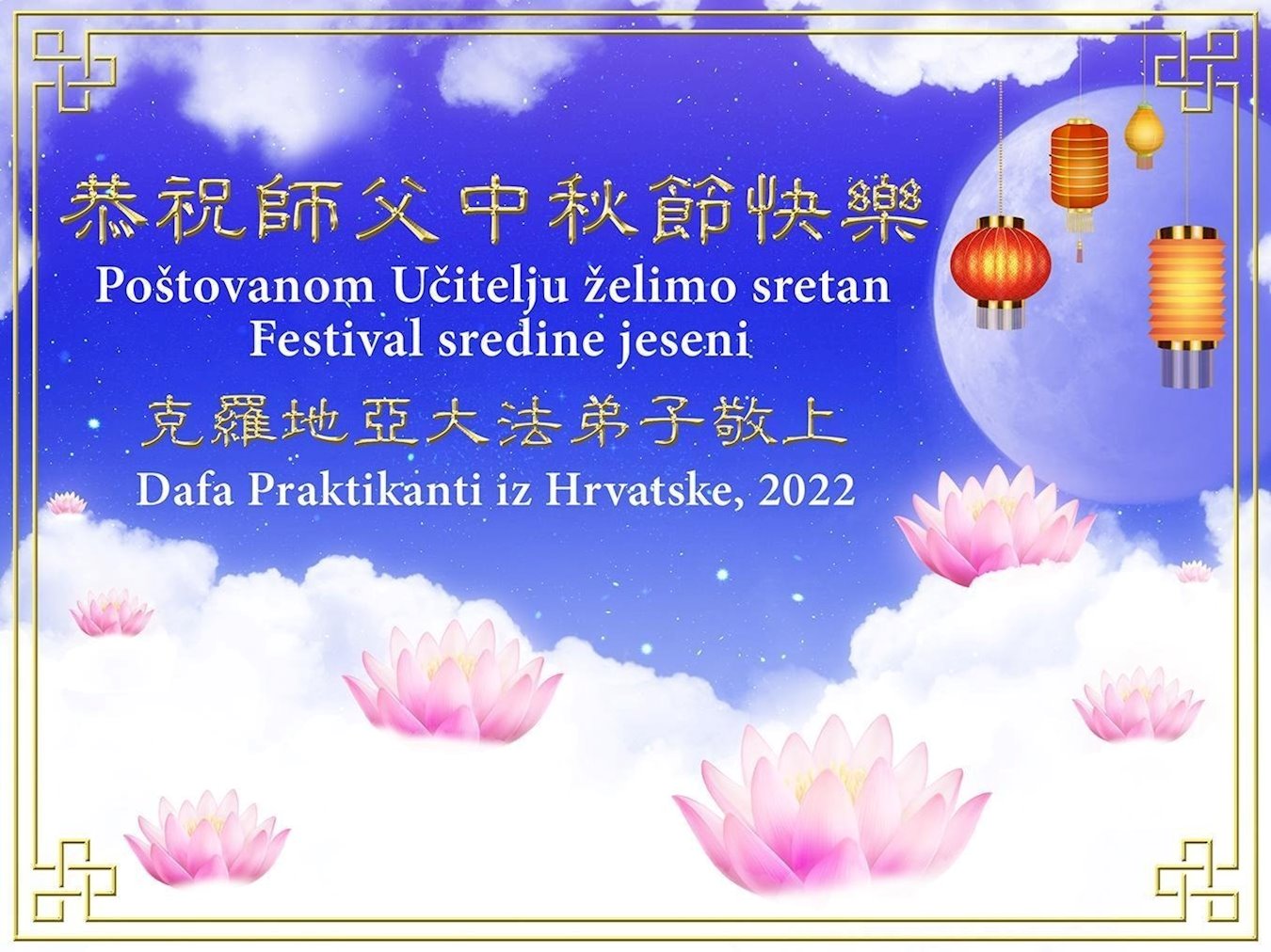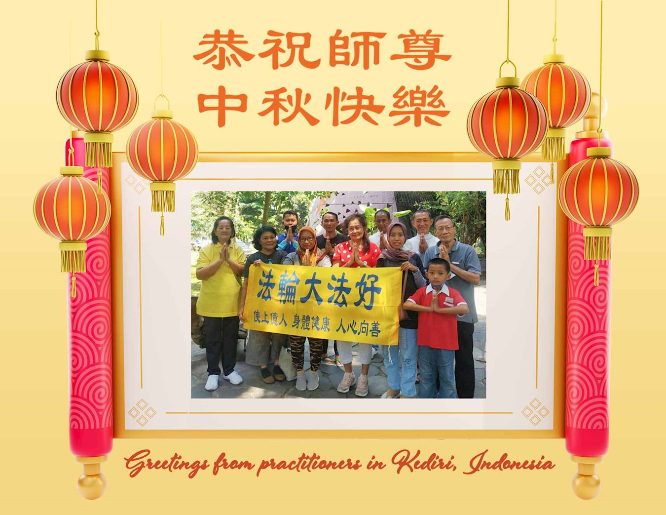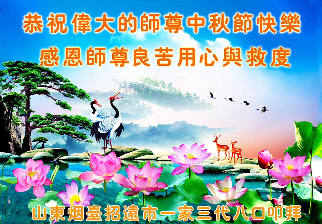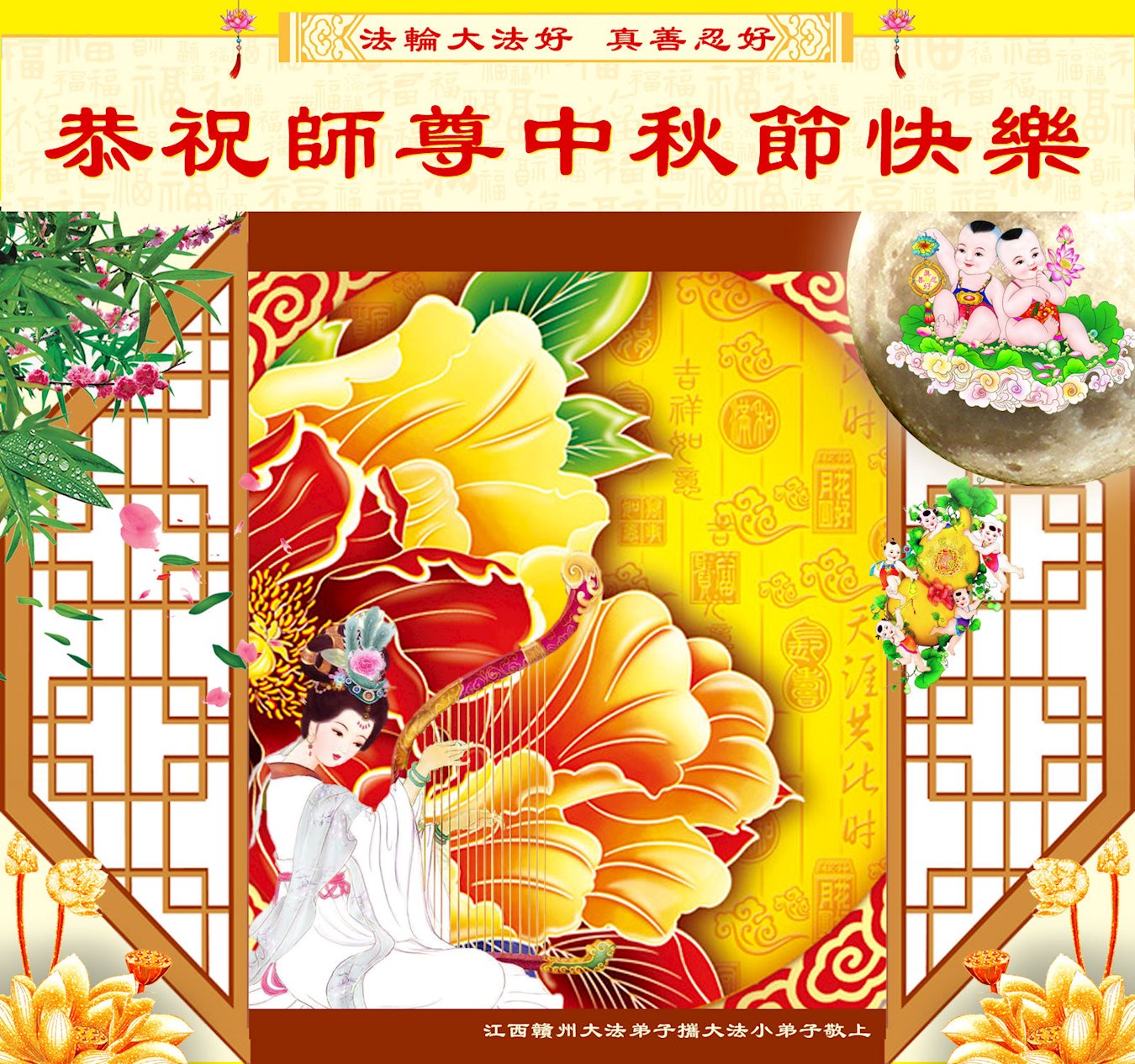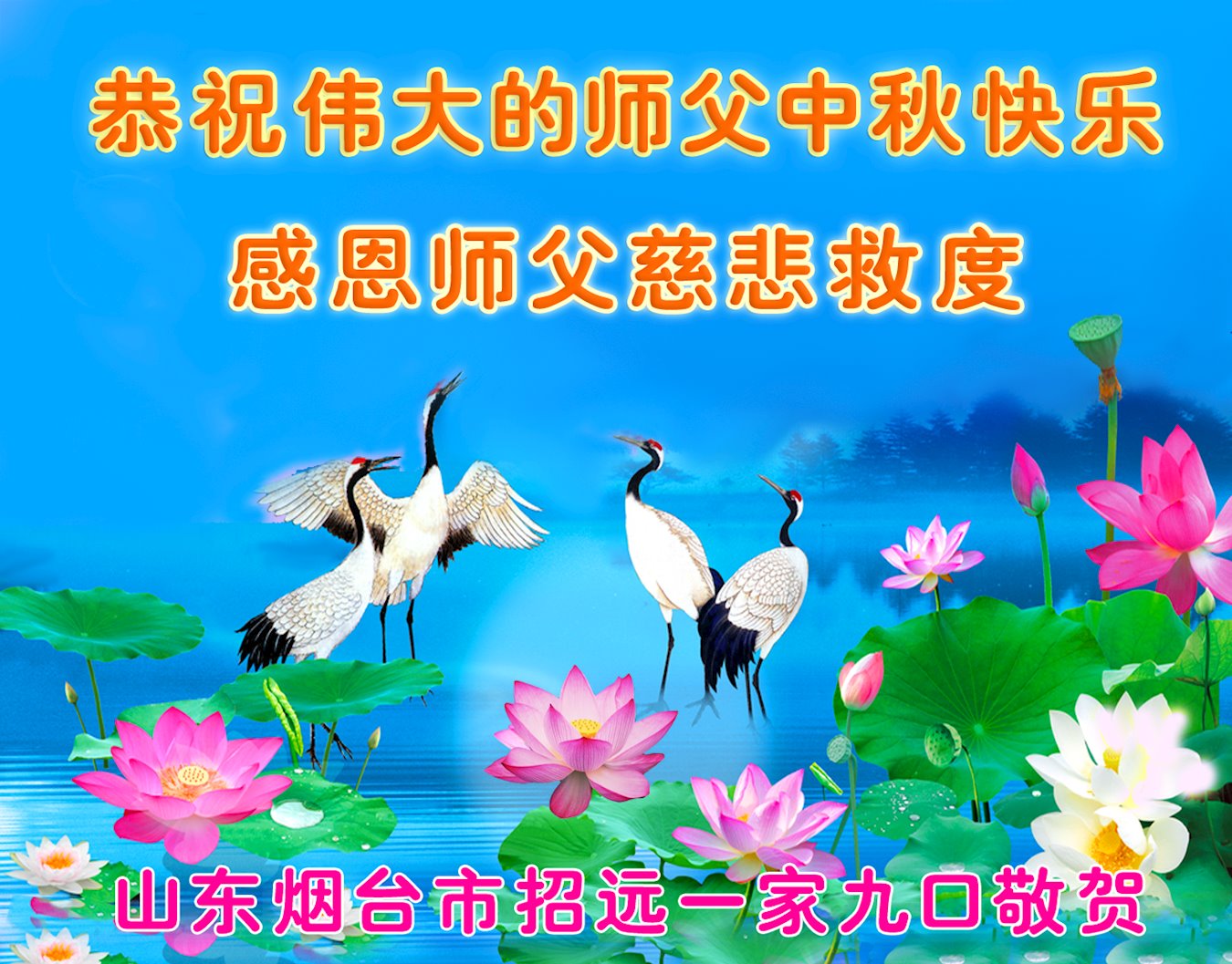 世界各国大法弟子们恭祝慈悲伟大的师尊中秋好!下面是部份来自新西兰、德国、柬埔寨、澳大利亚、越南、中国、台湾、香港、日本、马来西亚、韩国、泰国、英国、芬兰、荷兰、奥地利、爱尔兰、加拿大、厄瓜多尔、法国、丹麦、瑞典、俄罗斯、美国、加蓬、印尼、罗马尼亚、瑞士、斯洛伐克、阿联酋、沙特阿拉伯、巴西、菲律宾、新加坡、澳门、比利时、西班牙、塞尔维亚、希腊、克罗地亚、挪威、波兰、乌克兰、伊朗、葡萄牙、波黑等46个国家和地区的大法弟子对慈悲伟大的师尊的诚挚问候。