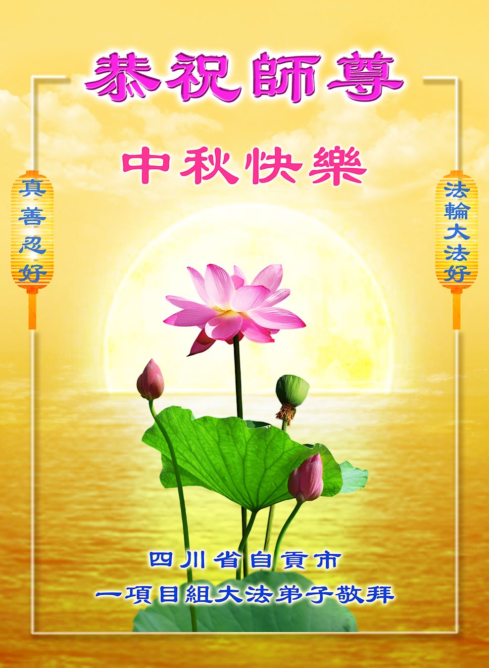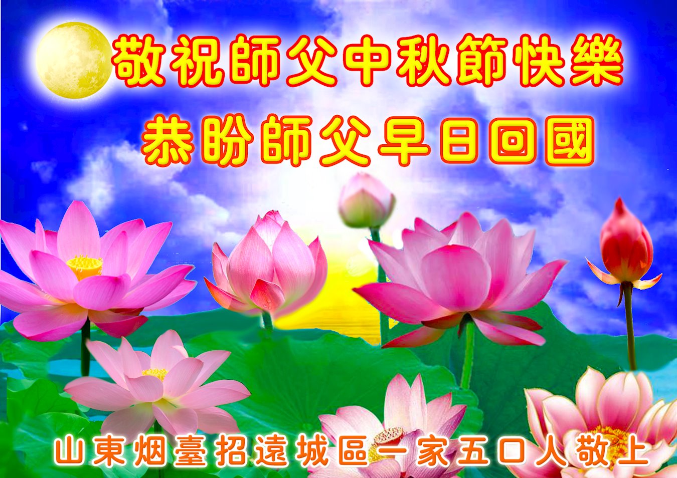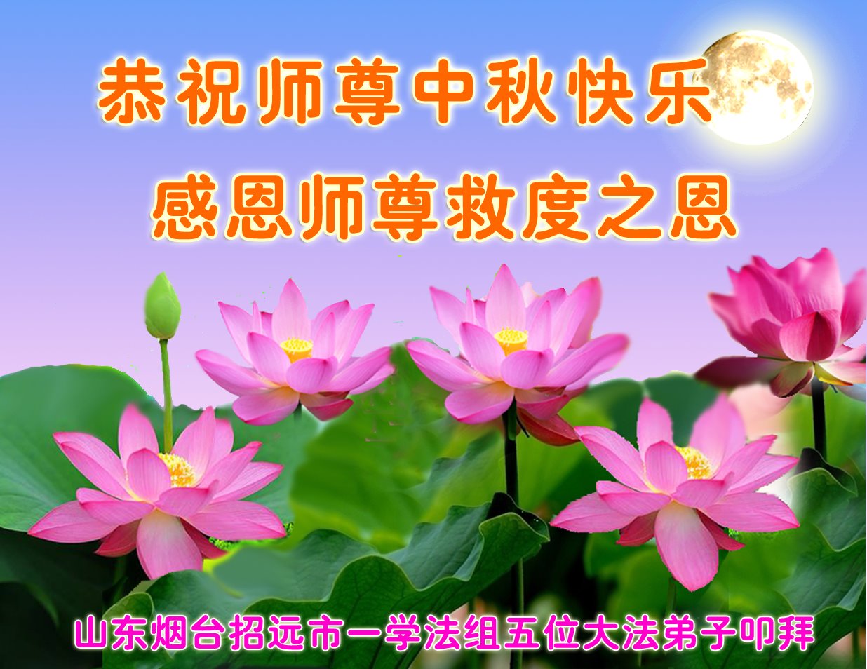 在这中秋佳节明月高悬之时,全世界的大法弟子更加思念我们慈悲伟大的师尊李洪志先生。大法洪传三十年,亿万大法徒在师尊的保护下,返本归真,助师正法,走过了阴霾密布的中共二十三年残酷迫害,大法弟子就象一朵朵圣洁的莲花,在世界各地竞相开放,讲真相、传播大法的福音,使各国人民沐浴在法轮大法的佛光普照之下。