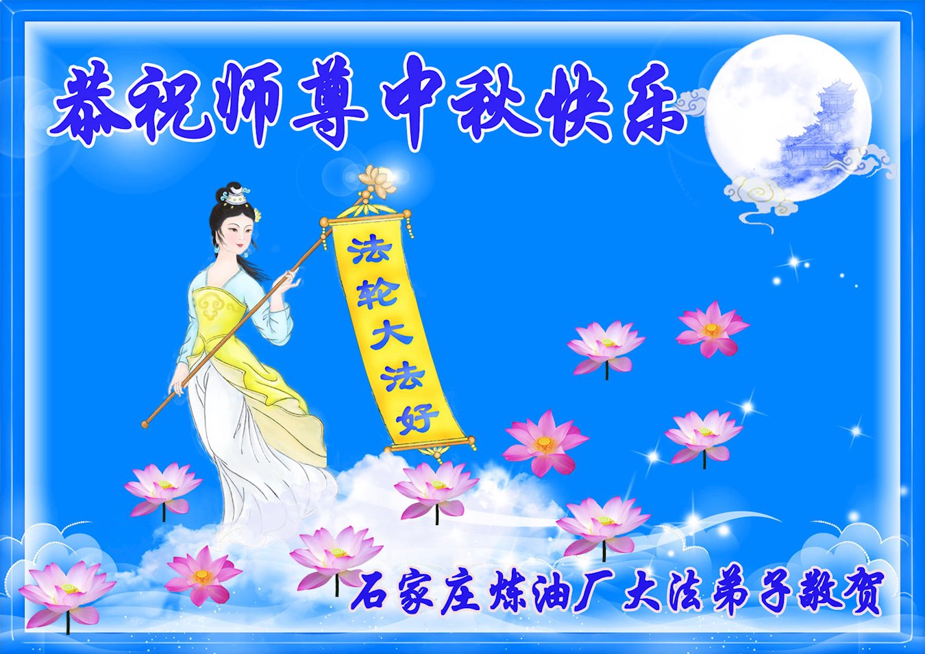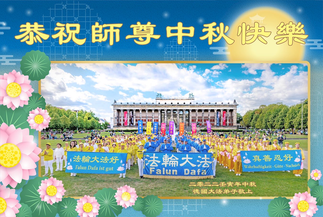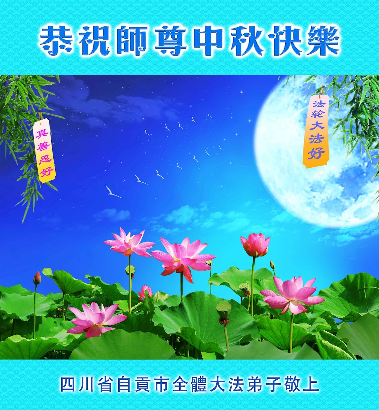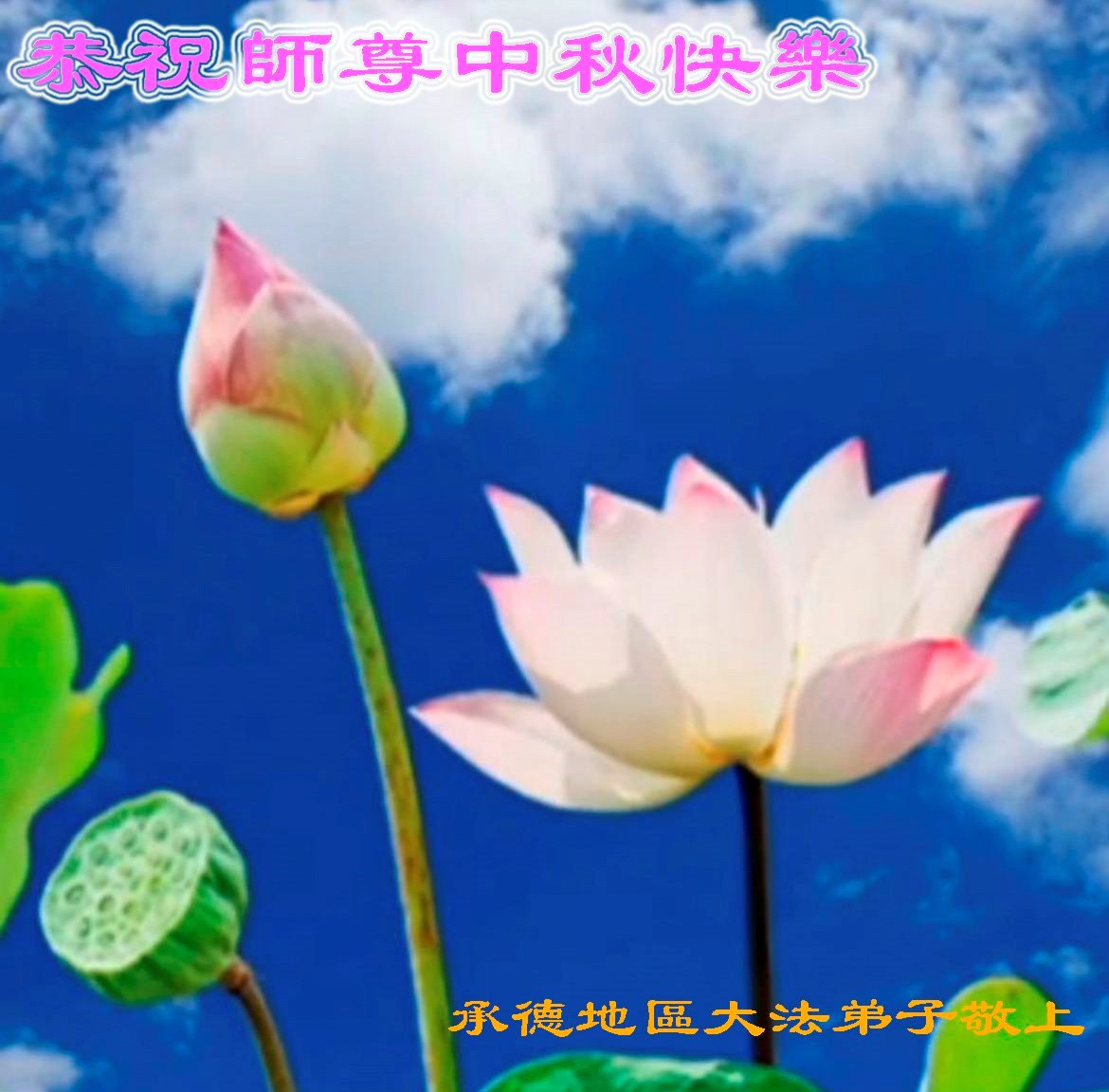 在这中秋佳节明月高悬之时,全世界的大法弟子更加思念我们慈悲伟大的师尊李洪志先生。大法洪传三十年,亿万大法徒在师尊的保护下,返本归真,助师正法,走过了阴霾密布的中共二十三年残酷迫害,大法弟子就象一朵朵圣洁的莲花,在世界各地竞相开放,讲真相、传播大法的福音,使各国人民沐浴在法轮大法的佛光普照之下。