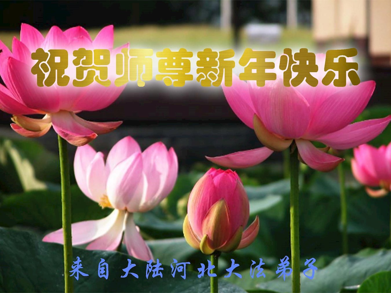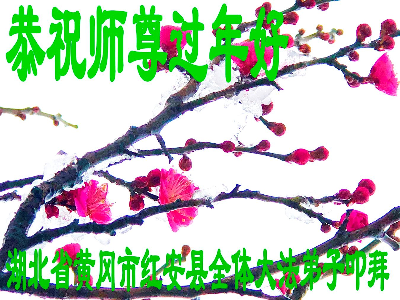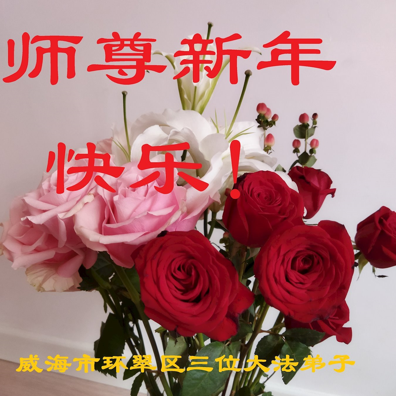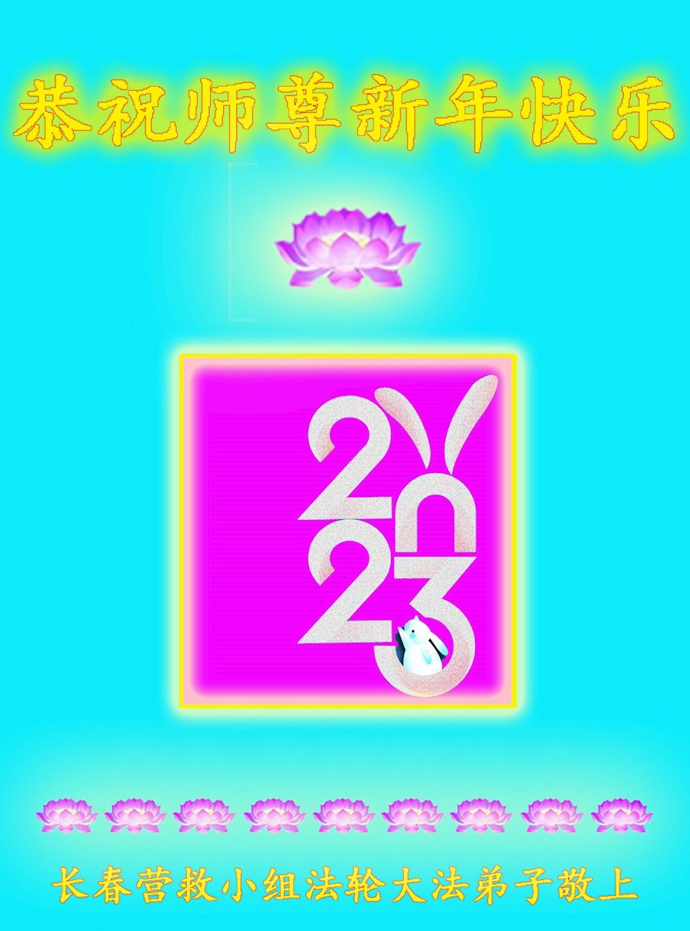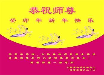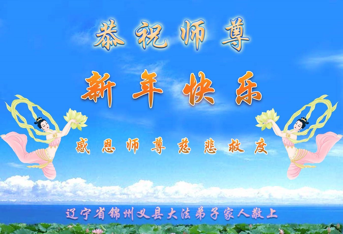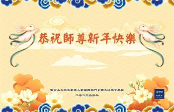 新年到来之际,我们夫妻俩老年大法弟子恭祝师父新年快乐!师父啊!弟子们想念您!助师救人是弟子们的使命不敢忘,待红魔除尽,解体恶党,法正人间迎师回中原!春回大陆师徒大团圆!