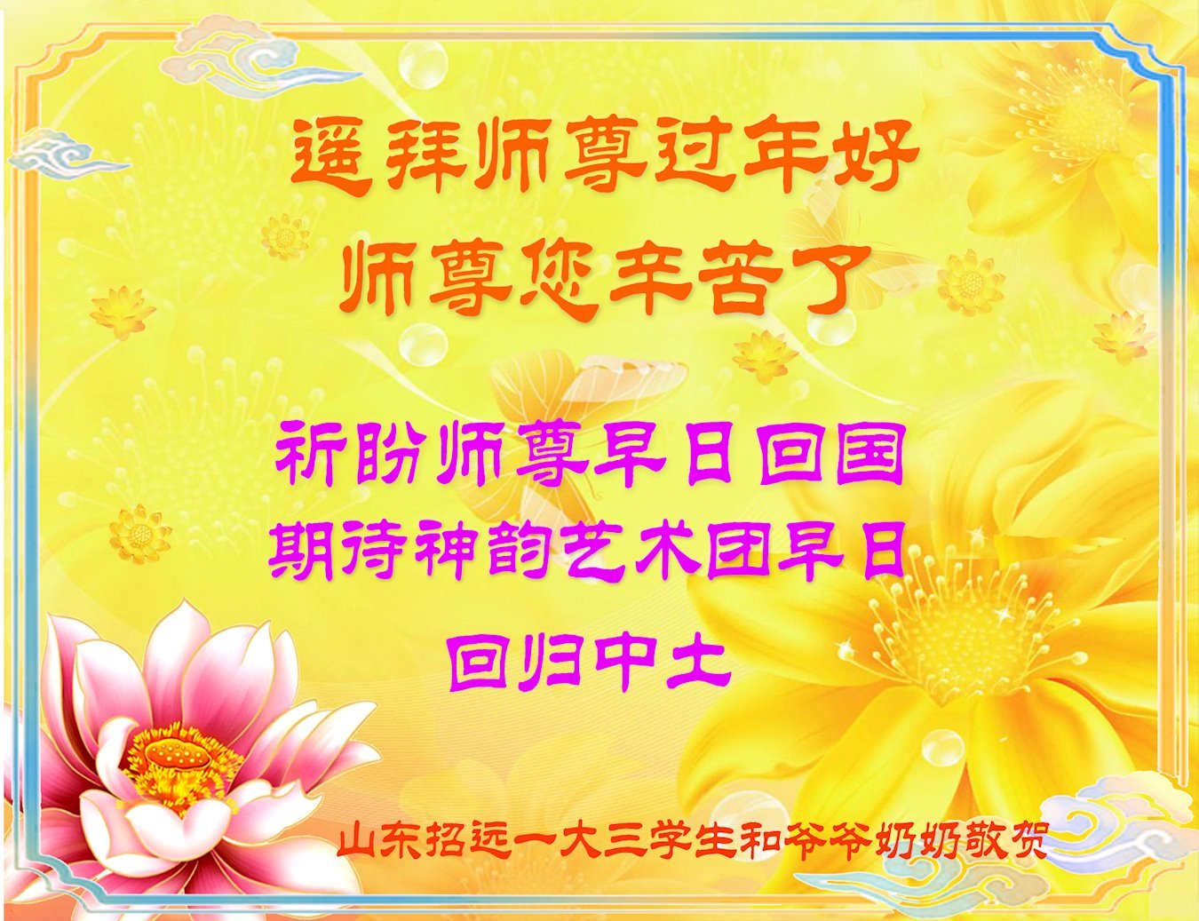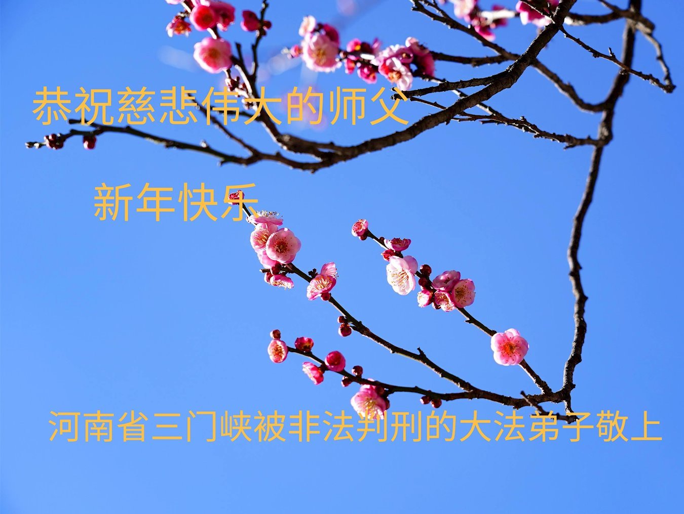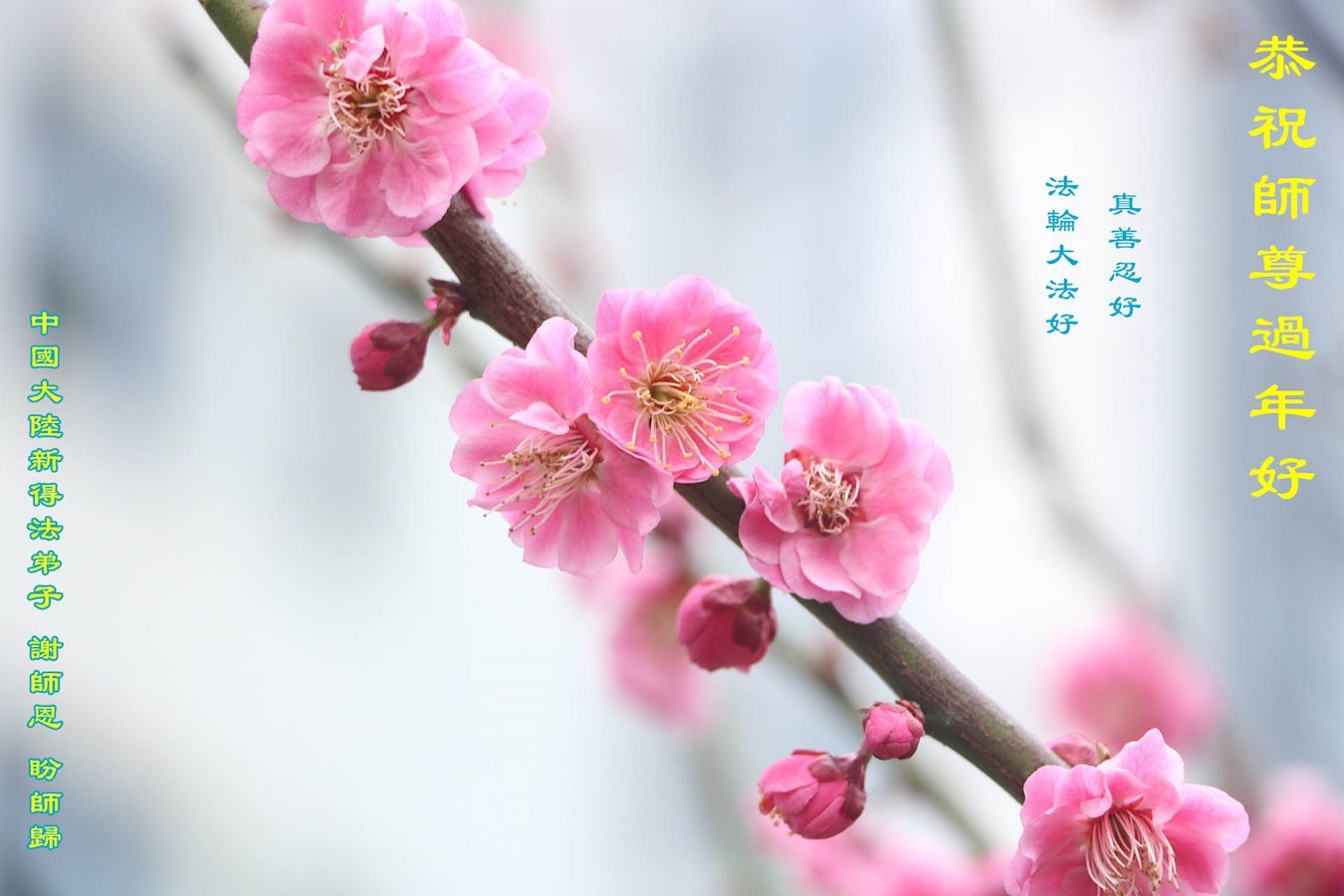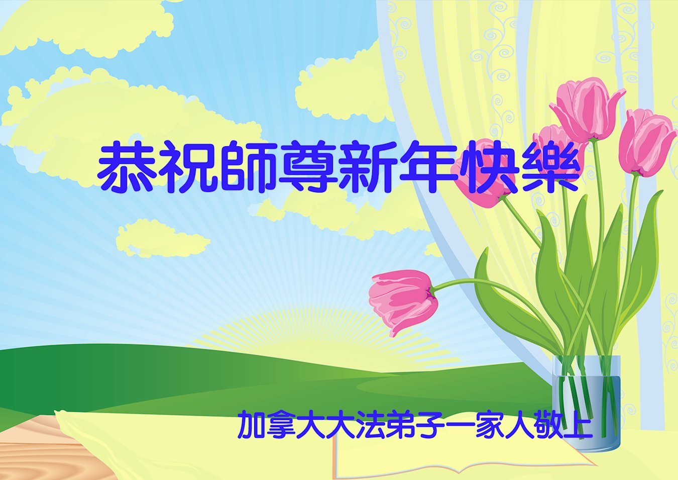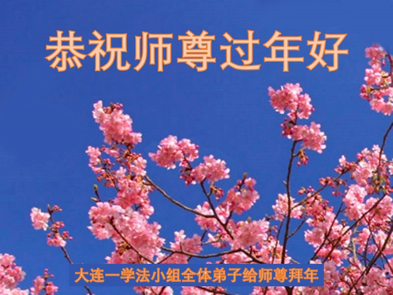 新年到来之际,我们夫妻俩老年大法弟子恭祝师父新年快乐!师父啊!弟子们想念您!助师救人是弟子们的使命不敢忘,待红魔除尽,解体恶党,法正人间迎师回中原!春回大陆师徒大团圆!