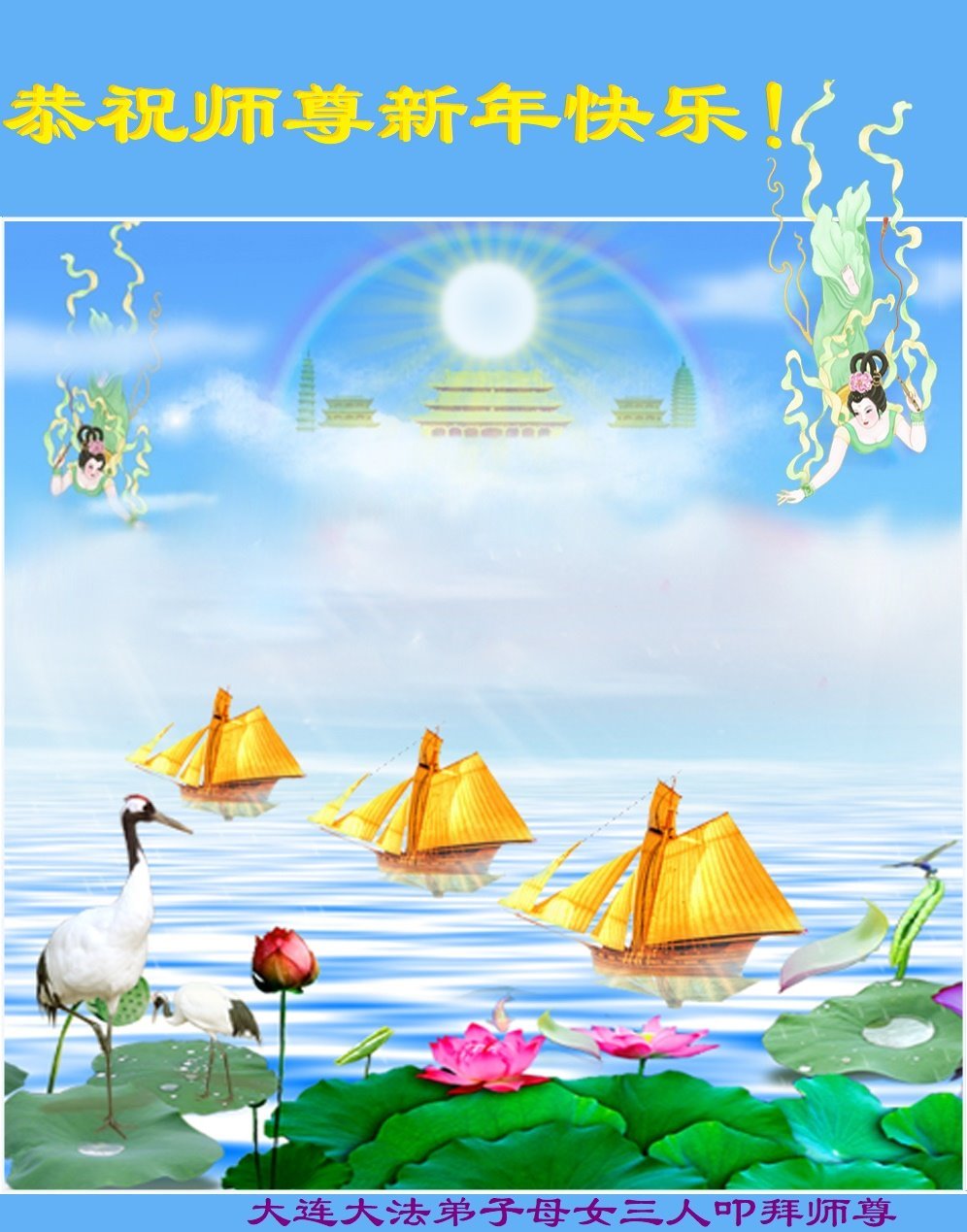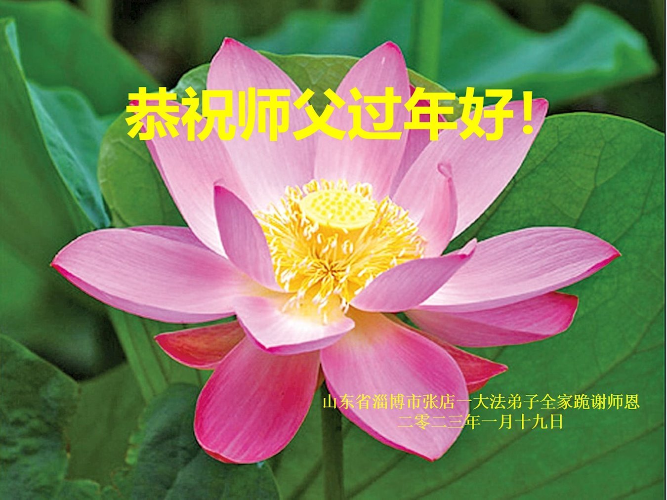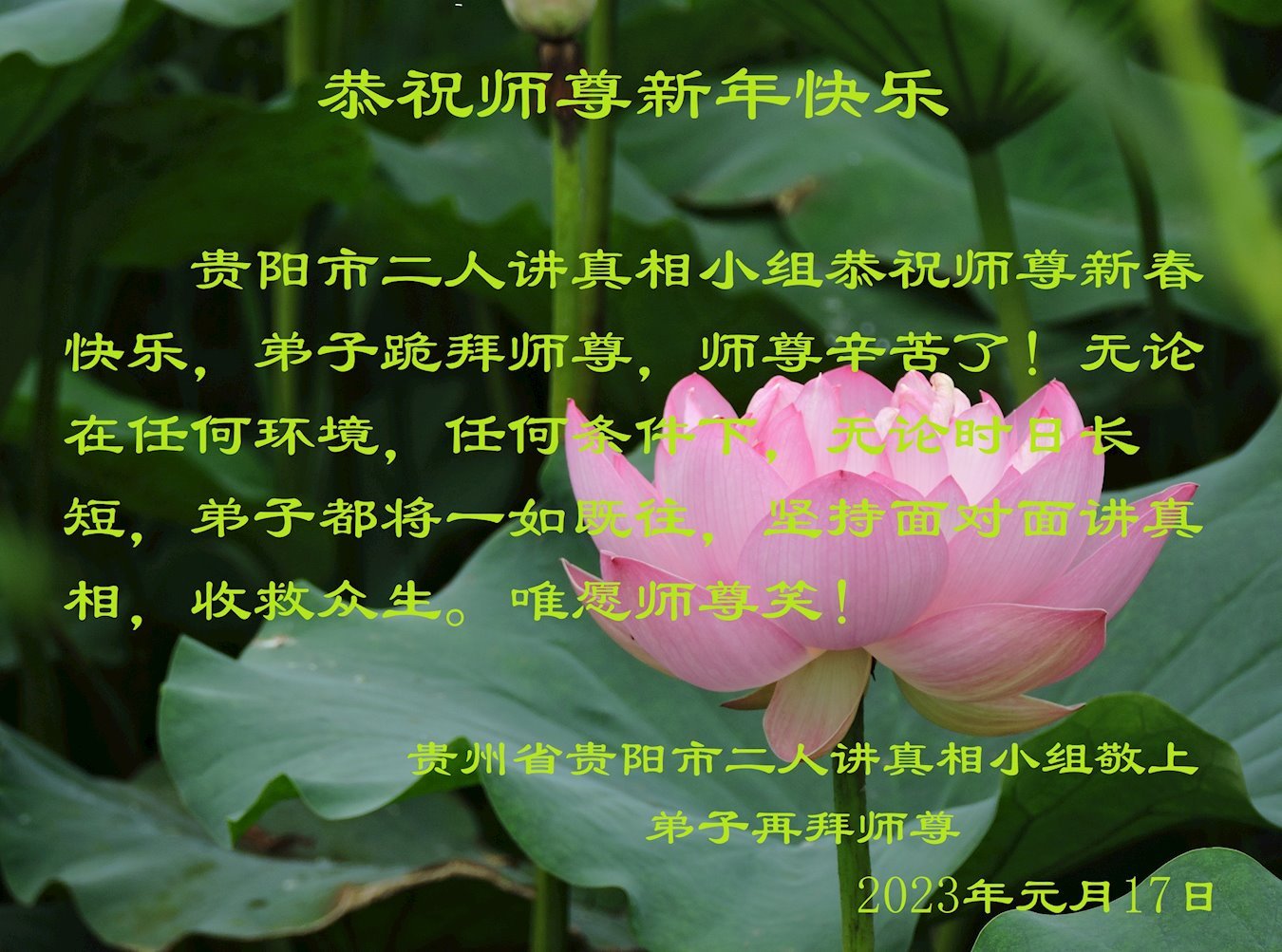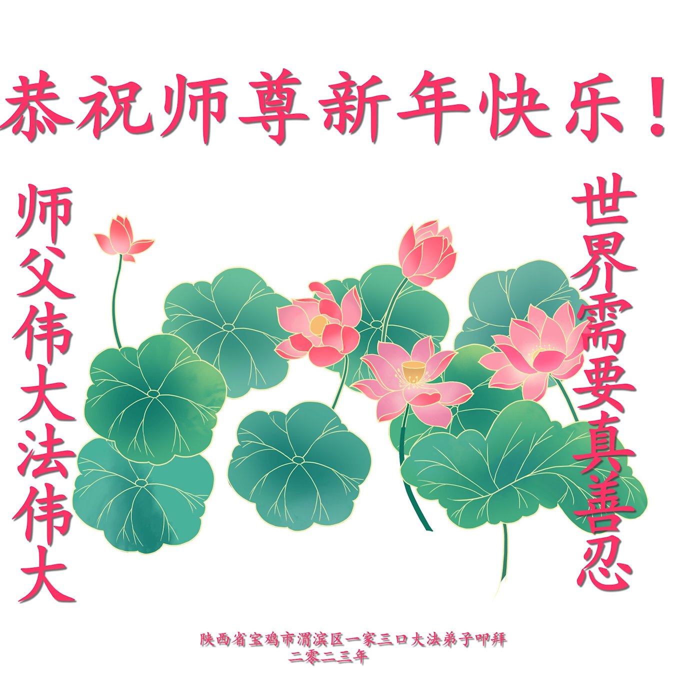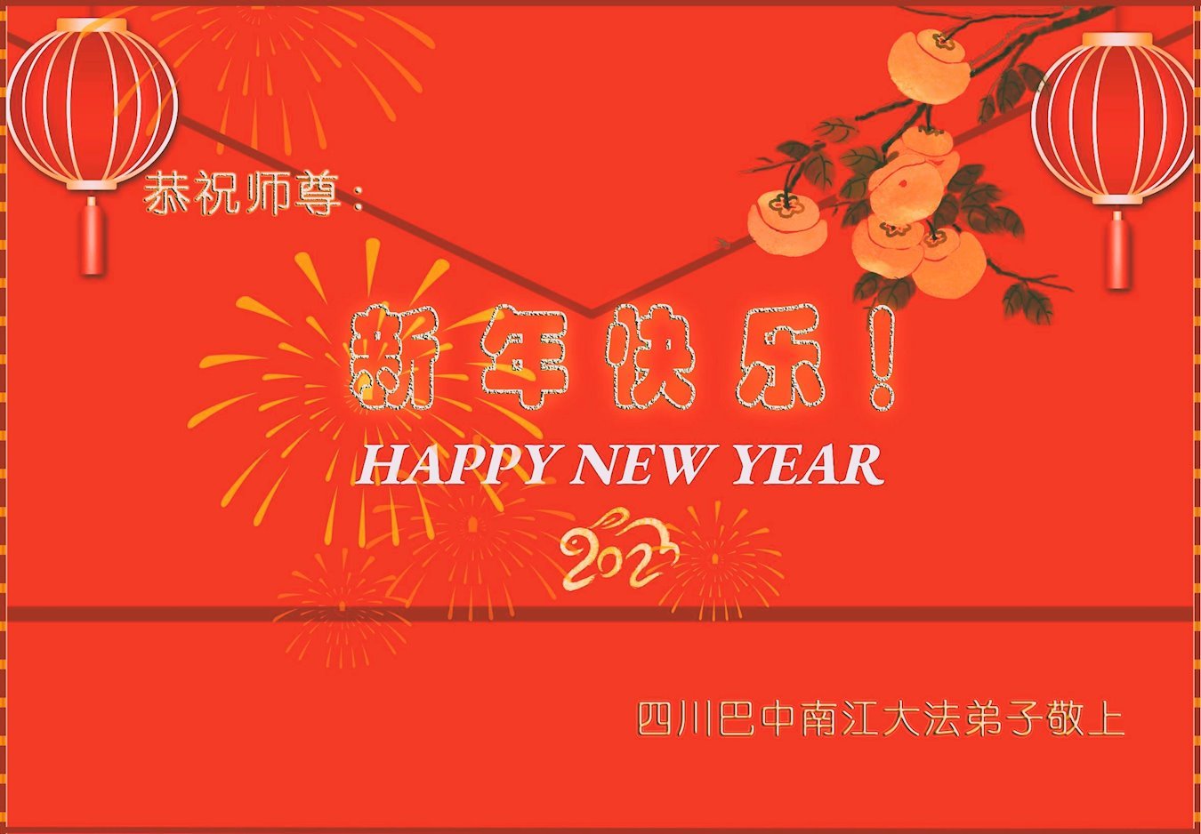 新年到来之际,我们夫妻俩老年大法弟子恭祝师父新年快乐!师父啊!弟子们想念您!助师救人是弟子们的使命不敢忘,待红魔除尽,解体恶党,法正人间迎师回中原!春回大陆师徒大团圆!