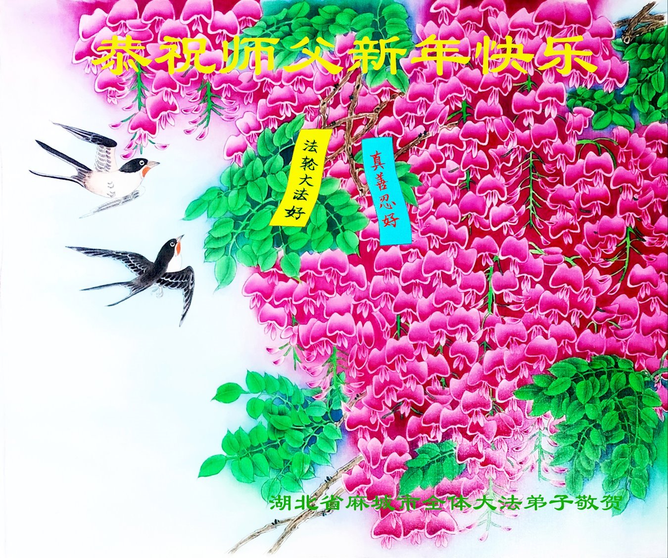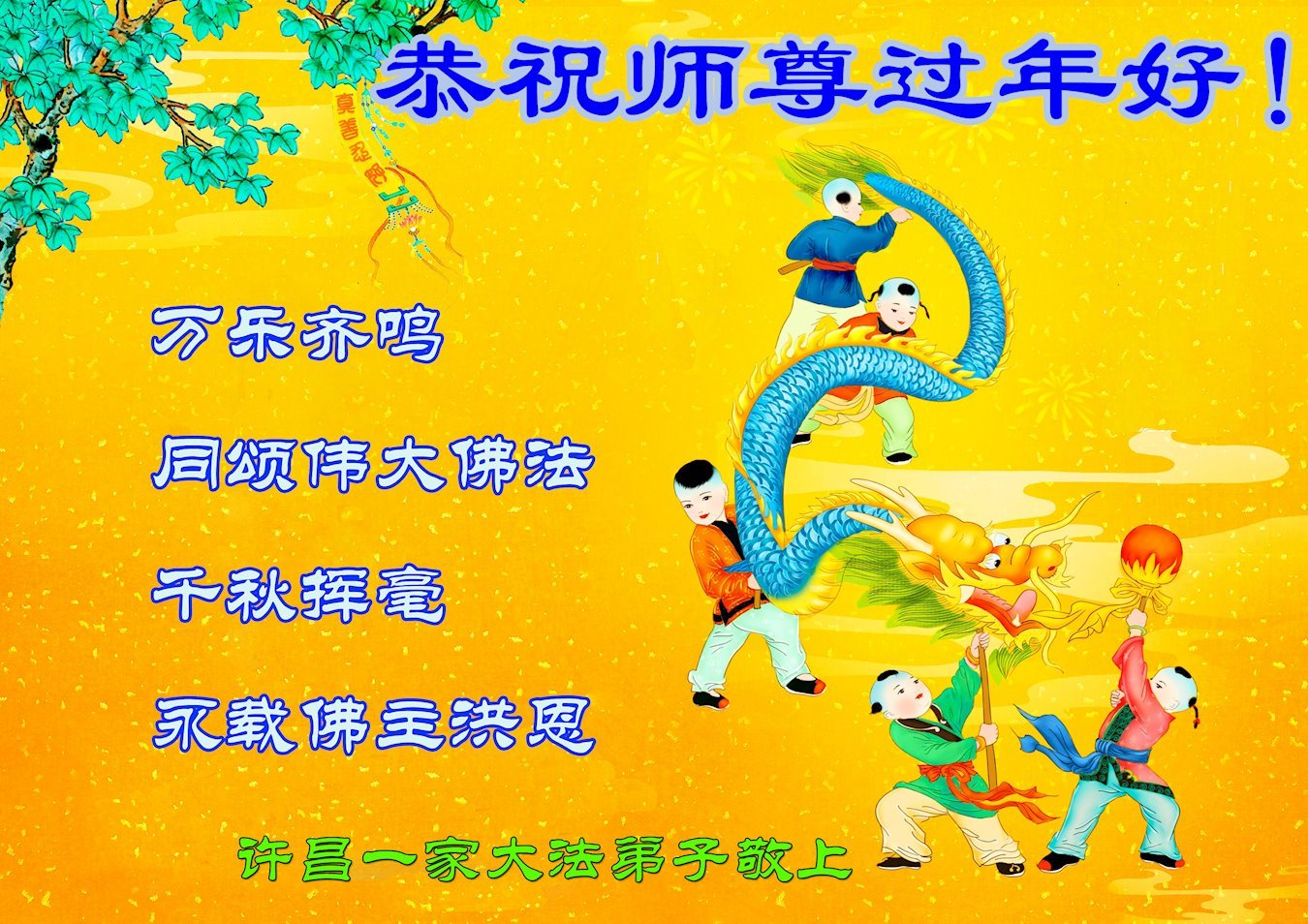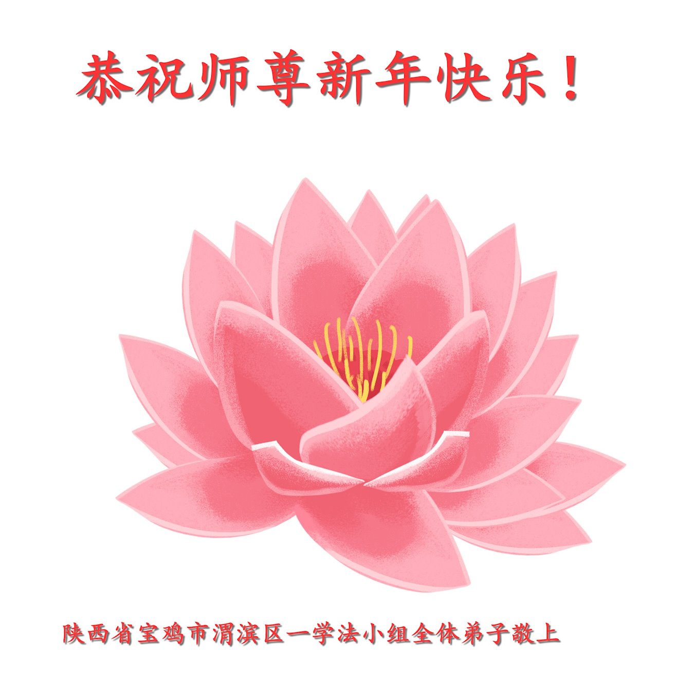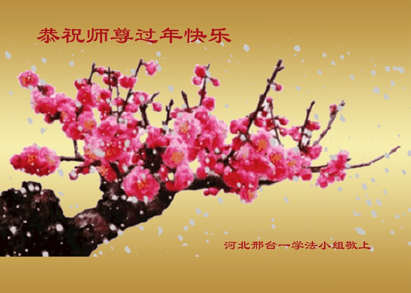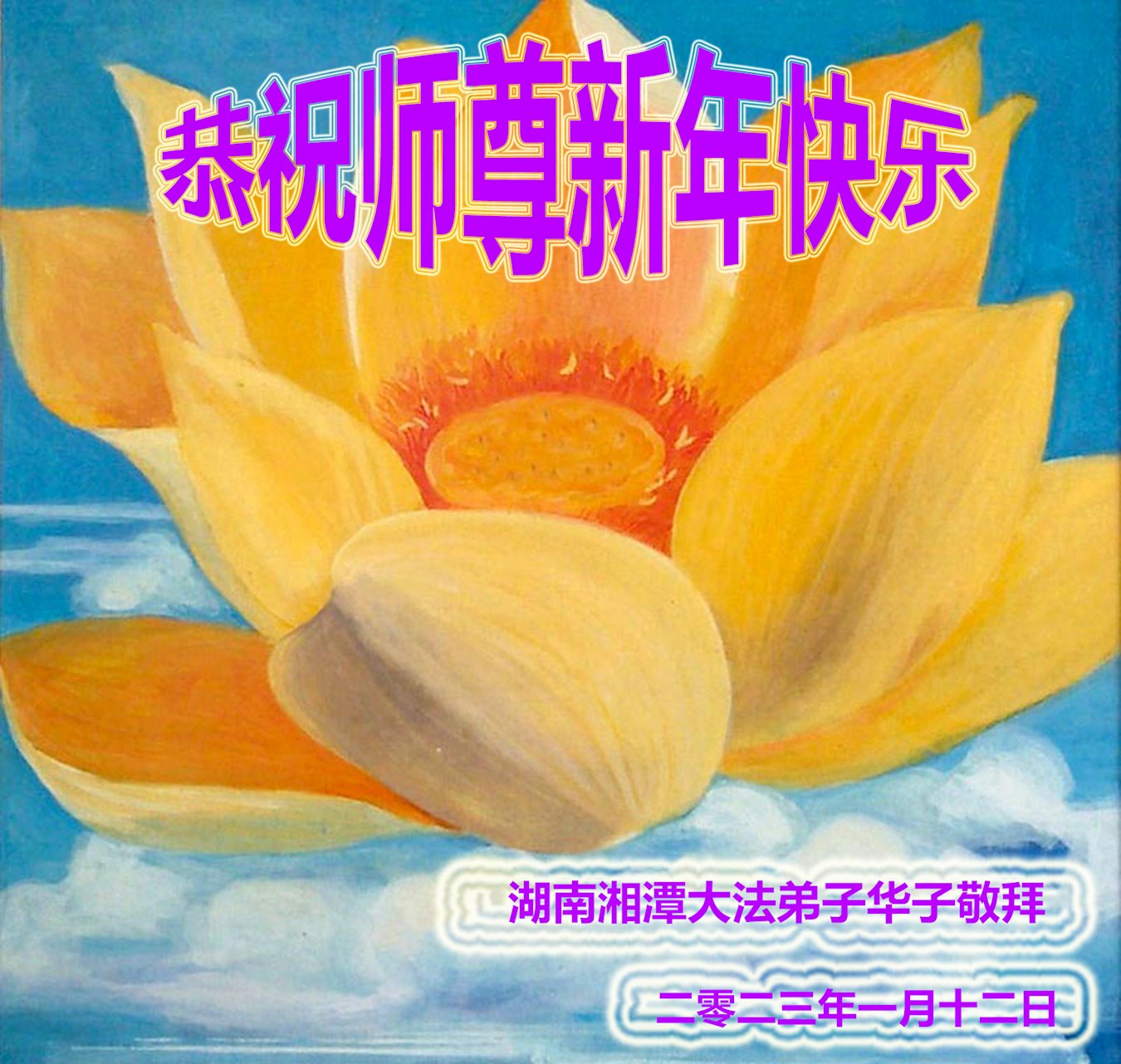 新年到来之际,我们夫妻俩老年大法弟子恭祝师父新年快乐!师父啊!弟子们想念您!助师救人是弟子们的使命不敢忘,待红魔除尽,解体恶党,法正人间迎师回中原!春回大陆师徒大团圆!