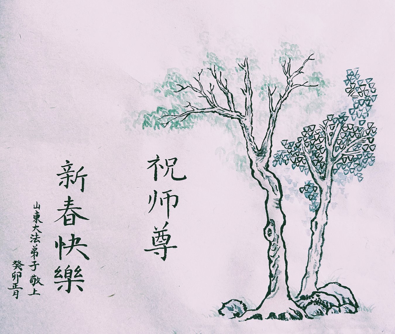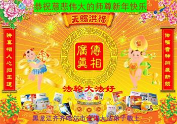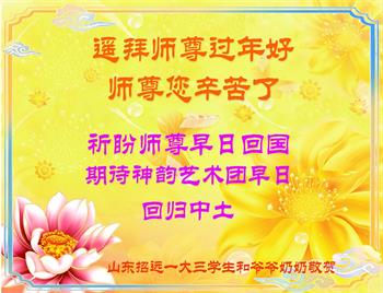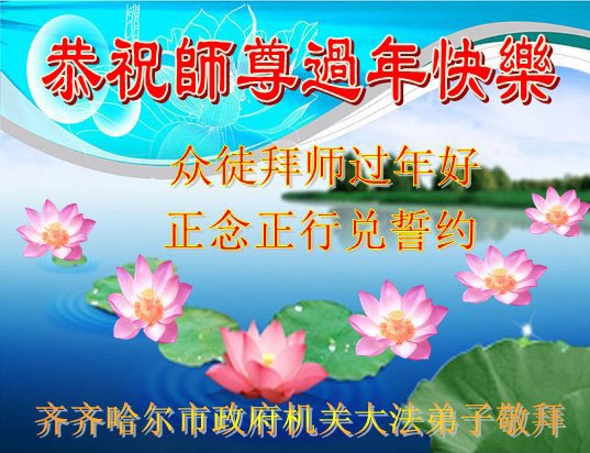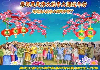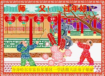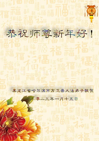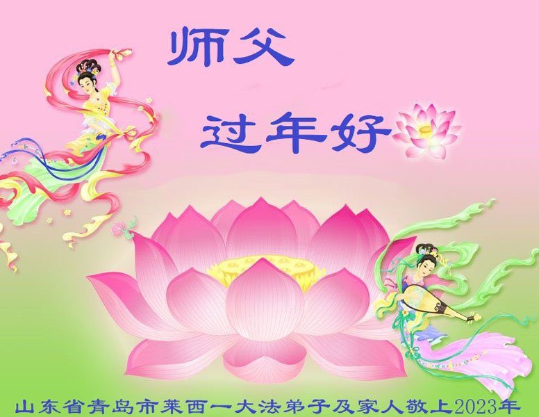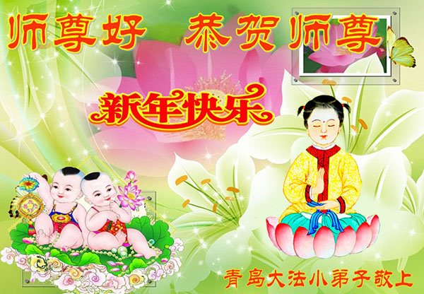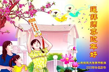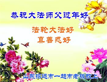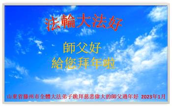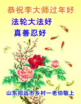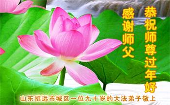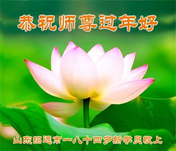 山东省诸城市坚持讲真相的八十九岁大法弟子说:“我听师父的话,参加集体学法,外出当面讲真相救人。新年到了,我真诚的问候师父好,祝师父节日愉快!”