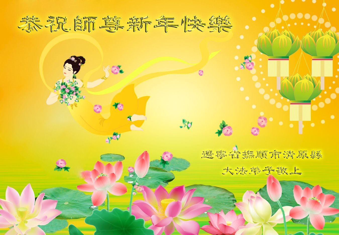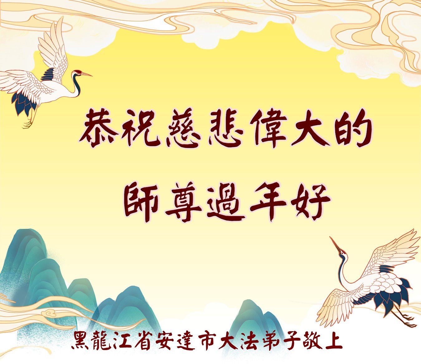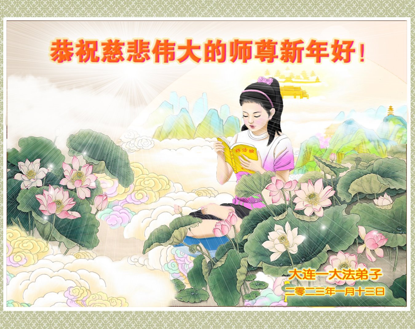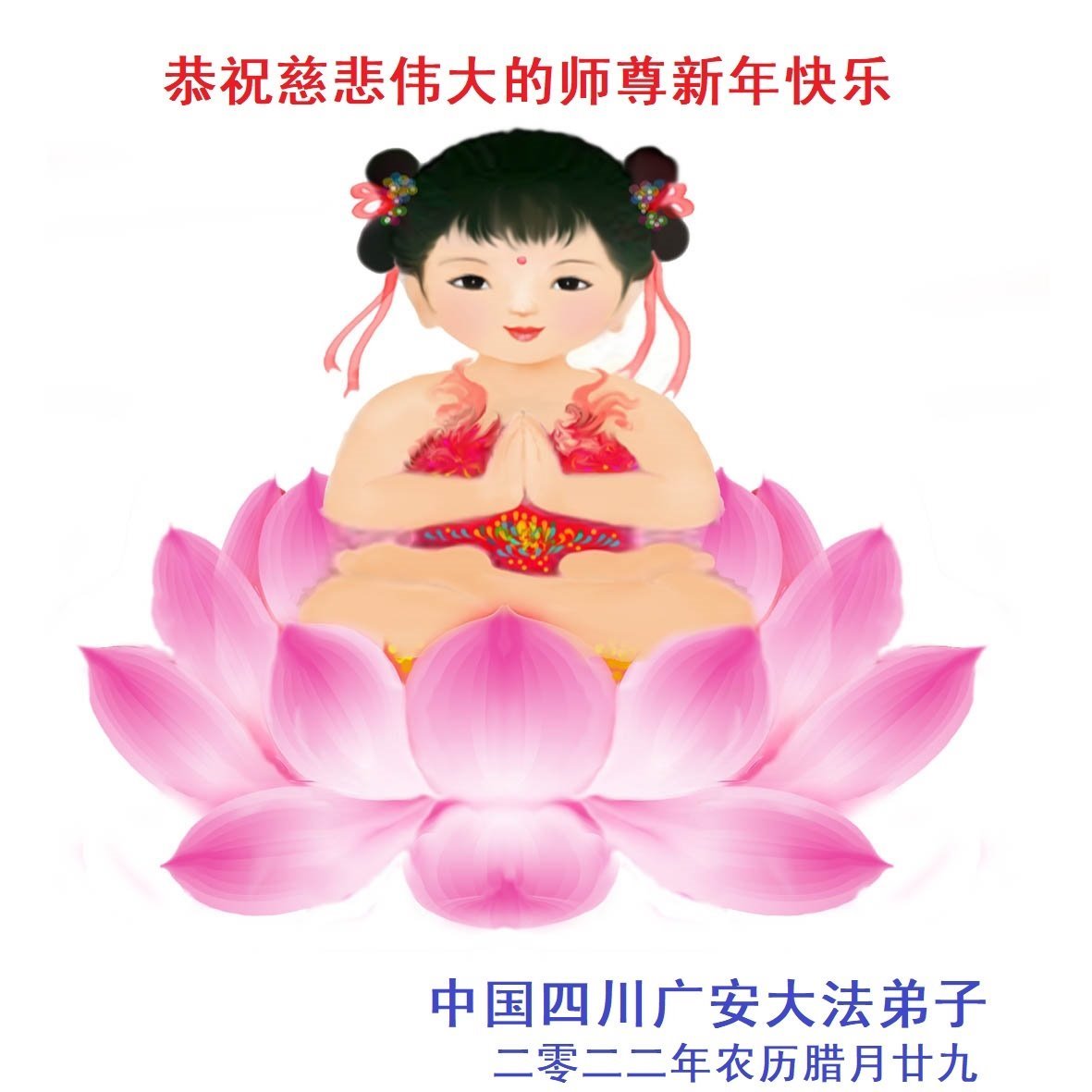 在这新年来临之际,弟子拜谢慈悲伟大的师父!师父新年好!师父新年快乐!弟子修炼十多年来受益良多,弟子没有珍贵的礼物敬献师尊,弟子只有感恩的心,谢谢师尊!弟子感恩师尊的慈悲苦度!慈悲的师尊您辛苦了!您的浩荡佛恩弟子无力报答,弟子要听您的话,走好您安排的路,做好三件事,要更加精進,圆满随师还。