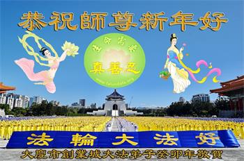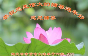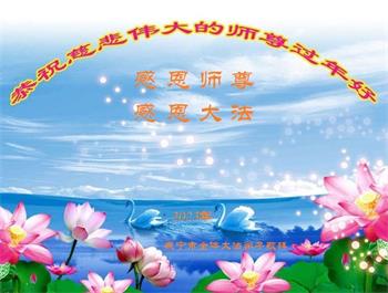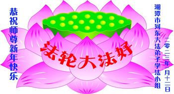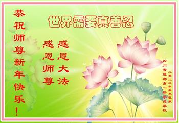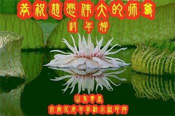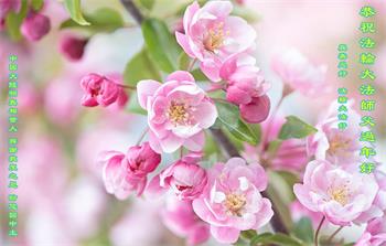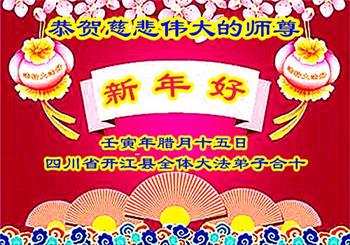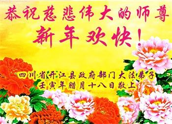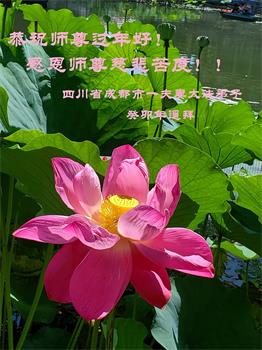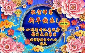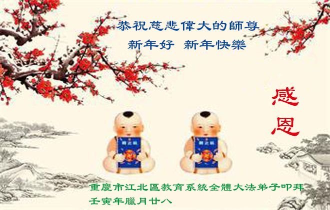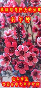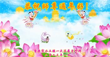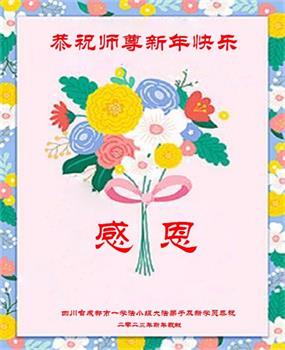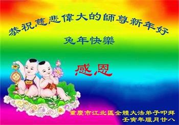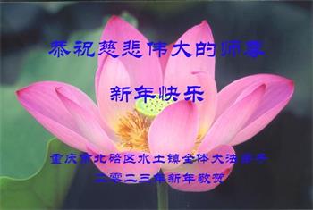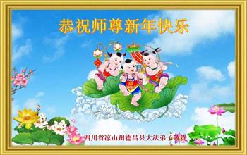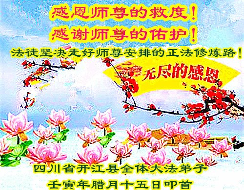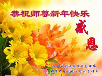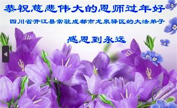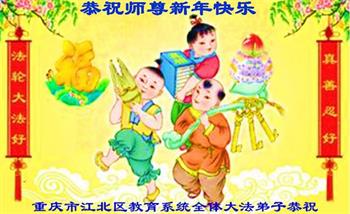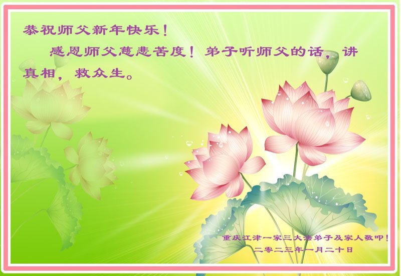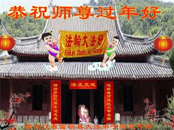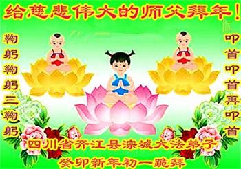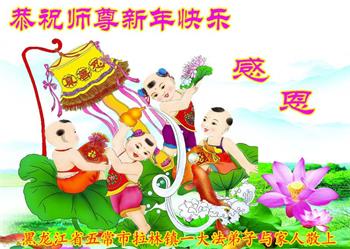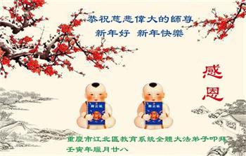 重庆市潼南区一大法弟子在贺词中表示:弟子八十一岁了。当年病魔把我拖到生命边沿时,恩师把我从地狱里捞起,传给了我宇宙大法,使我明白了人生的意义和真正目地,给了我一个健康的身体。我家四代同堂,儿孙们都相信法轮大法好!
