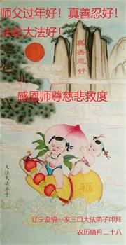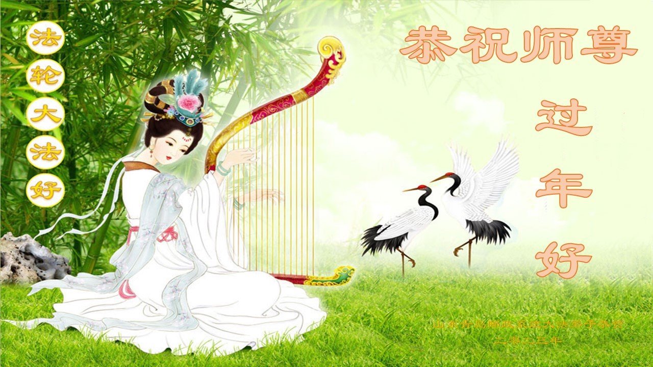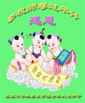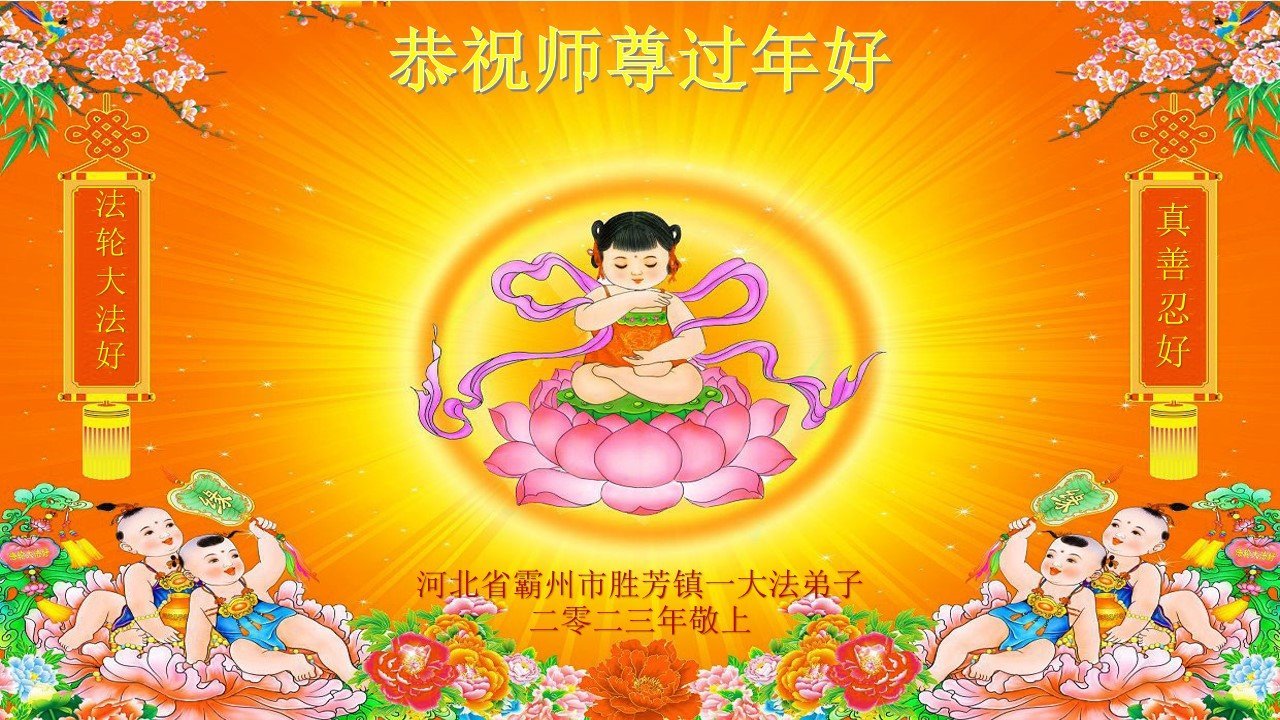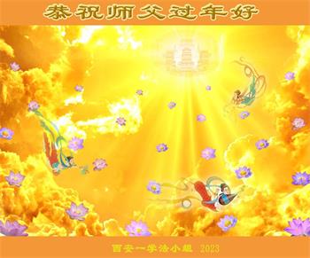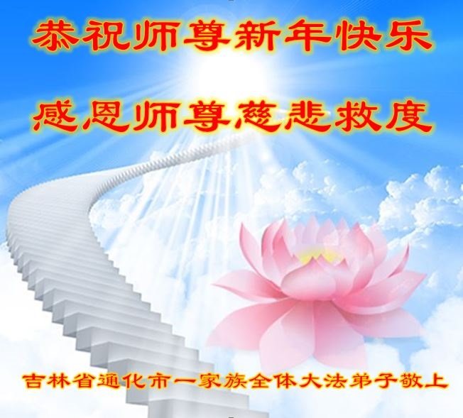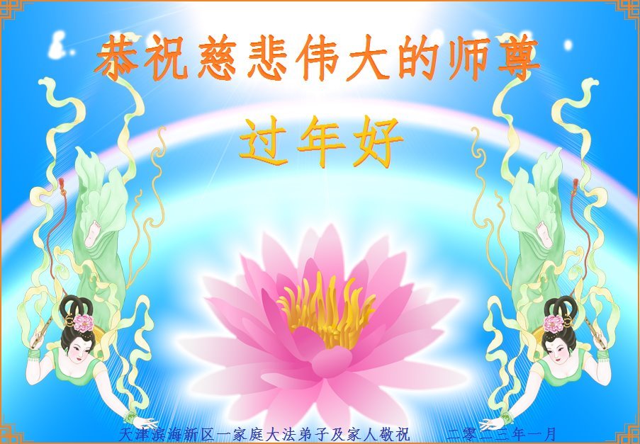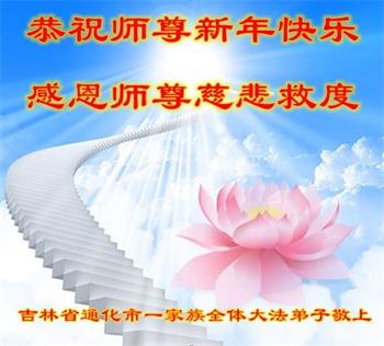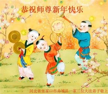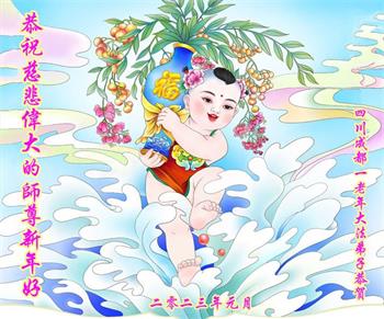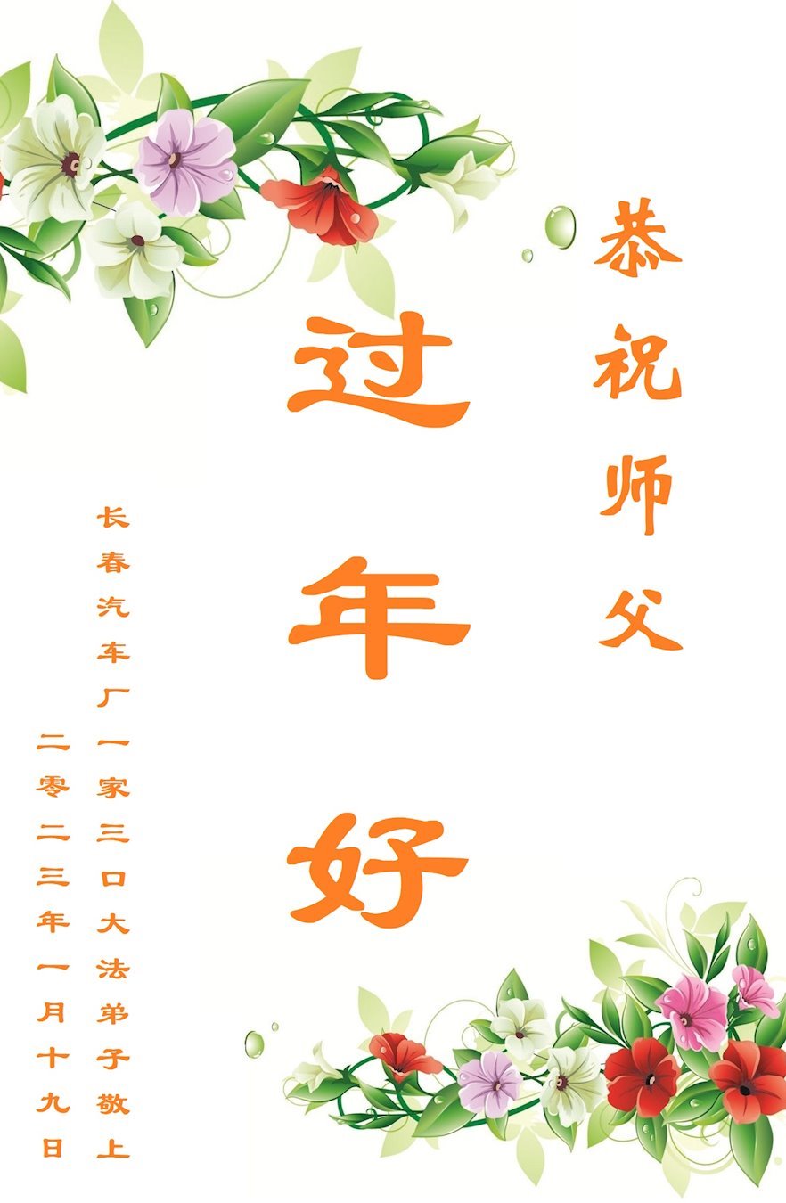 我是一九九六年得法修炼的老大法弟子,今年九十岁了,在二十多年跌跌撞撞的修炼中,虽很辛苦也很幸福,家人也见证了我一些遇难呈祥的神奇美好,都支持我修炼,四世同堂,母慈子孝,也使全家受益得福报。借此代表全家人恭祝师尊过年好!师尊辛苦了!谢谢师尊!