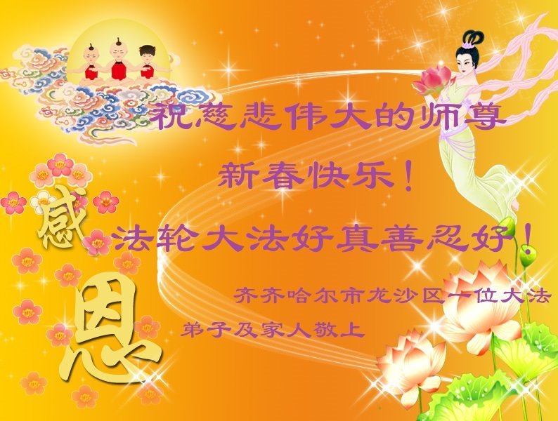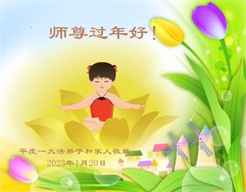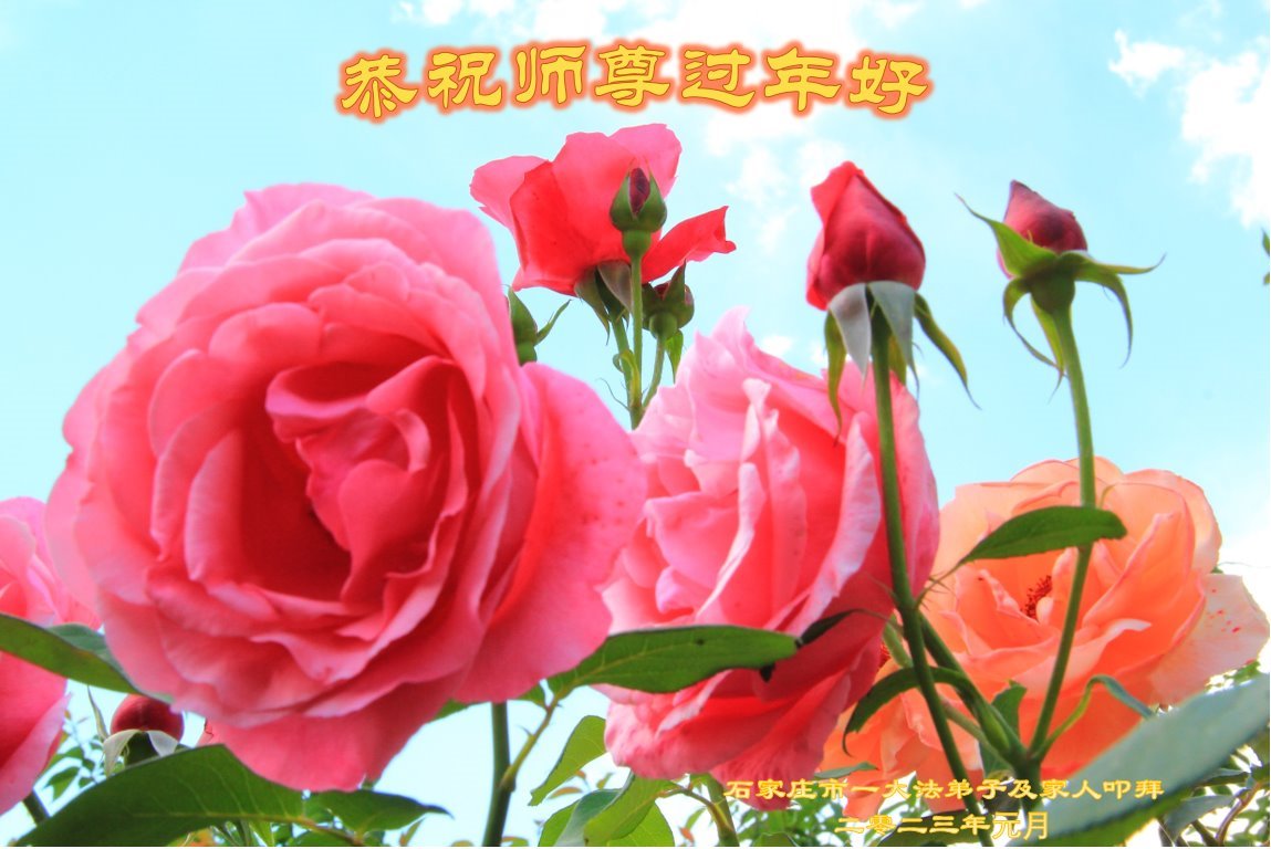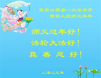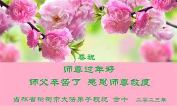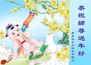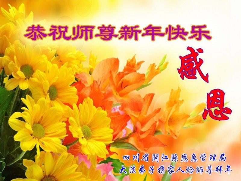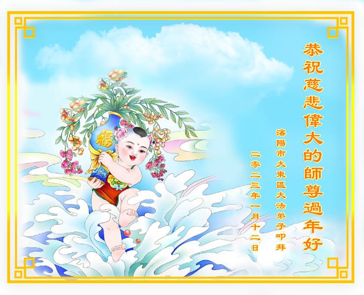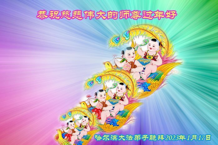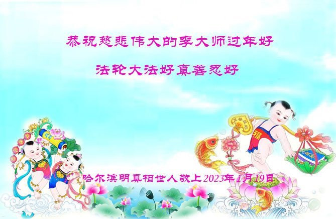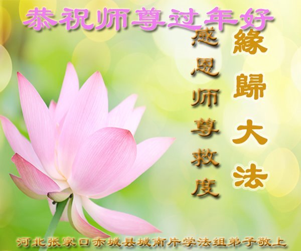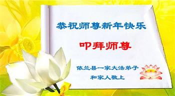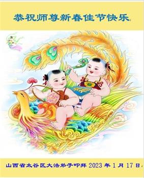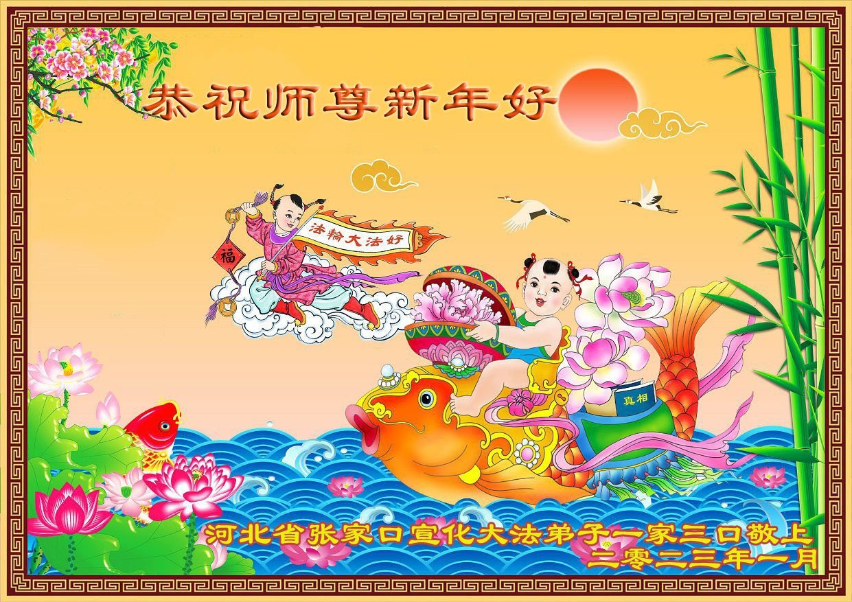 我是一九九六年得法修炼的老大法弟子,今年九十岁了,在二十多年跌跌撞撞的修炼中,虽很辛苦也很幸福,家人也见证了我一些遇难呈祥的神奇美好,都支持我修炼,四世同堂,母慈子孝,也使全家受益得福报。借此代表全家人恭祝师尊过年好!师尊辛苦了!谢谢师尊!